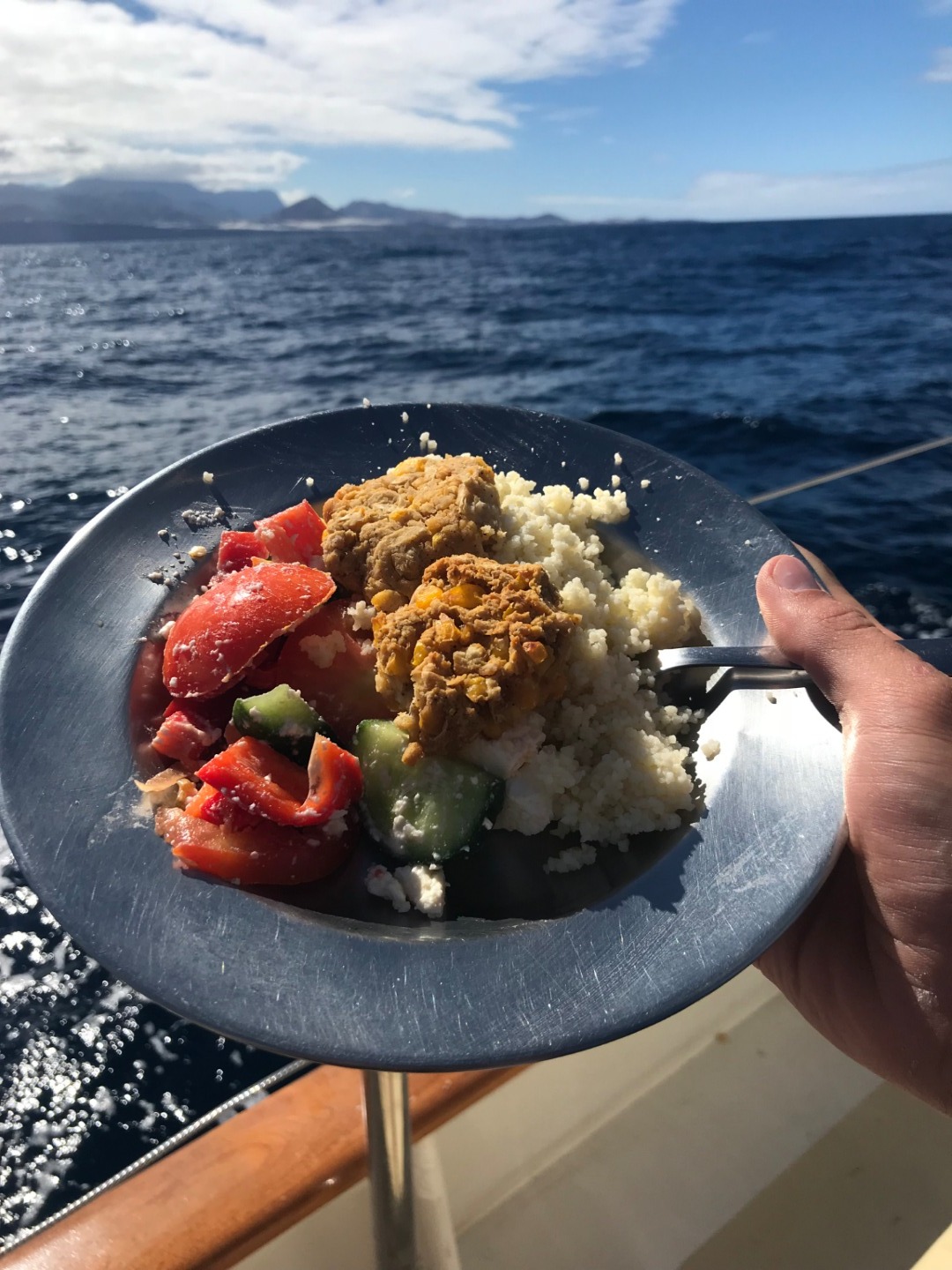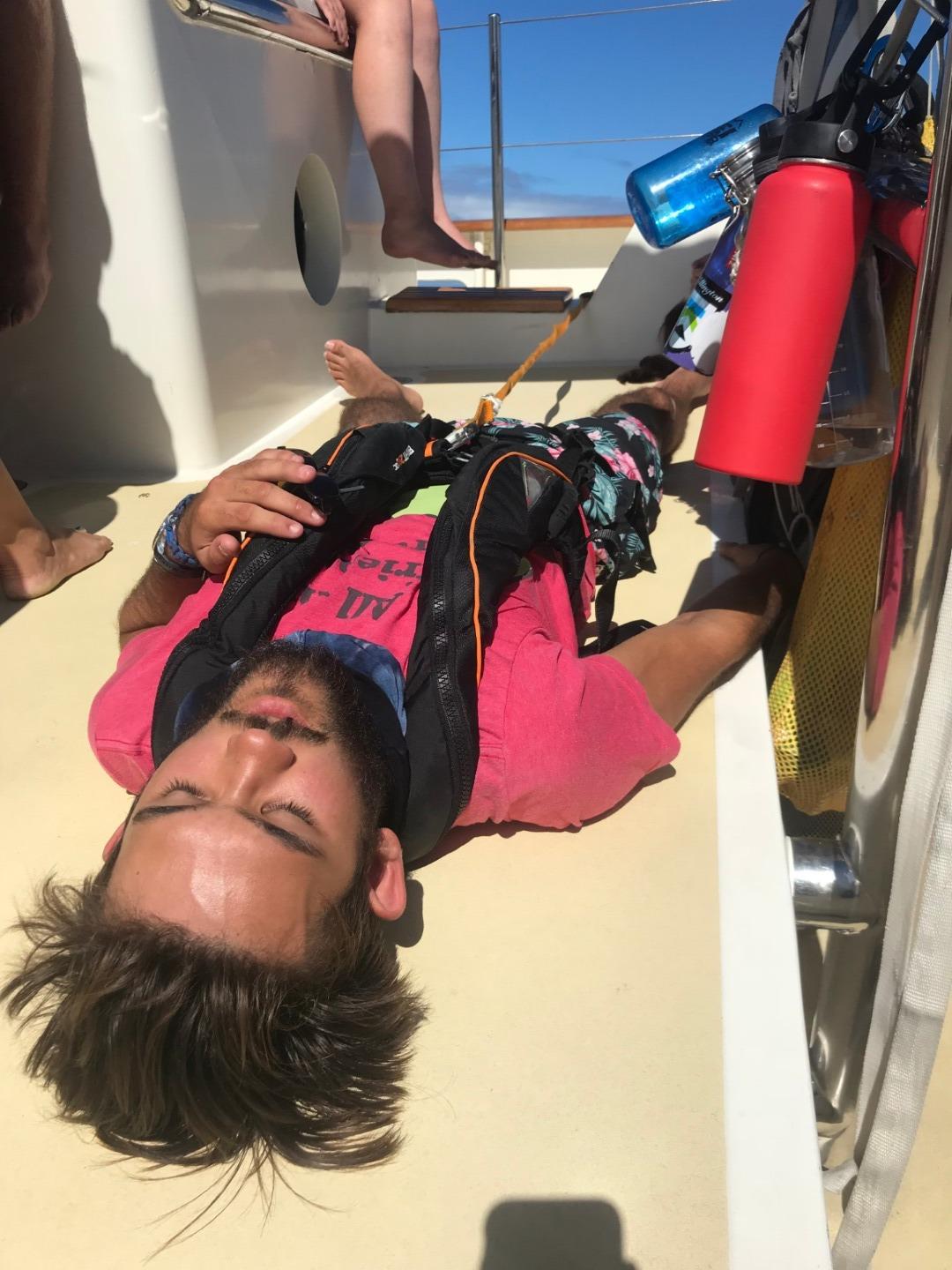 Pictured: Our delicious lunch of falafel nom noms prepared by head chef Ben; Oleg sleeping on deck during our passage; Dan fighting a war in the galley; a view of Tenerife as we approached the harbor; Watch Team 1 and a few others in the cockpit; Watch Team 3 being the best.