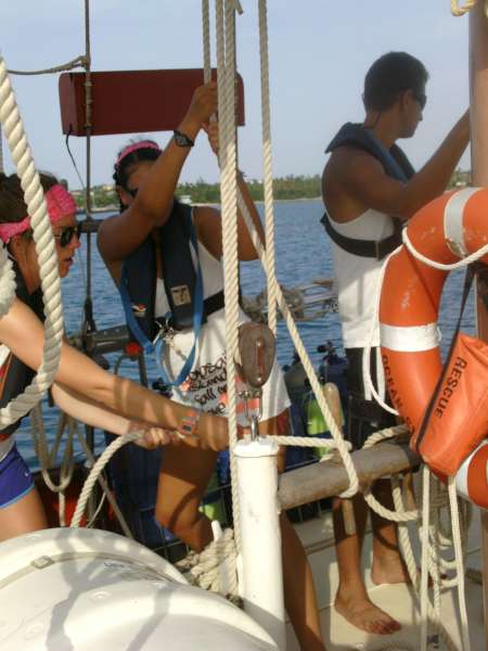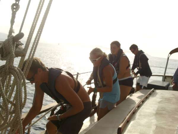 Everyone enjoyed the shore time by indulging in much-missed foods such as pizza or ice cream, shopping in the few stores, or checking in with home on the free wifi. We couldn’t stay onshore for long, however, because we had plenty to do back on Ocean Star to prepare for passage. Some of these things included removing sail covers, lashing down loose items, and inspecting the rigging. With Ocean Star ready for passage, we left Spanish Town and began to raise sails. We are currently underway to Nevis, both excited and nervous for our first overnight passage. Kevin prepared us for the hardships we might face but encouraged us that they would make us stronger sailors. We have all eagerly accepted the challenge!