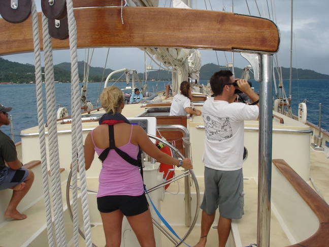 We woke up early to get a head start on the day sail to Bora Bora. The swell had finally given us a bit of a break so we could sail out of Huahine. Unfortunately, we were sailing on such a deep reach to the wind that we could not put up our sails, but we still had tons of fun motoring over and taking turns at the helm. We arrived in Bora Bora in the afternoon when the sun finally came out to greet us. We are all very excited to be in Bora Bora, to do more exploring, more diving, and the first night to shore. The rest of our crew will be joining us soon on our summer adventure.