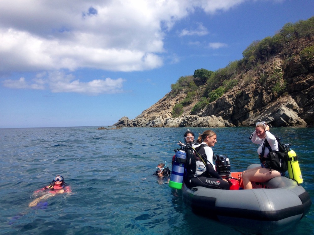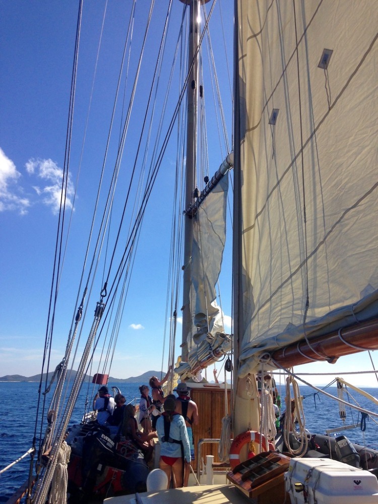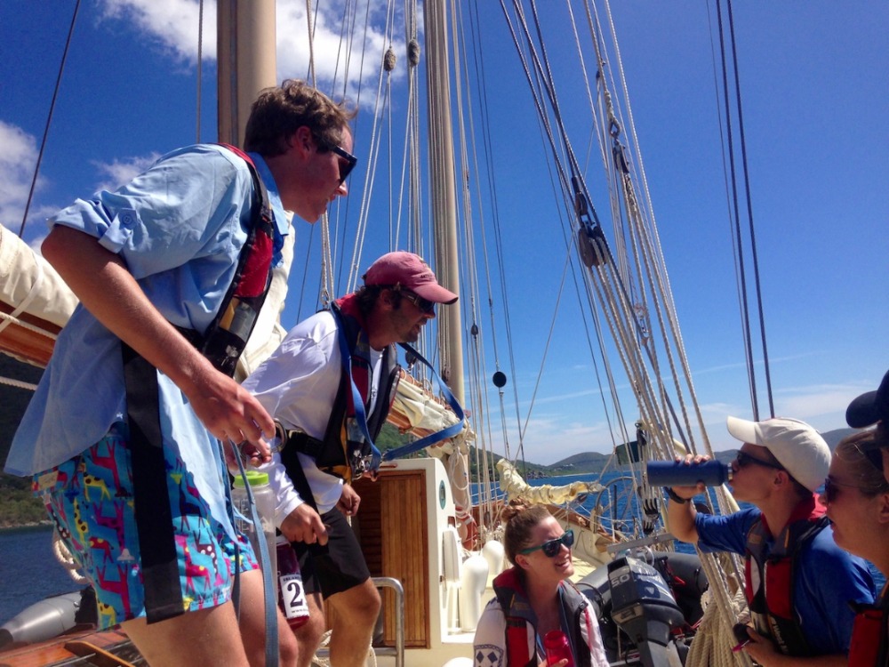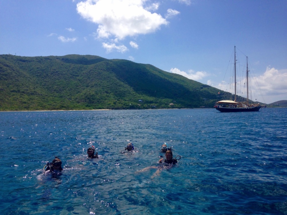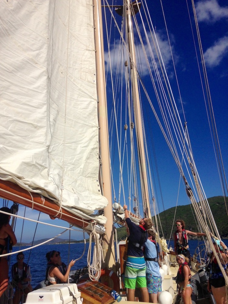 Today, after being woken up with our first fire drill and after a breakfast of muffins and fruit, we began another day under the Caribbean sun. After a morning dive at Mountain Point, we set a course for Gorda Sound. On the way, we raised three sails, including the foresail for the first time, and practiced a man overboard situation. Though the air was too light for us to travel without our propeller keeping us moving, the sight of a light breeze filling three huge sails on Ocean Star was satisfying for all. We anchored for the night, worn out but in high spirits.
