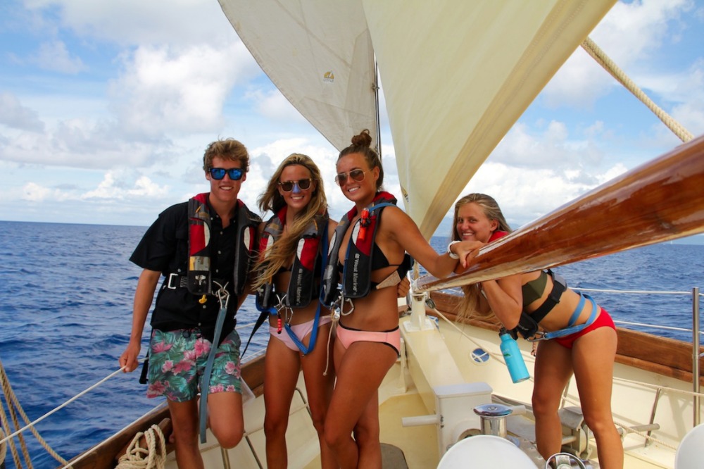 Today started off early with wake-ups at 6:30. We finished passage prep, quickly set five sails (Main to Flying Gib in under 19 minutes), then ate scrambled eggs and fresh bread baked made by head chef Aaron. Finishing breakfast, some of the girls presented a game called Clue; we all picked a name, a location, and a weapon from pieces of paper and had to ‘kill’ our person in that manner. Nick got the first kill with Joaquin in the head with toilet paper, but many others were ended as well (this game is becoming very serious)! Sailing was beautiful, and all of the watch teams – especially watch team one – had a great time hanging out together. One of the best parts of the day was definitely seeing a pod of about ten adorable dolphins swim along Ocean Star. Arriving in St. Lucia around 4 pm, we moored and took in the incredible view. Shower time was entertaining as several students did backflips and various funny dives, and someone even spotted a sea turtle. The night finished off with delicious fish tacos, a how-to presentation on how to play a hilarious game by Yi, an Irving Johnson movie (part two including Exy!), and warm brownies. We can’t wait for what is in store here in St. Lucia.