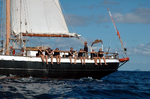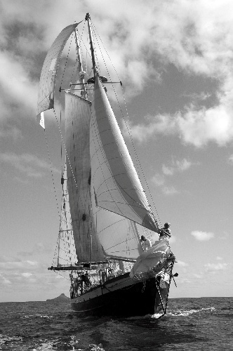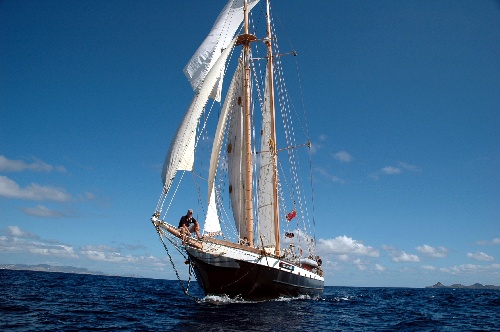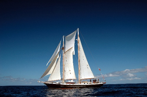 We departed Ile Forchue this morning at 0800 under sail. The crew turned to and performed immaculately. Not far out of the anchorage, we sighted mother and calf humpback whales, which we altered course to watch for a few moments. The breeze was light, 10-15 kts from the southeast, so we took advantage of the benign conditions and set the Fisherman Staysl and the Flying Jib, making a total of six sails set. Admiring the beauty of Ocean Star under full canvas from the deck alone was not enough. We launched our rescue dinghy, and our photographically talented crew members shot hundreds of shots of us and our vessel in all her glory. We arrived at our anchorage at 1500 and spent some time coiling down the deck and stowing thousands of square feet of canvas. By 1800, we were enjoying a well-deserved Mexican fiesta dinner.