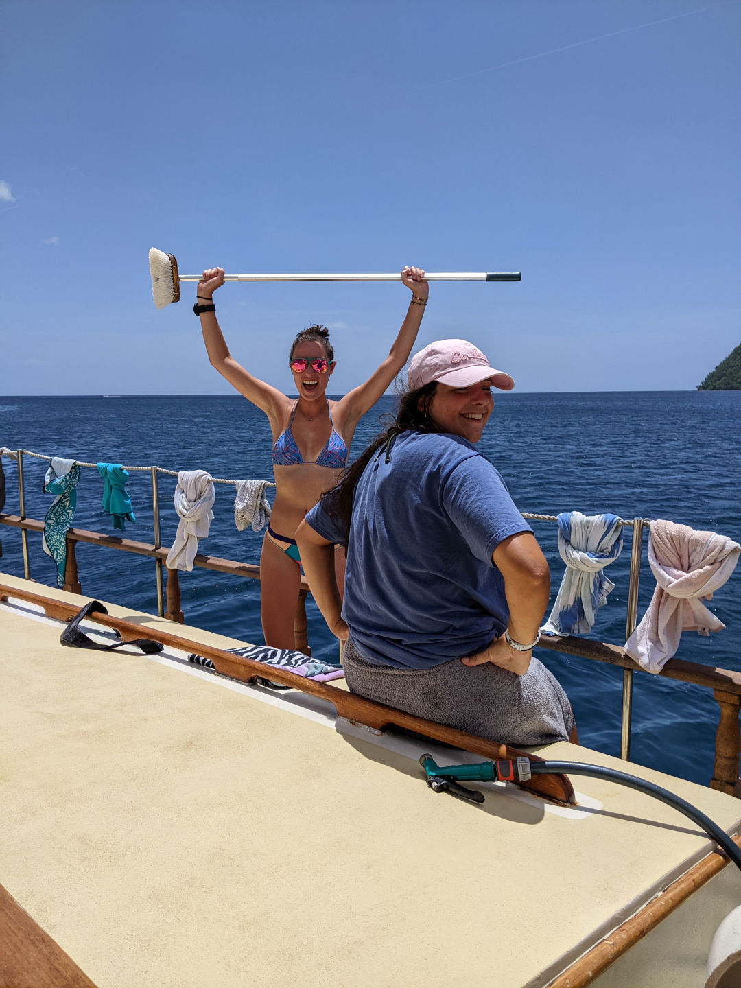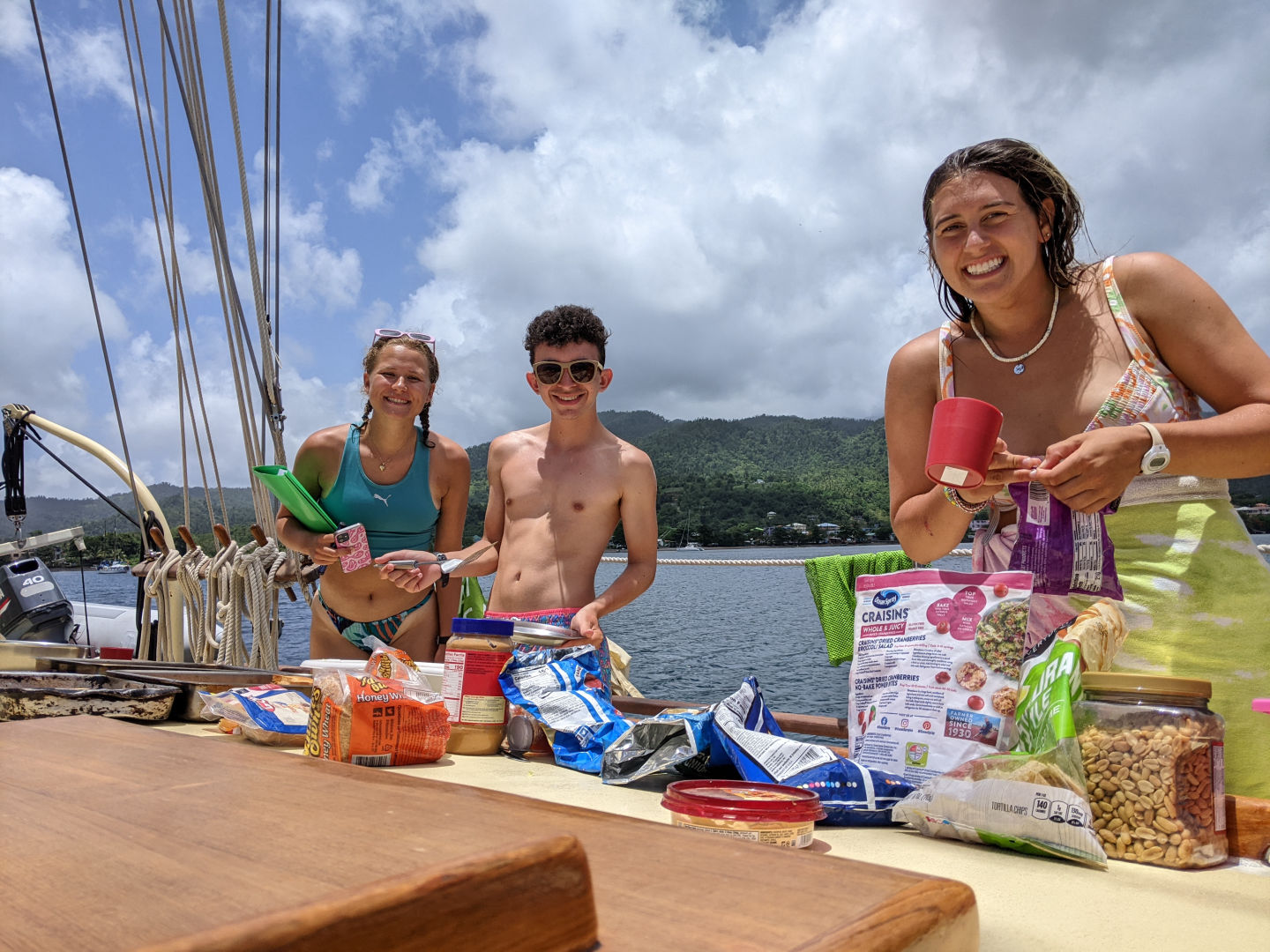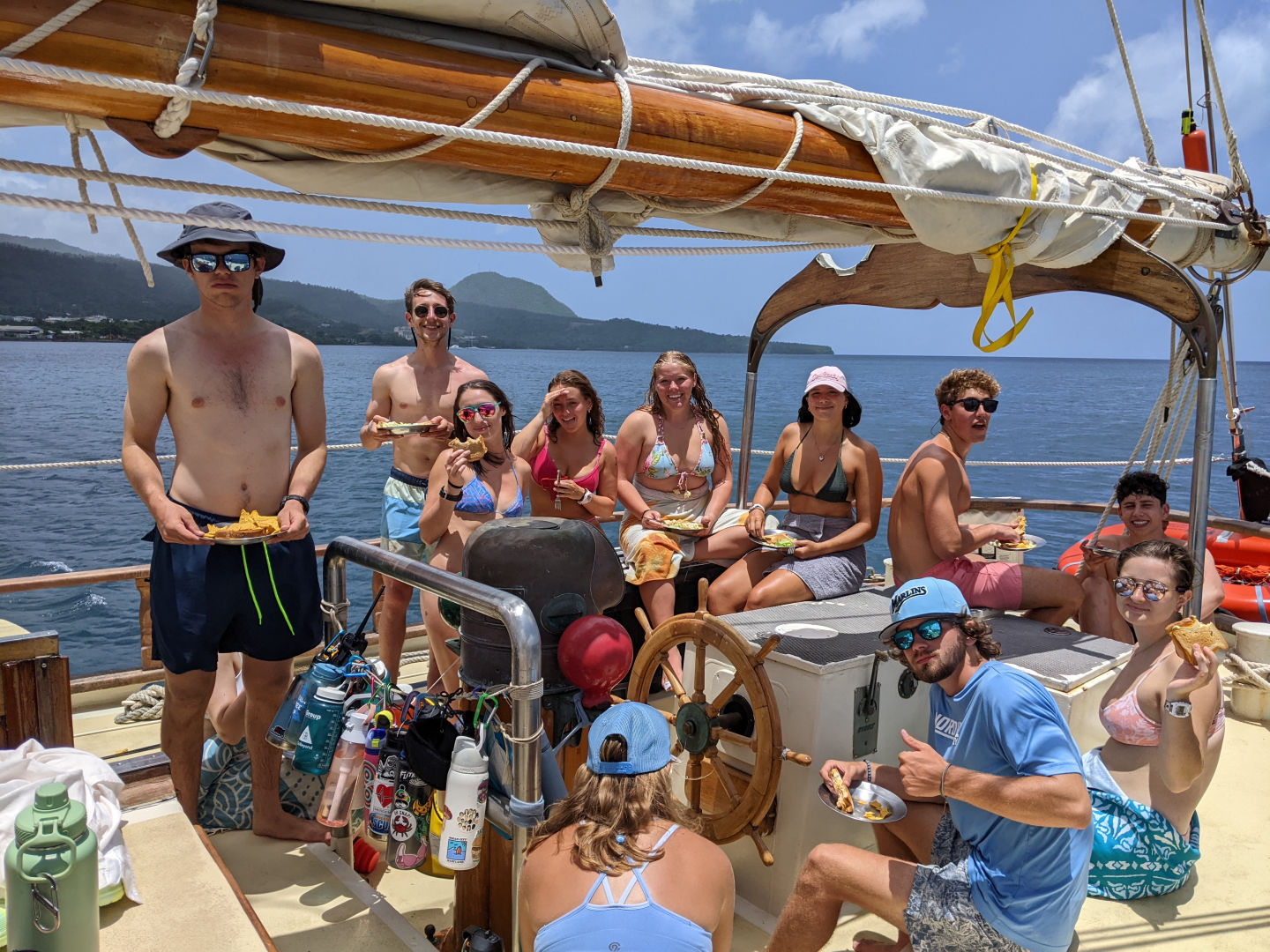 At 3 am, watch team 3 took over for the next 3 hours with their team made up of Grace, Declan, aka Deckie Mo Mo, Ginny, Sissy, AJ, Sam, and Meg being the watch team leaders. They were fortunate enough to experience a squall and run through their own sail-handling experience with the addition of some rain and more wind. Watch team 1, led by Nick, with Jake, Maris, Ari, Lauren, and Elodie taking over at 6 am. By 9 am, when watch team 2 was back on, Dominica was insight with Portsmouth, our new anchorage dead ahead. A team of us from all watch teams took down the sails and prepared the anchor to drop as we pulled into the large panoramic bay of the garden island of the Caribbean.