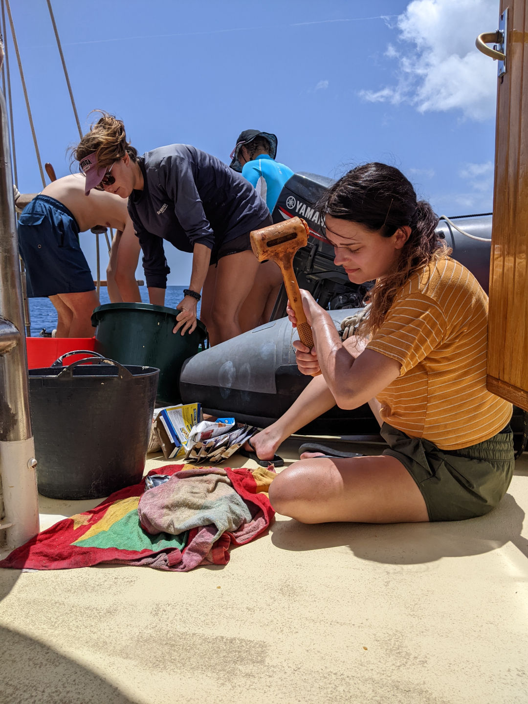 While a dinner of mashed potatoes, sausages. Veggies and gravy were prepared in the galley, and people on deck showered, swam, and got haircuts and shaved beards, so look out for the fresh cuts on Ginny and Ari in the coming blog photos. As I finish up writing this blog, the crew is interspersed throughout the boat, playing games, writing lit reviews, speaking with family, and sharing stories.