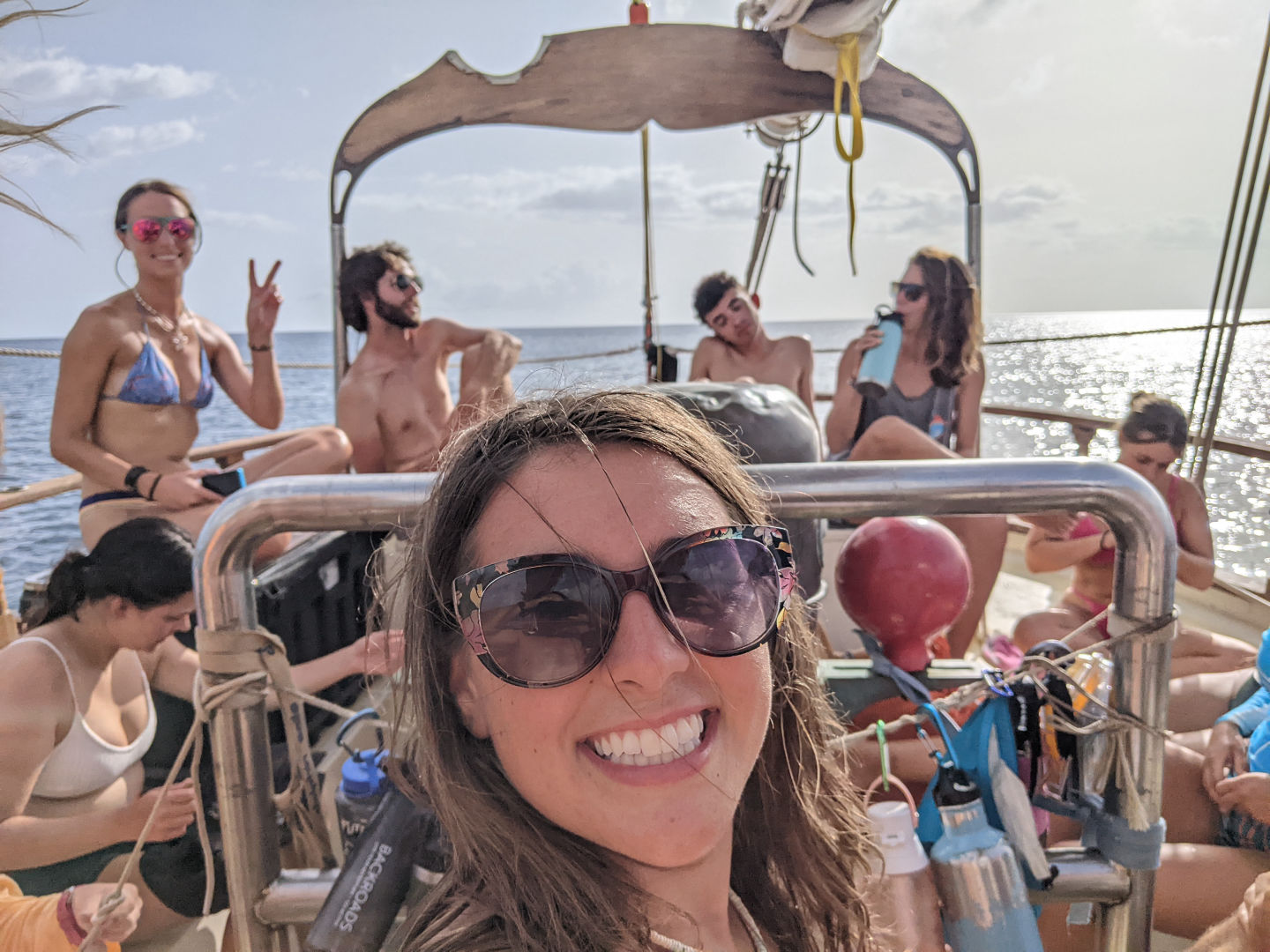 The rest of the morning was more relaxed, with some people choosing to sleep, others swimming and showering, reading and journaling, with Nick working away in the galley on some grilled cheeses for lunch. Once everyone was finished with lunch, clean up, and a quick swim before class, the crew gathered in the saloon down below for Oceanography, where they learned about gases and nutrients as well as trialing some of the science equipment on board so that groups can start to figure out what they plan to cover for their research projects.