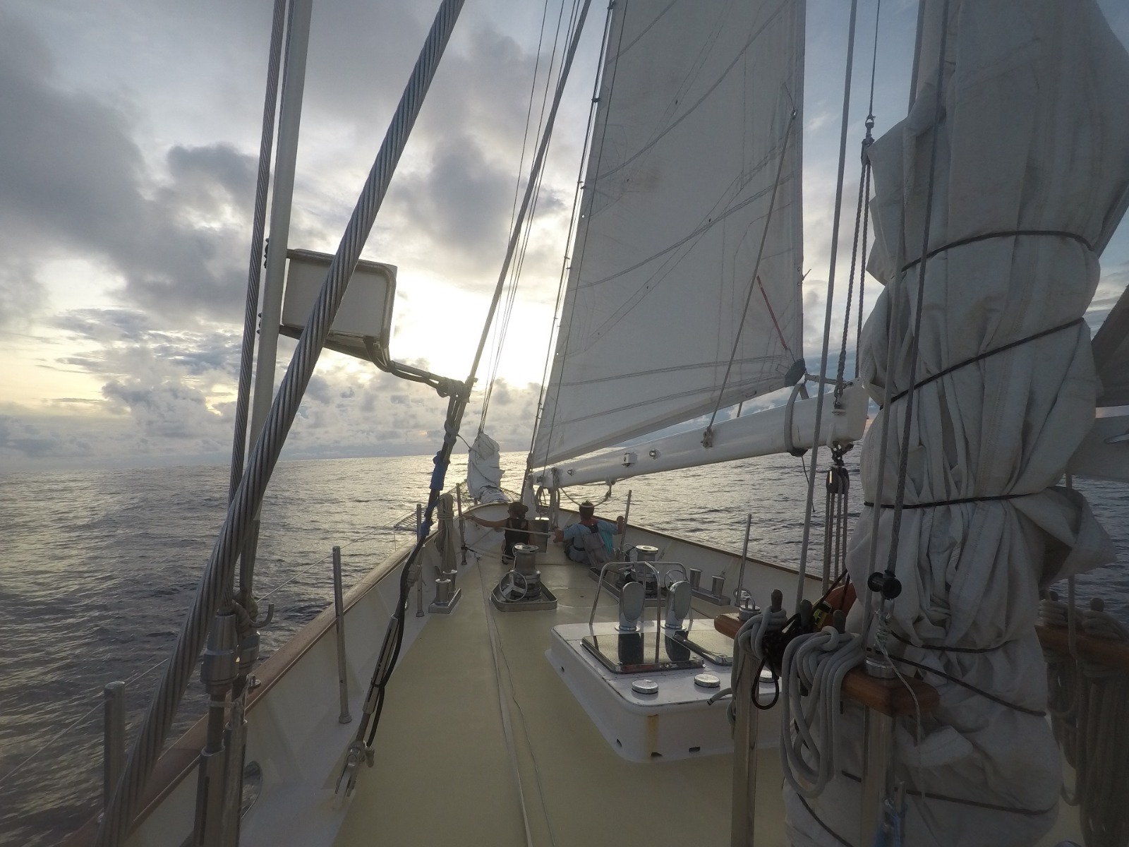 The rest of the day passed without incident as we sailed along in light winds shaded by the clouds. We’ve been learning about the wind, waves, and currents in Oceanography lately, and it’s been neat to be able to apply our newfound knowledge to the weather and water literally surrounding us. Everyone aboard remains in good health and high spirits! The crew has an overall feeling of anticipation, waiting for the feel of twenty days spent at sea to hit home.