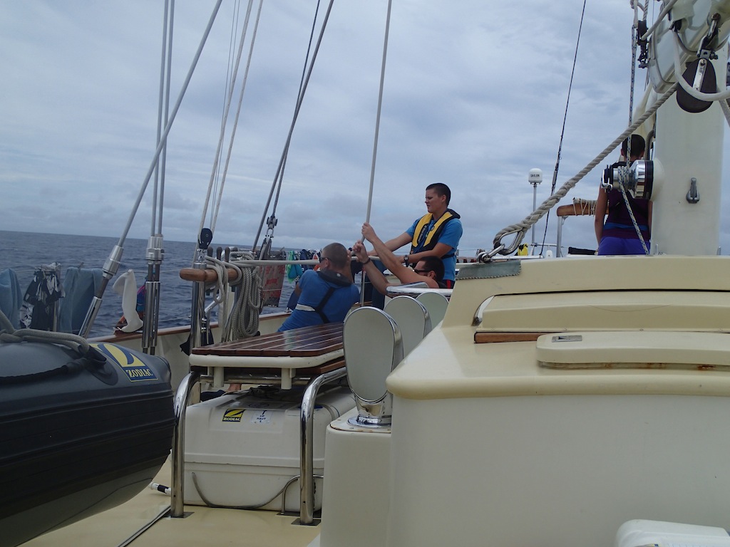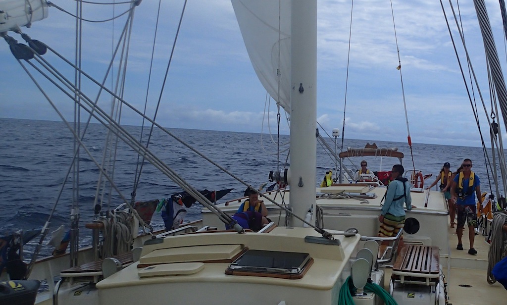 Today was the end of the engine in the best way possible. Just before lunch, we got more sails up and started using the wind instead of the diesel to get us where we were going. After motoring through the Doldrums, it was nice to make it to the edge of the trade winds and start heading toward the Marquesas instead of the south. With everything except the flying jib up, we were making about 8.5 knots and made it up to 11 this evening before the wind calmed down a bit. With the forecast set to continue pretty much the same, we are looking forward to some nice, quiet days and night sailing as we slowly eat up the 2500 nm that we still have to go to land.