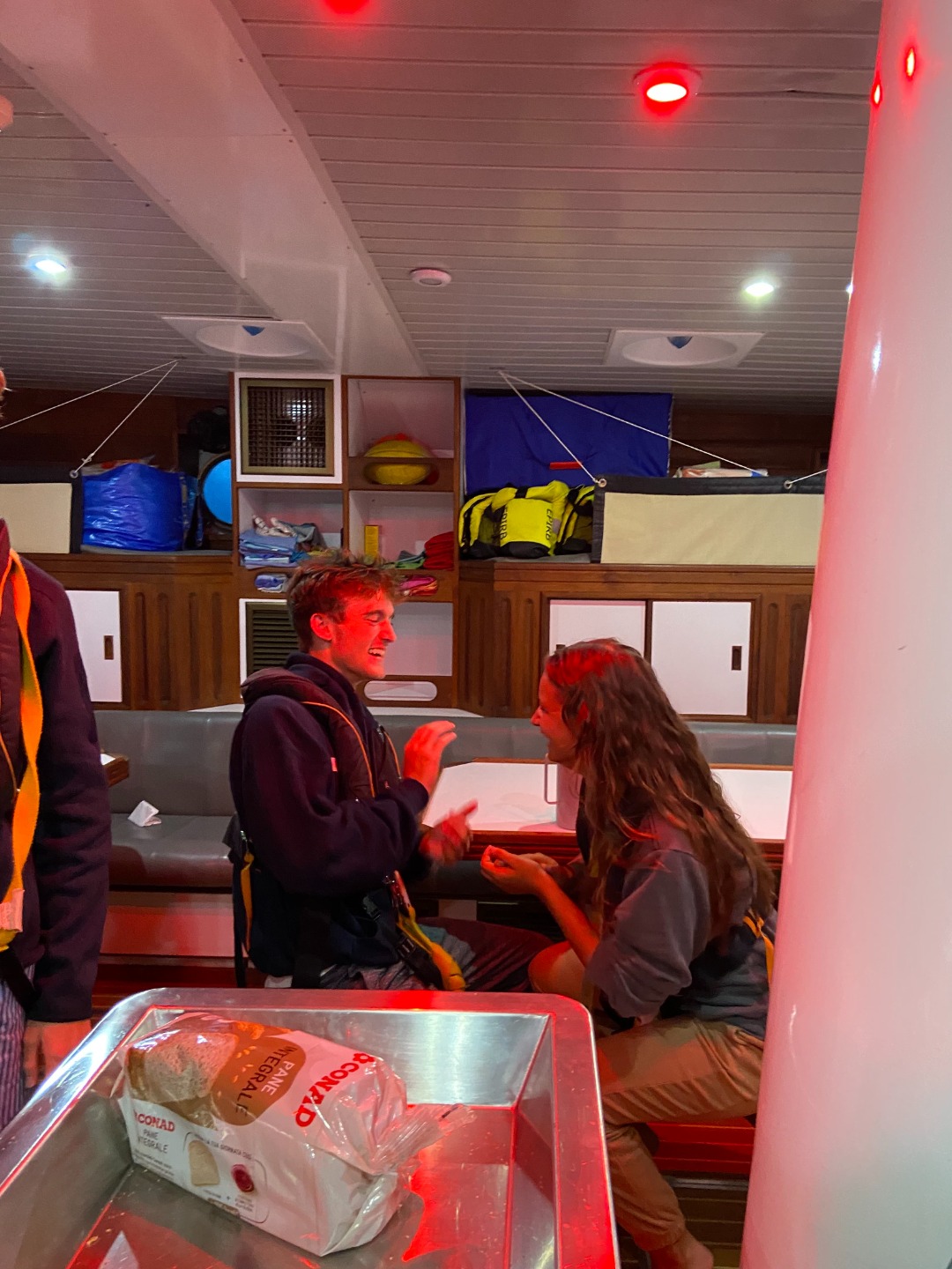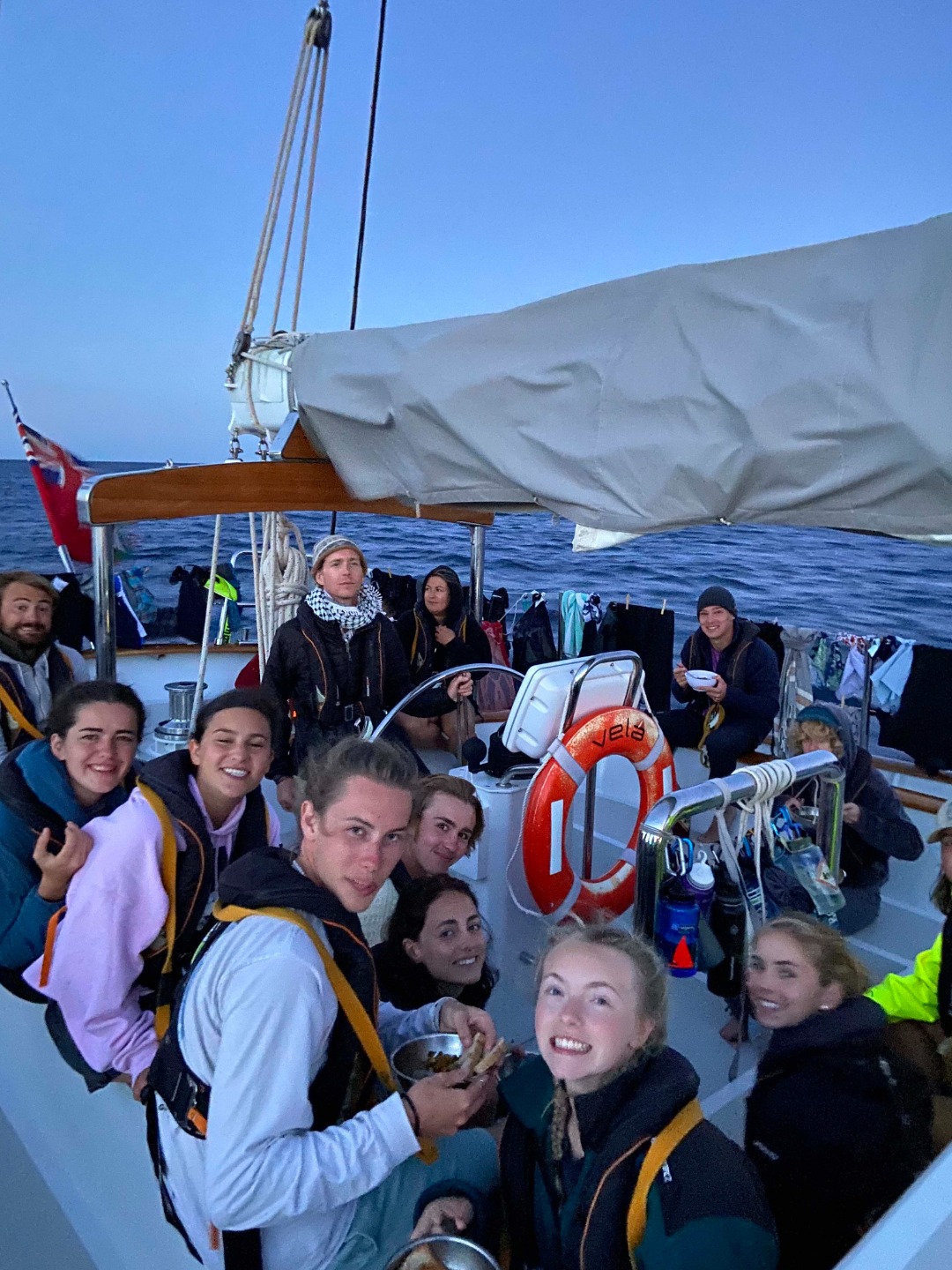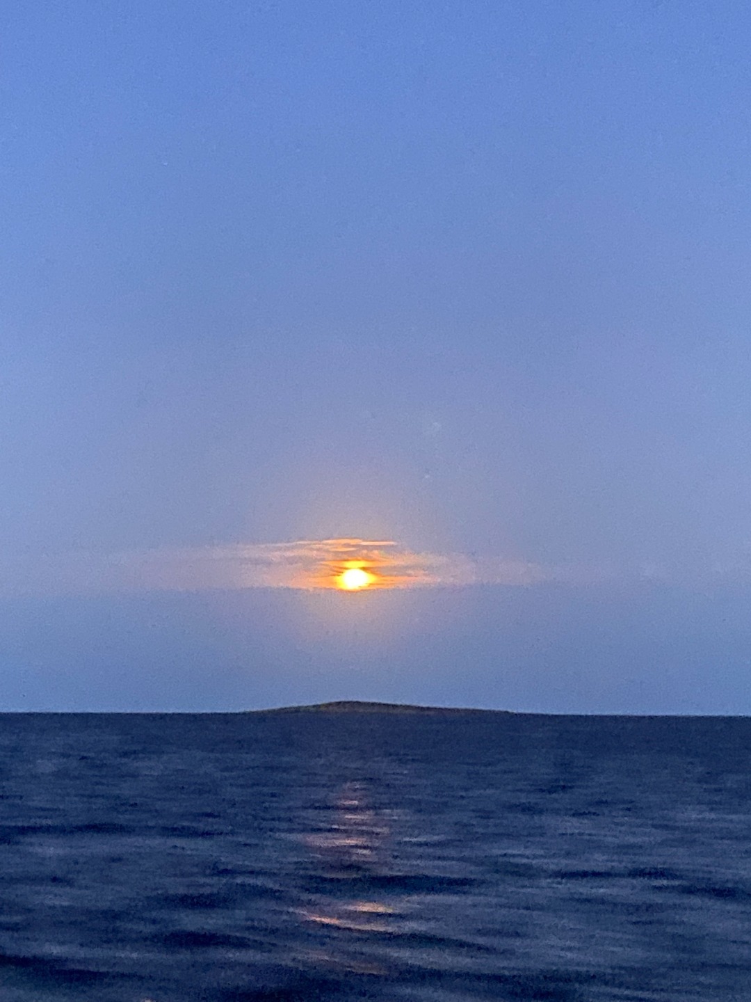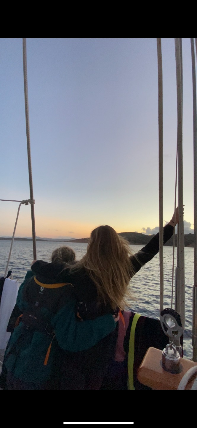 Our morning started with cereal in the cockpit complemented by the pink morning sky. Breakfast was plated (or should I say bowled) below deck due to the fact that the sporadic gusts of wind had proven too treacherous for serving outdoors. We then were separated into groups to begin divingone group for the morning and the other after lunch. Preparing for the first dive was a lengthy and tedious task. Although, attitudes were bright and filled with the excitement of trying something new. After learning how to assemble our dive pack, a process that consisted of attaching various tubes and fastening several straps, the first group donned their scuba apparel and climbed into the dinghies. A brief ride brought us close to steep rock cliffs, where a golden beach emerged. We anchored and flipped into the deep blue water. It took a minute to acclimate to the weight of the packs. Shortly after, we began to conduct a series of tests. These included clearing water from the mask, removing and reapplying the mask, breathing without the mask, purging the respirator, and buddy breathing. While participating in the dive, we were accompanied by slender silverfish, spiny starfish, and an abundance of sea slugs. The sea slugs were quickly befriended and named. During downtime, when not diving, students occupied themselves with laundry, reading, bracelet making, and a myriad of other games. In order to conserve water, we adopted a new way of showering: jumping off the boat into the salty water then climbing out, applying soap and shampoo, rinsing in the ocean again, and finally a speedy rinse under the freshwater hosethe group reunited for dinner which consisted of lentil soup, bread, and last night’s leftovers. We reflected on our day as our captain Freddie relocated us two hours from the initial spot. We shared laughs and basked in the cool breeze as the full golden moon rose over the water. Gratitude seeps from every member of the crew. We are so lucky to partake in this experience.