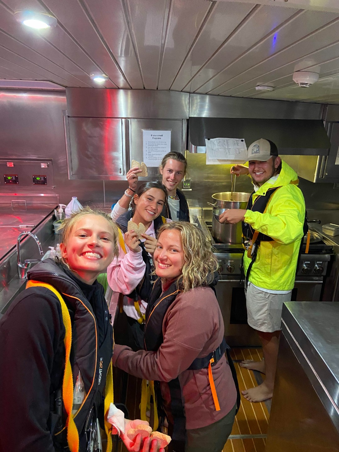 Photo 1 Dinner in the galley. L2R Sav, Liz, Dani, Tyler, and Bubba