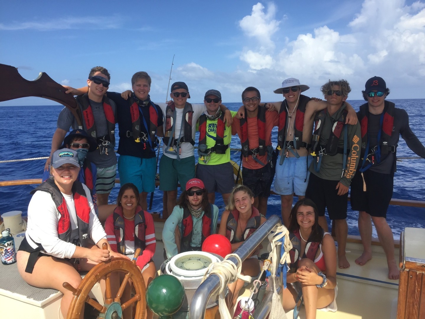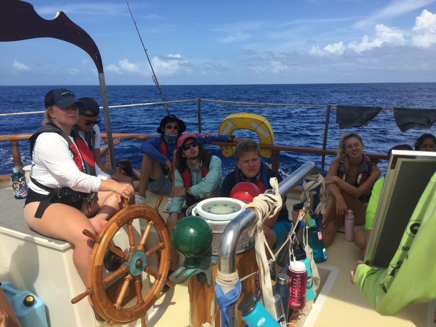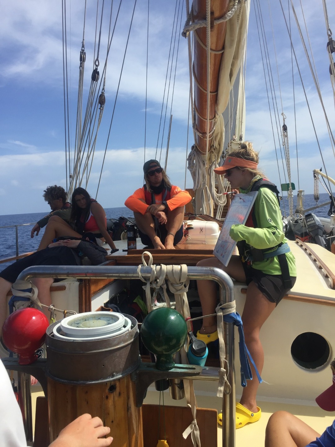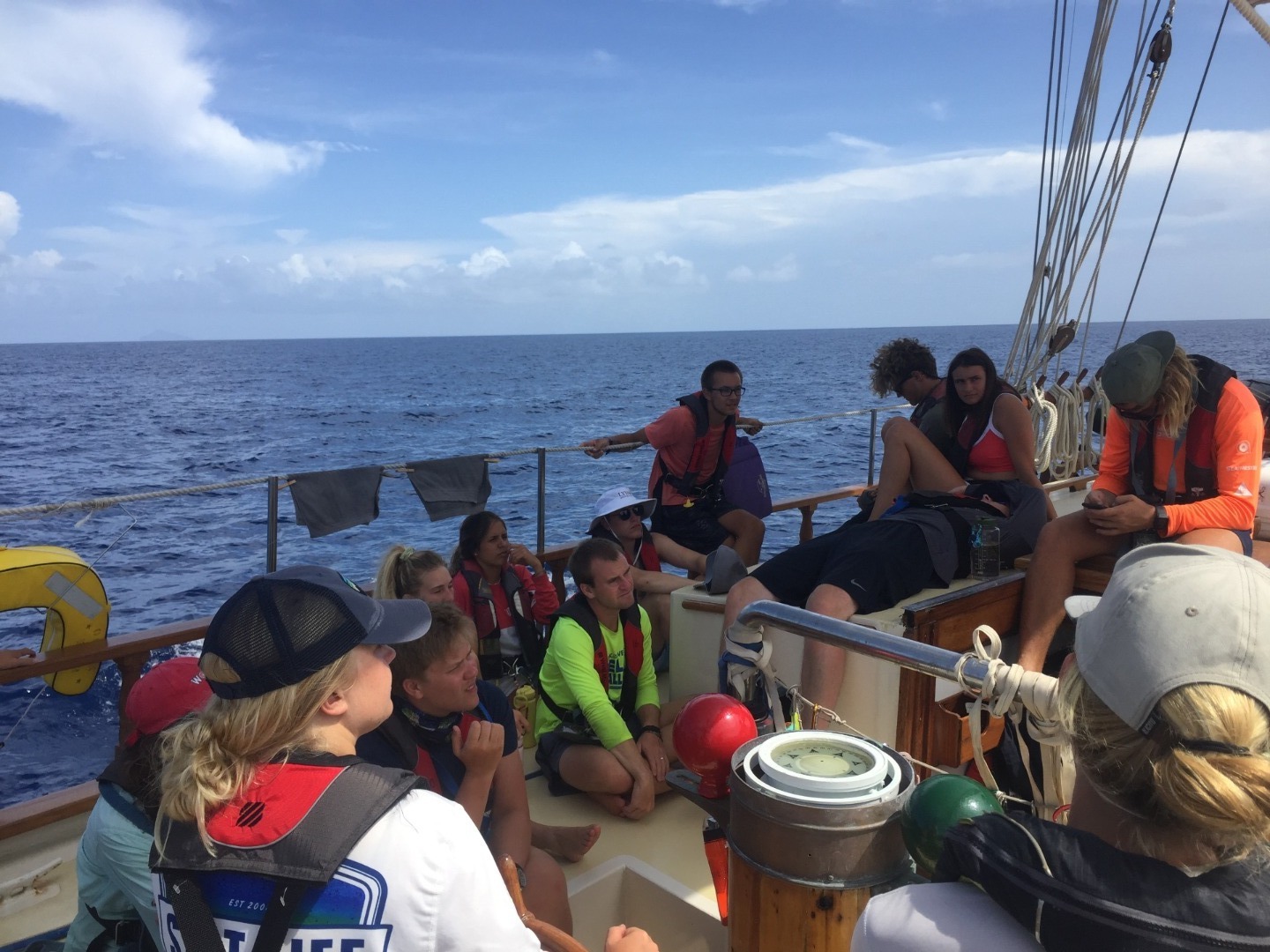 The seas are calm, and we’ve enjoyed a sunny and clear afternoon, a gorgeous sunset, and now some bright moon and stars. We are moving into overnight watches now, after dinner, and our nightly Squeeze. Tonight’s Squeeze question was to tell something that you’ve learned about the person on your left. In just two weeks, we’ve gotten to know each other well, and we look forward to getting to know each other even better- especially during our overnight watches together in small groups. For now, my watch team (Watch Team 2 with Amy, Eli, Steffen, Jill, and Josh) is about to take the deck for the 2000-2300 shift. We all get to sleep peacefully while the other watch teams keep the boat safe throughout the night. Next stop, Grenada!