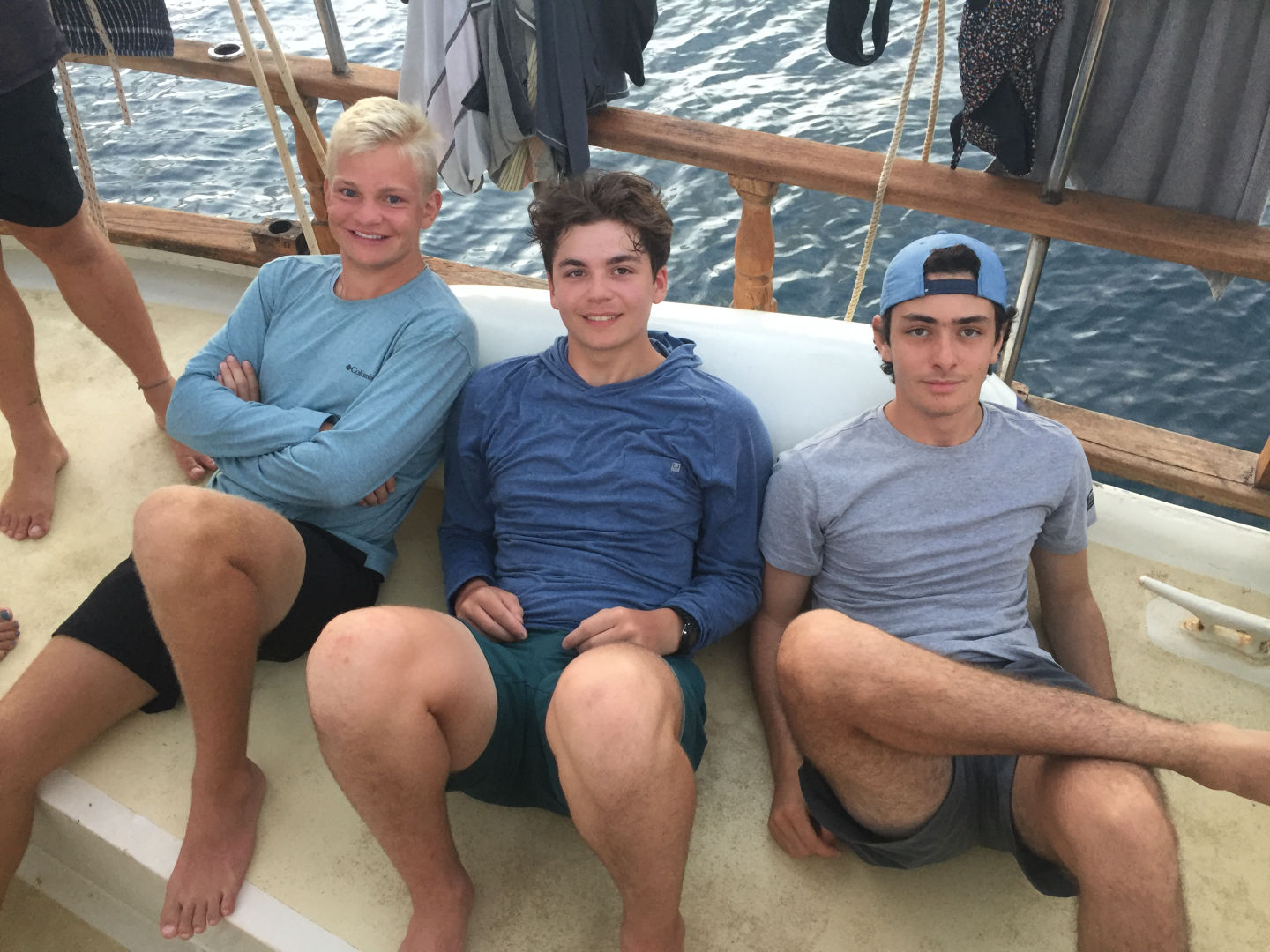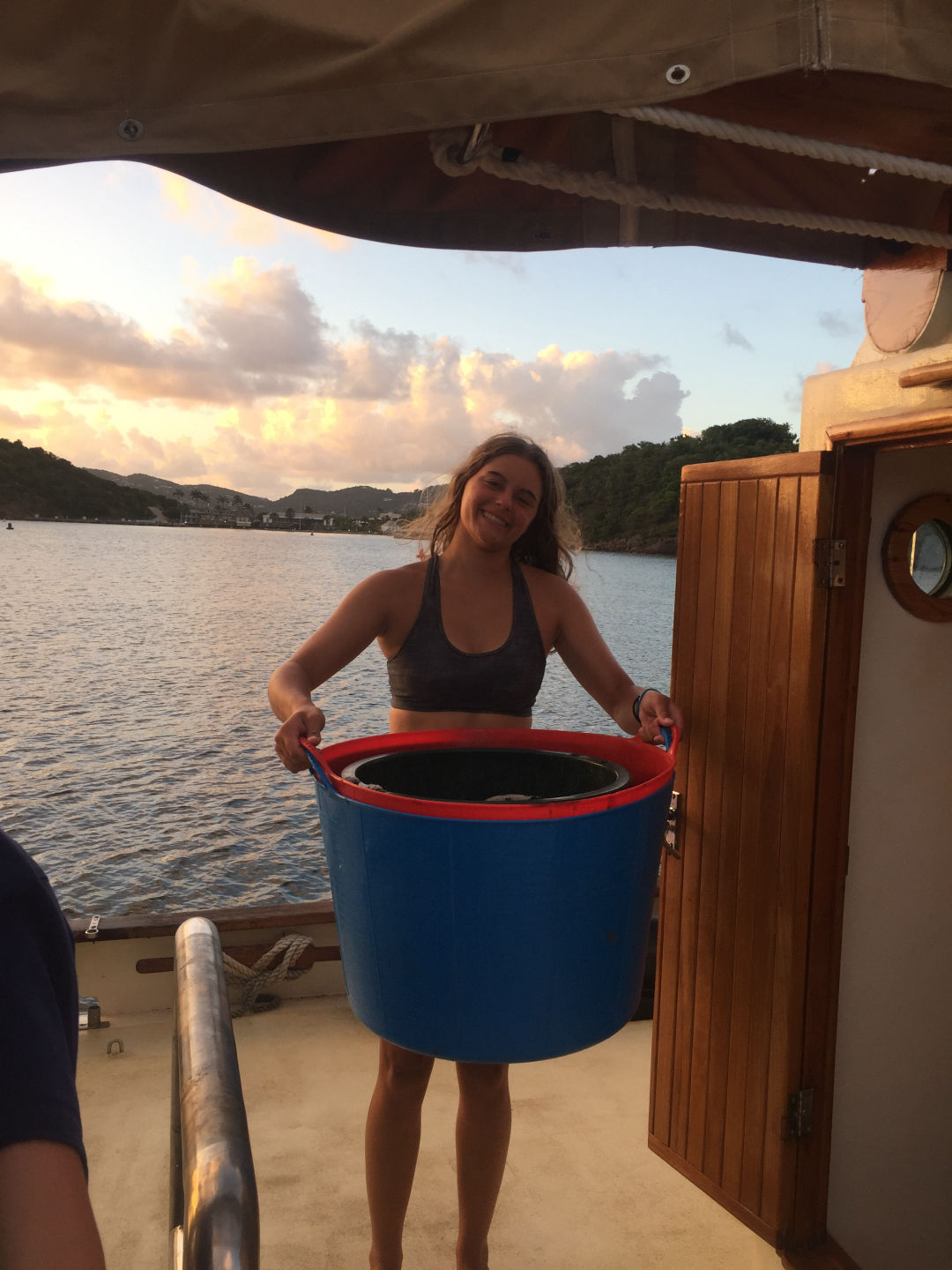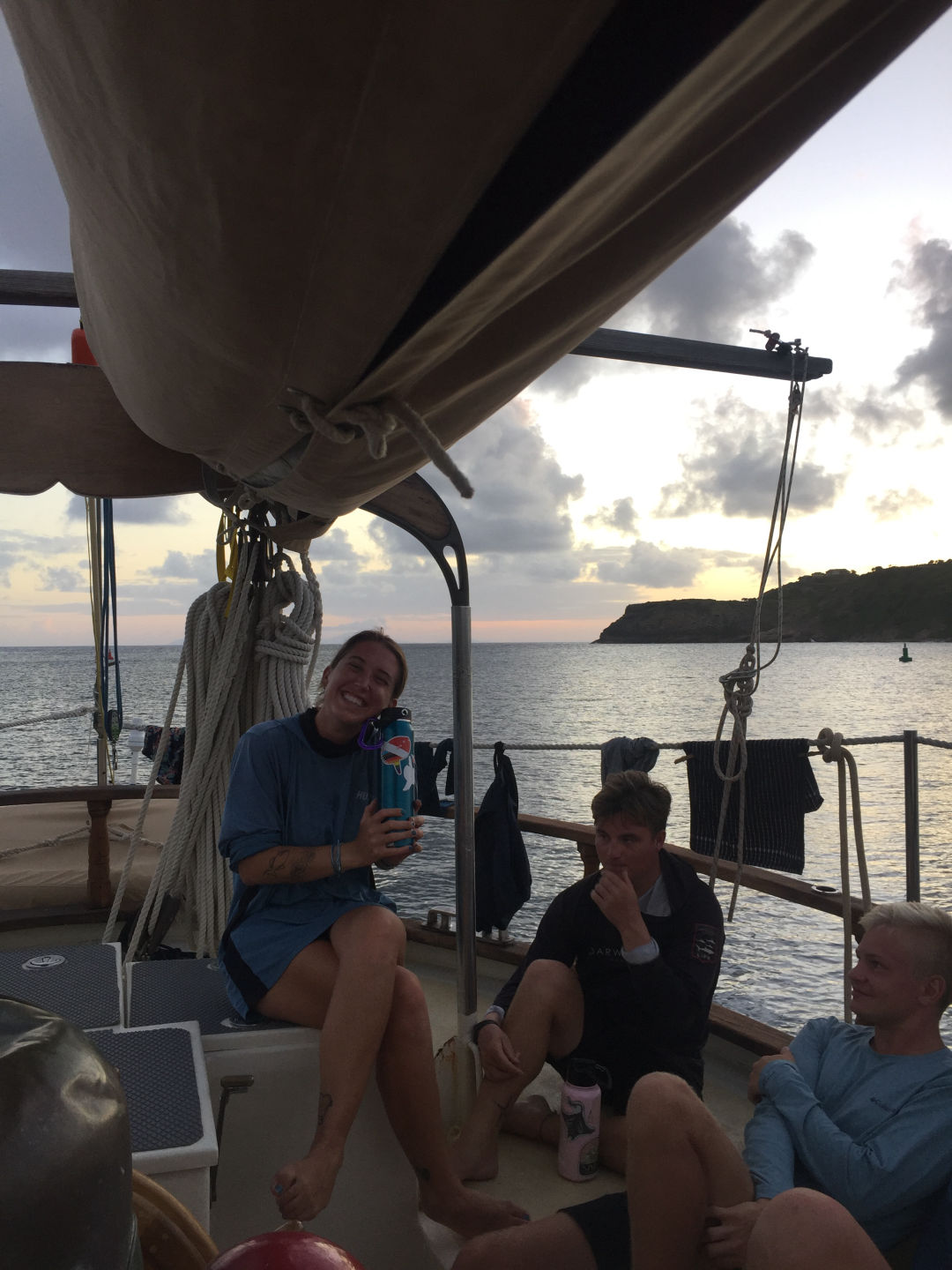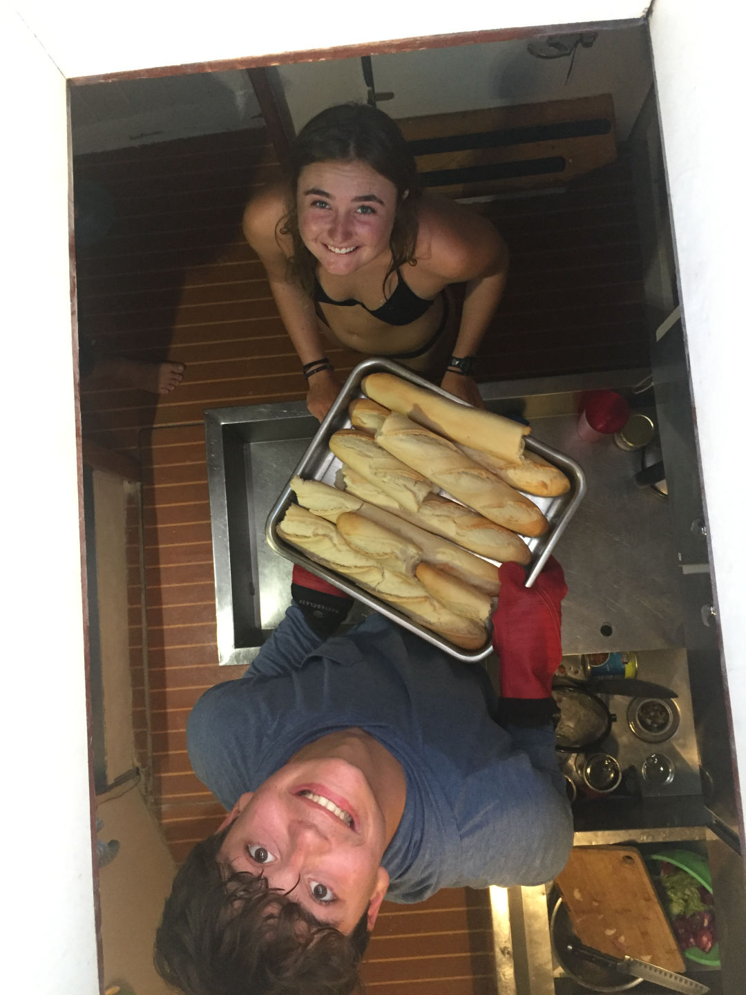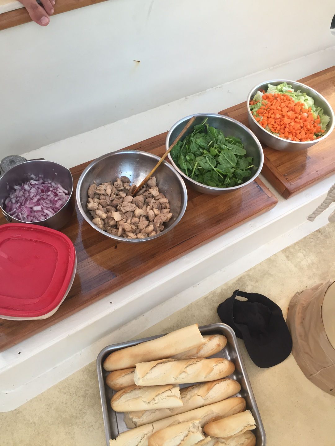 Our wonderful chef Ally and her sous chefs Drew and Max prepared a Chicken Caesar salad with baguettes and lentils for dinner. All of the dishes today were absolutely delicious. At this point, I want to give a huge shoutout to Heather for getting all of the food we need to provision for the next couple of weeks. Heaving up the food into the kitchen from the dingy was a great load of fun and proved that we’ve already got that teamwork thing going pretty well.