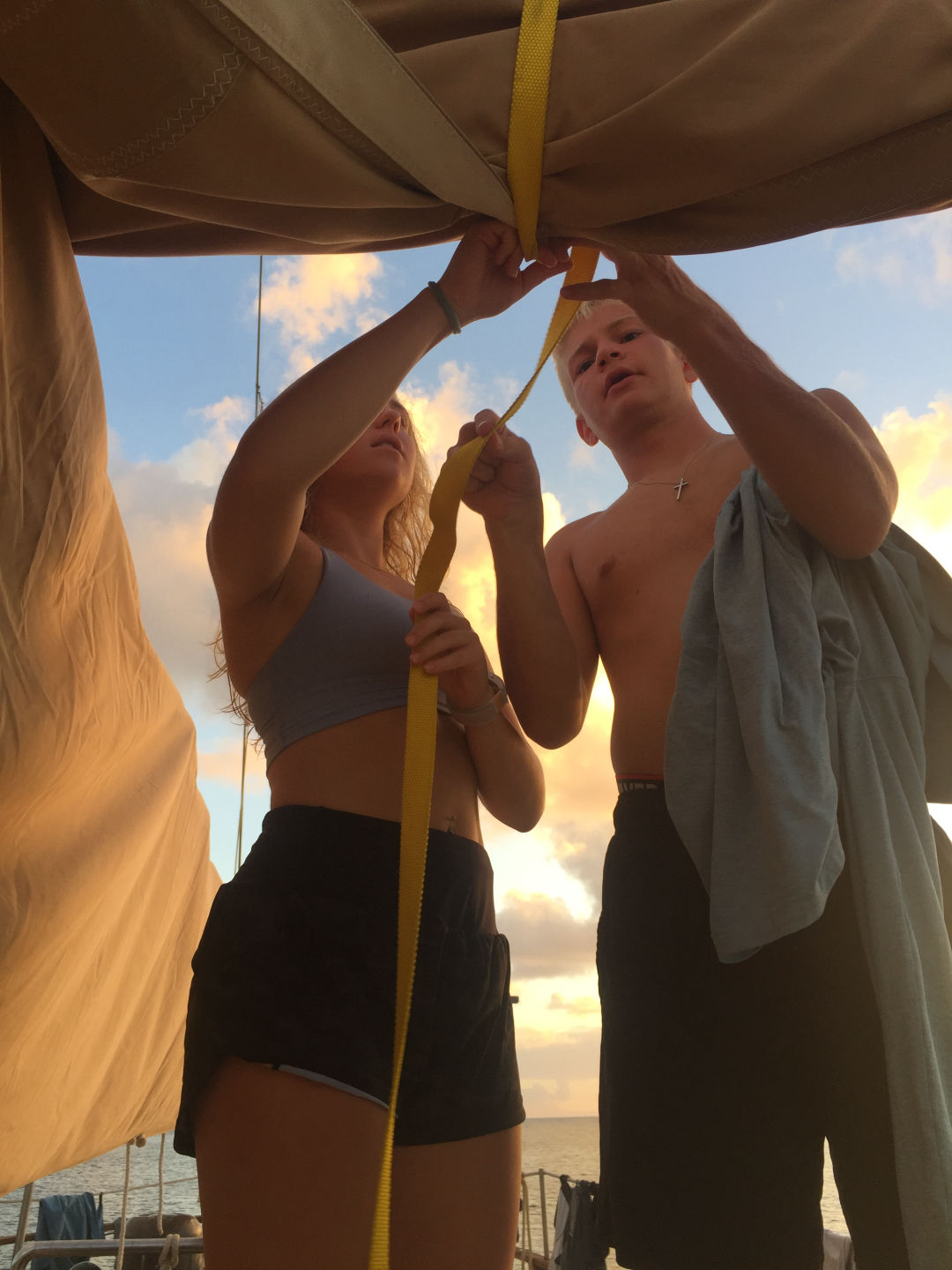 Today started off with some lovely bagels at brekkie to power us up for later getting the sails up for the first time with Drew. We also learned how to get around the many lines (ropes) on the boat and the art of tying sailor’s knots with Drew, Meghan, and Freddie.