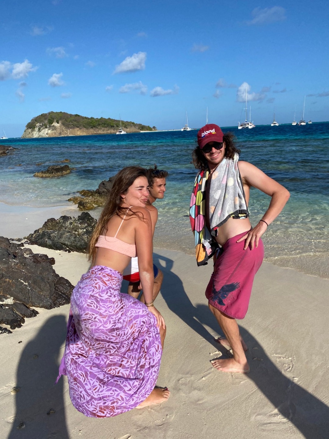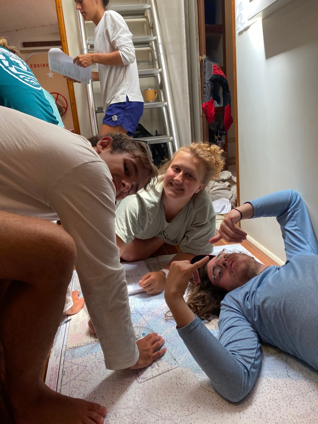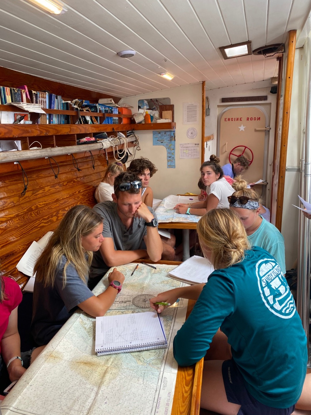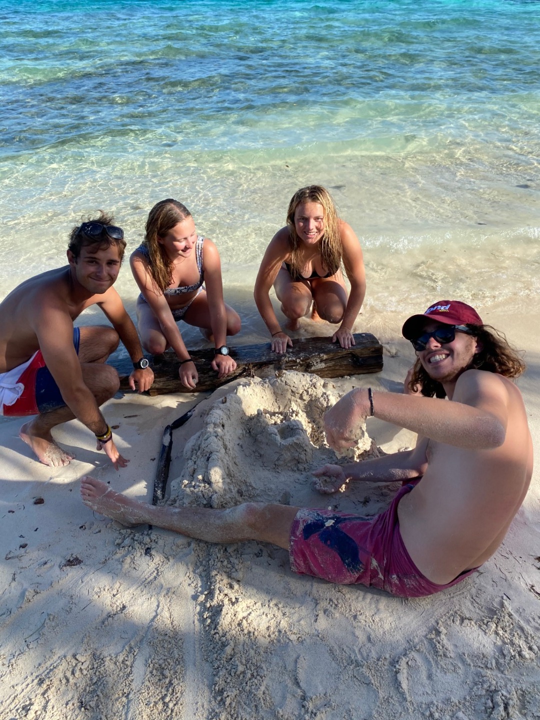 Today started off a little slower than normal. Most everyone needed a second reminder to get up and ready from breakfast, which I gave, after a breakfast of cereal and oatmeal. We began to plan the upcoming week. We organized tests and talked about when we wanted each class. Then the day began with our group therapy or what we call it leadership class. We talked about the different ways people communicate and how we communicate ourselves. As we began our next class of Oceanography, we could smell the yummy bread cooking in the oven, which was a huge hit at lunch. Then we hit the charts, and the confusion began. After an hour or so of practice, we got it down. Three classes basically in a row drained some of, and we went over to a little island for a swim and explored. But it turned into an extreme building of sandcastles where Gus became extremely passionate about the success of our sandcastles vs. the waves. ( I think the walls were bigger than the castle). Then after a run up the beach, and a few Instagram photos were taken, the exploring began. We walked around and found a fun swing. When we were back on board, we began to take showers and get ready for dinner and the end of the day. At dinner, we all shared our favorite summertime past time growing up. Tonight we will learn about how the stars came to be from Lolo’s star story.