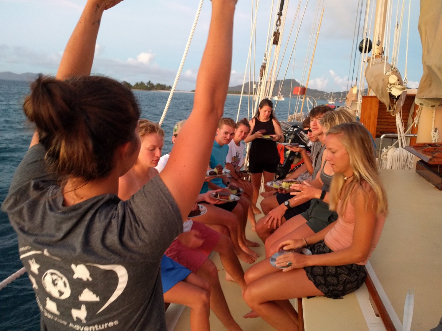 Today began like most, 7 am wake up, breakfast, and then took a turn to possibly the best day yet from Wiggy. I played toss for what felt like an hour to dodgeball: UK edition (something with a circle), to swimming to Sand island from the boat (500 yards) because Wiggy told us to, to Kelsay getting a new algae necklace. Great day. We all probably spent 3 hours, which felt like six on Sand Island, which can’t be longer than the swim there and about as wide as Ocean star. All around best day, oh and to top it all off we got a nice plate tectonics lesson before our actual lesson which consisted of brownies as oceanic plates and cakes as continental plates which we ate while the sunset was straight out of a movie, and tonight is a full moon, so there’ll be something to look at during my 0300-0400 watch tonight. I’ll leave you with a Drake quote: “I only love my bed and my momma. I’m sorry.”