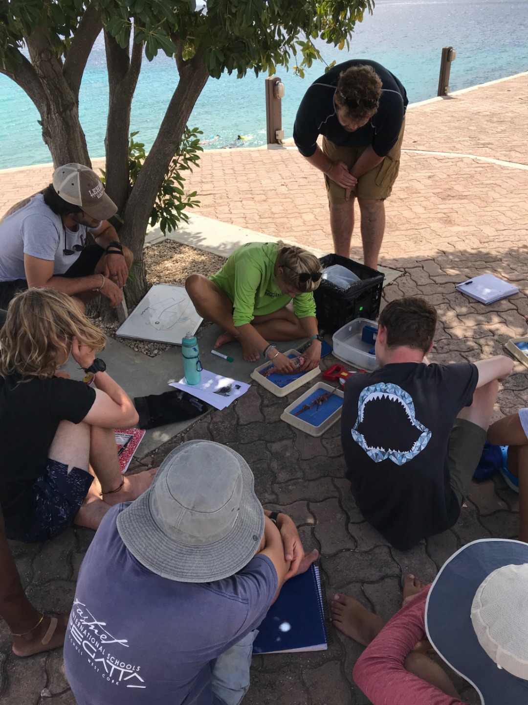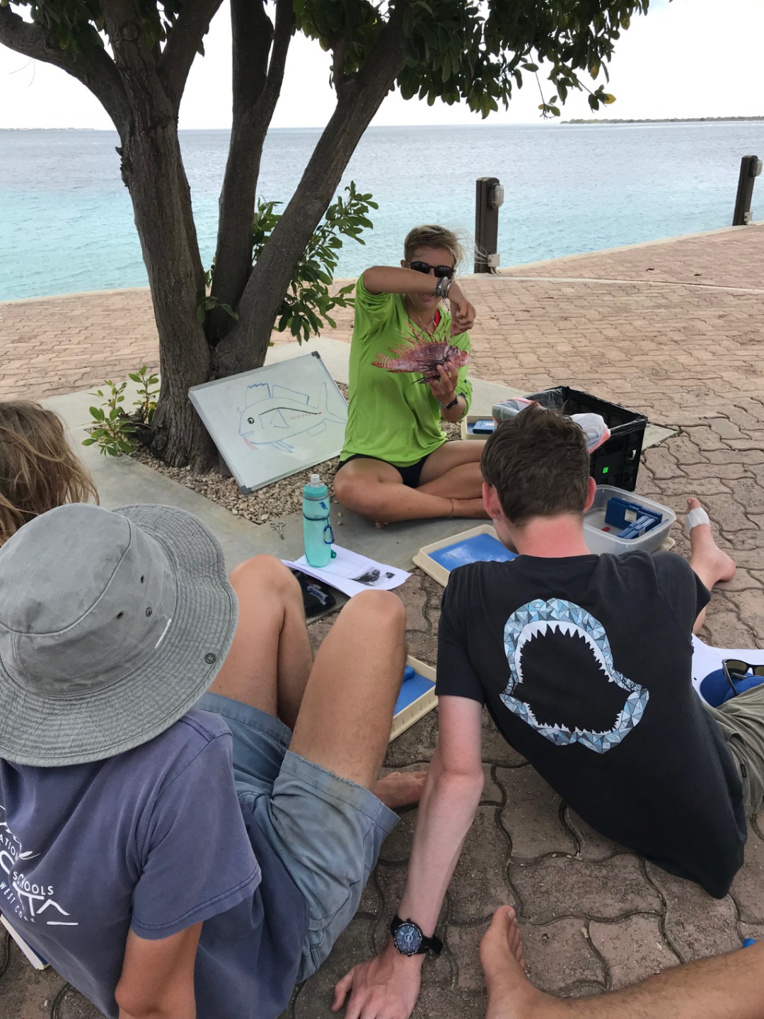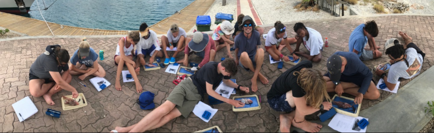 As very conservation-minded, a lionfish dissection was a perfect win-win, with being able to give a hands-on, interactive class as well as doing to reef a favor. Lionfish are not native to the Caribbean and are an invasive species that has a huge negative impact on the reef ecosystem and also further afield to commercial fisheries catch. This species does not have any natural predators here, and as the invasion is relatively recent in ecological terms, many native species have not evolved into seeing them as predators. To conquer this, Bonaire encourages the hunting of lionfish for certified individuals using an ELF (eradicating lionfish tool). The hunters of Bonaire obliged and came up trumps with lionfish for us to dissect. For Amanda’s oceanography class, the students undertook their research projects. So another win was that the fish stomach content analysis group (Alex, the Davids, and Seby) collected their first set of data. We discussed both external and internal anatomy, and then it was time to get our hands dirty and take a look. Inside the stomachs, we found numerous spines, some shrimp eyes, and many otoliths (fish ear bones – you can use them to age fish, just like tree rings). We also tried to sex the fish (which is very challenging with smaller fish), but we found an awesome example of a female who was on the brink of spawning before she was speared! Everyone did an awesome job of investigating their fish and working out what was what.
