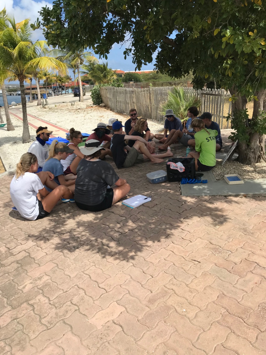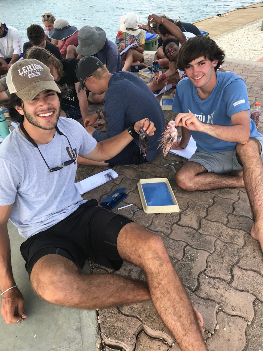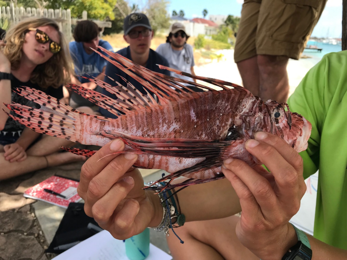 As very conservation-minded, a lionfish dissection was a perfect win-win, with being able to give a hands-on, interactive class as well as doing to reef a favor. Lionfish are not native to the Caribbean and are an invasive species that has a huge negative impact on the reef ecosystem and also further afield to commercial fisheries catch. This species does not have any natural predators here, and as the invasion is relatively recent in ecological terms, many native species have not evolved into seeing them as predators. To conquer this, Bonaire encourages the hunting of lionfish for certified individuals using an ELF (eradicating lionfish tool). The hunters of Bonaire obliged and came up trumps with lionfish for us to dissect. For Amanda’s oceanography class, the students undertook their research projects. So another win was that the fish stomach content analysis group (Alex, the Davids, and Seby) collected their first set of data. We discussed both external and internal anatomy, and then it was time to get our hands dirty and take a look. Inside the stomachs, we found numerous spines, some shrimp eyes, and many otoliths (fish ear bones – you can use them to age fish, just like tree rings). We also tried to sex the fish (which is very challenging with smaller fish), but we found an awesome example of a female who was on the brink of spawning before she was speared! Everyone did an awesome job of investigating their fish and working out what was what.