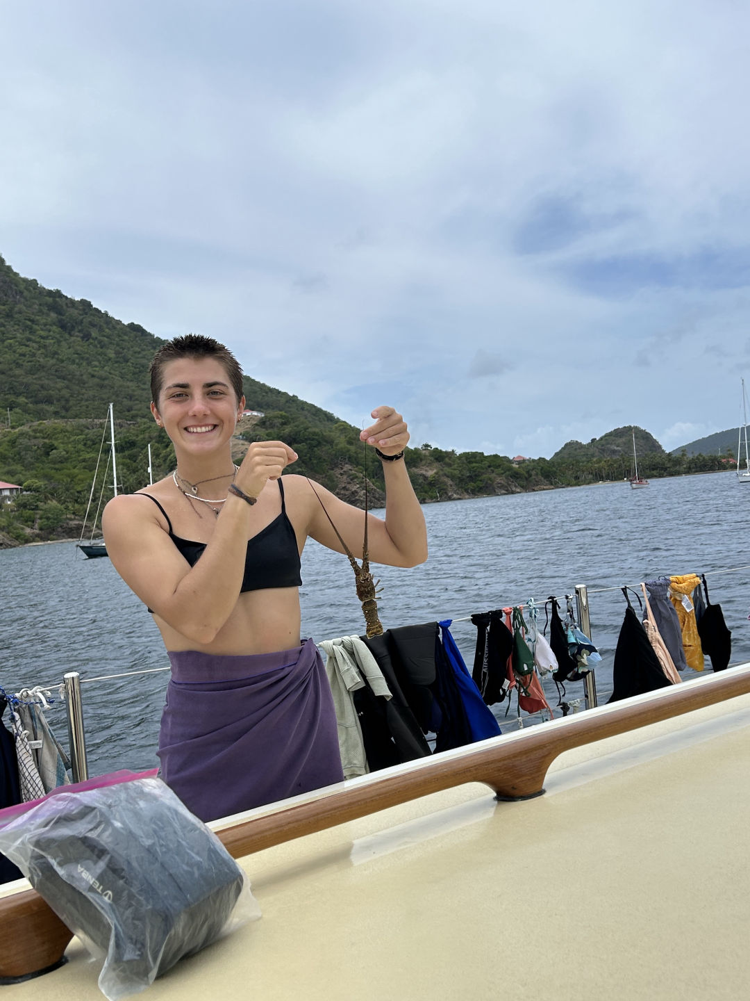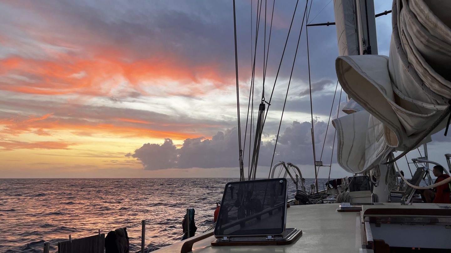 Today was a big day full of scenarios for the rescue divers. We started the morning with the BEST panned muffins I have ever made by Shuman. I am now convinced that panned muffins are better than normal ones. After cleanup, we split into two groups, one that went closer to land to do scenarios underwater and the other that stayed by the boat to practice surface scenarios. We practiced what to do when a diver is unconscious underwater as well as above water; it’s harder than it looks to drag a non-breathing diver to the boat while keeping their head above water doing rescue breaths and then having to drag them onto the dingy. But it was a fun time. During one of our scenarios, Emma found a baby lobster shell and decided to bring it back to the boat so we could have a boat pet, but she had to get rid of it shortly after for a couple of valid reasons. After today all of us now know how to deal with a diver who isn’t breathing. I can confidently say that everyone got burnt somewhere on their body today. Right before dinner, we did passage prep and started our last passage (so sad) back to Antigua. Dinner was great; we had breakfast burritos, and to end the night in a positive manner, I asked everyone for my squeeze question to say one act of kindness someone has done either for them or someone else that should be recognized. It brought a smile to my face and made me a little emotional hearing everyone share what they had come up with. Overall a great day, and I can’t wait to continue to enjoy the last couple of days we all have together.