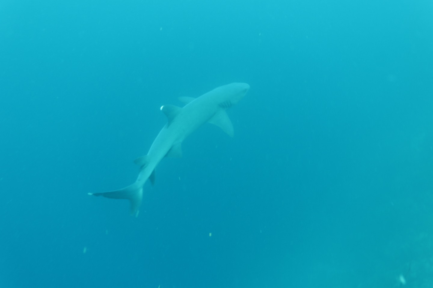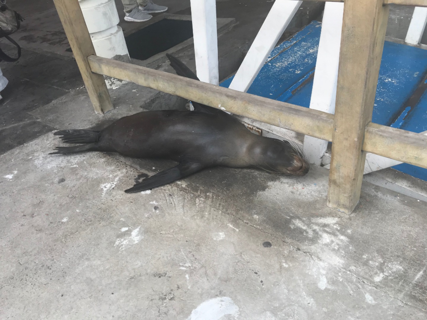 For those of us that went diving, we ate some of Trevor’s delicious chocolate chip pancakes, grabbed our dive bags that we packed the night before, and hopped in the water taxi. Rather than the masses of wild chickens from the Panama and the Caribbean, there were sea lions and marine iguanas scattered everywhere across the pier – much cuter. Gill, Louis, Mac, Marina, Amanda, Gabe, Elle, and I hopped on the bus and drove for about 45 before we reached our dive boat. The drive was a mix of lush green hills and plains with the occasional sighting of the ocean off in the distance. We drove along one of those long, straight, hilly roads for a while before having to stop for a local pedestrian – a giant tortoise!! The little guy was HUGEprehistoric dinosaur-looking dude. Anyways, when we reached the pier on the northern side of the island, the clumsy sea lion didn’t fail to entertain us while we waited for Edison and the rest of the crew to load us onto the boat. We hopped on, drove past lava rock cliffs, and stopped for a quick checkout dive – bonus! We then motored over to our dive spot – Gordon Rocks. We hopped in the water and were finally diving in the Galapagos!! Something we’ve all been looking forward to since before day 1. The first thing that set this dive apart from anything else was the insane thermocline. As we started descending, it felt like we hit a wall. Nice, warm, tropical water on top with what felt like actual ice water slowly inching through our wetsuits about 10m down. Our first dive started off somewhat quiet until everything decided to come out at once. First, we saw a giant green sea turtle with 4 or 5 fish eating algae off of its shell, then 2 sea lions came out of nowhere to check us out and hung around for a couple of minutes. Then – the sharks!! We saw one white tip, then another, then a hammerhead off in the distance, some more turtles, a school of tuna (maybe?), some more sharks, until there was a shark in every direction we looked!!! As my dive buddy, Mac, and I sat at 5m for our safety stop, there were about 6 white tips swimming right at our feet. In another setting, this has the possibility to be terrifying, but we were floating there in awe of how beautiful and mellow these sharks were. We came out of the water, and none of us were able to contain our excitement.