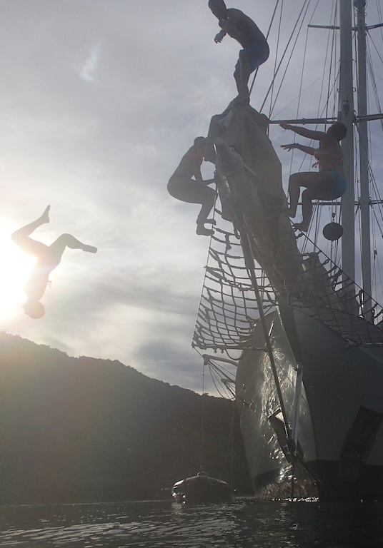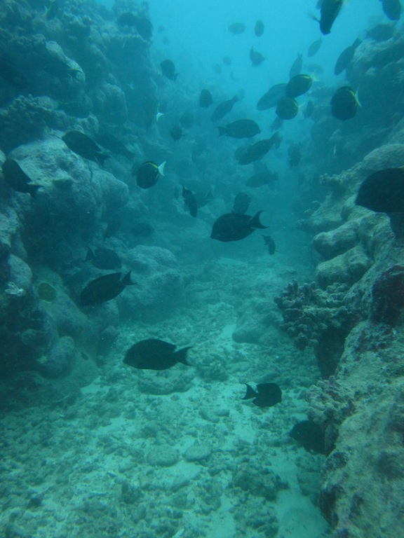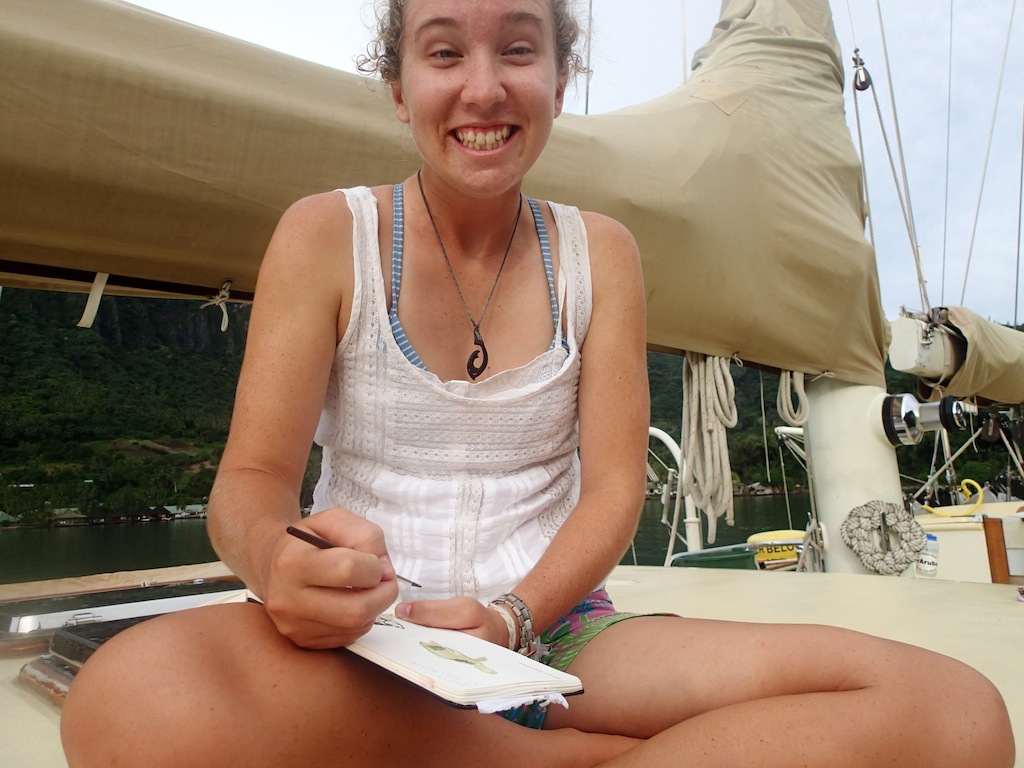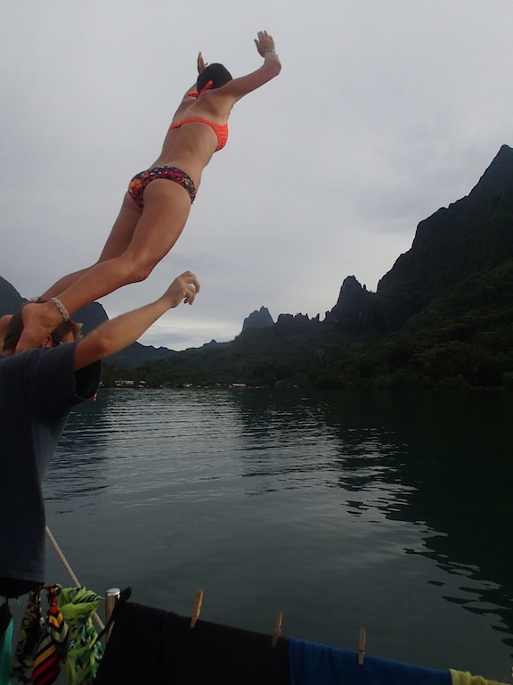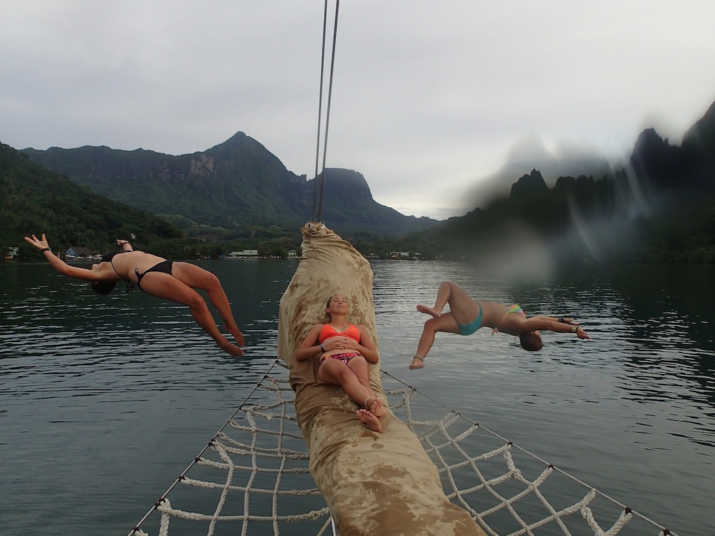 Due to the continuous rain throughout the night and morning, we ended up having breakfast (muffins, yogurt, and pineapple) down below. Fortunately, the rain cleared up, and the day ended up being nice. Some people went diving in the morning before lunch, and then most went ashore. We had a nice lunch at the Blue Pineapple. It was great to have burgers, fries, and Coke again. After that, we walked around Moorea, exploring. There was a lot to do, although a lot of the stores were closed because it was Sunday. After exploring the island, a few people came back early and went wake-skating behind Nopadome, the quicker of Argo’s two dinghies. Before dinner, we laughed for a while as everyone recounted their most hilarious stories of the semester so far during the squeeze question. To end the day, we have our final OCE examination, which marks the end of our schoolwork here on Argo!