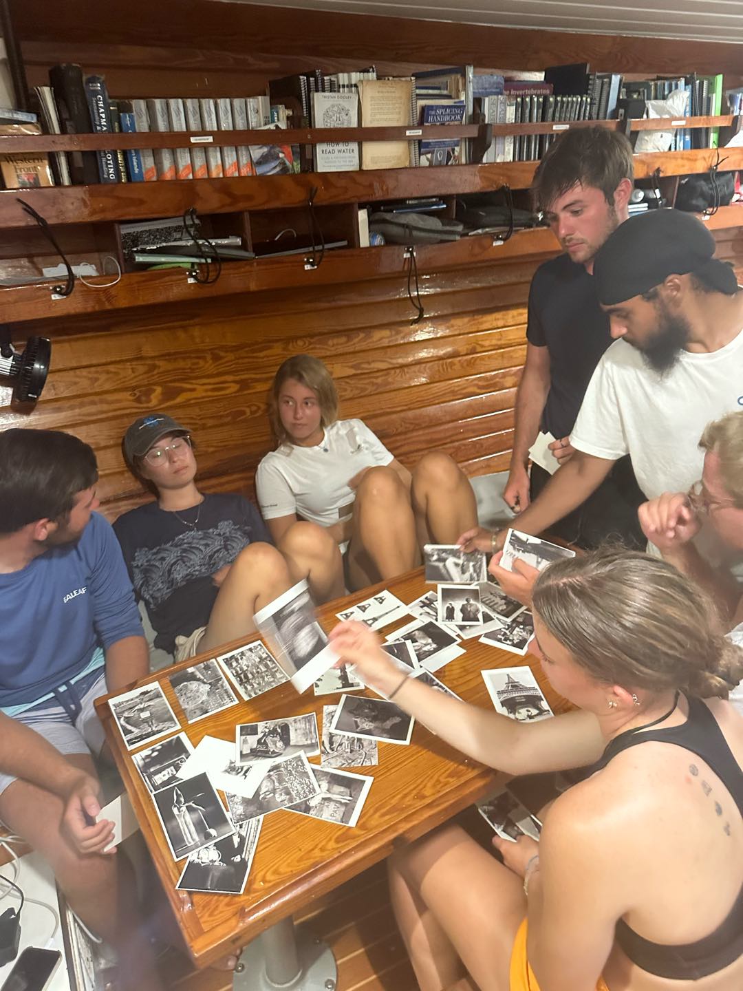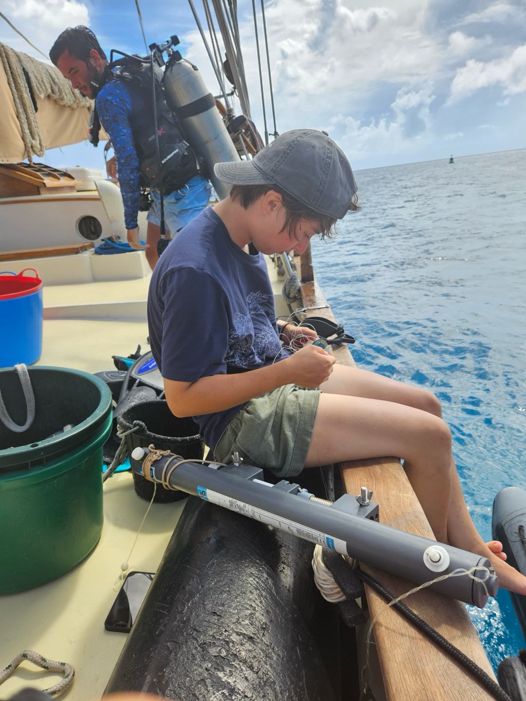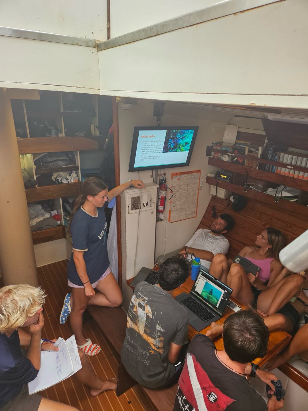The morning started off with a filling English breakfast consisting of eggs, bacon, toast, and baked beans to fuel everyone for our day filled with Science. After breakfast, the crew took time to put clean sheets on their bunks and tidy their personal areas before getting into their oceanography literature review presentations. In the morning, Rhianna started us off by teaching us about invasive species, focusing on one we have seen many times while diving: the lionfish. Claire then taught us about Sea turtles and the threats they face in the Caribbean. Nadia went over the importance of ecotourism while Robert, Max, Will, and Chloe discussed the impacts of climate change on coral reefs and fisheries and the increased prevalence of hurricanes. Jaxson wrapped up the morning presentation with a discussion on predatory fish and their impact on their local ecosystem. After half of the presentations, we had lunch, which consisted of chicken Caesar salads.
