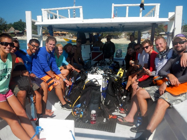 First full day in Gili! We had an early start this morning as both the Open water divers and the already certified divers headed to the island in the dinghies for a full day onshore. The open water divers headed straight out for their two dives, while those who weren’t in the morning group had a free morning to explore the island. Gili is a fascinating dive tourism hub with no motorized vehicles, and most of our day was spent exploring the main road that is lined with shops and a highway for horse/donkey-drawn carts. After two weeks with no internet, many of us also found cafes with free wifi to contact family and do some quick research for upcoming assignments. The island provided a nice dietary change. My personal menu consisted of Nutella crepes, a brownie with ice cream, a banana split, and a Toblerone.