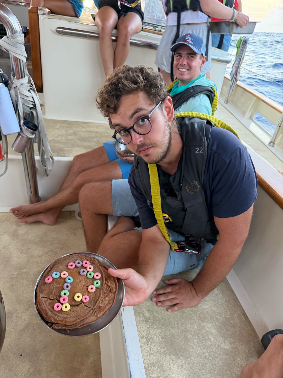 Tragically, you cannot escape the watch cycle, and I was back on with watch team 3 from 1400-1800. Luckily, we were only really on for about an hour before class. I ran a quick boatie at 1455, completing it in record time. Nacho taught us about coastal zones, and a lot of sand was discussed. Once class wrapped up, watch team 3 re-mustered in the cockpit to complete our 1400-1800 watch. SkylAr, Arthur, and Aidan were cheffing up dinner, all while Avi and Ani baked (on the stove) chocolate pancakes (made with cake batter, I think, possibly.. im actually not sure) for Jonass 23rd, wait sorry, 22nd birthday! (Dont worry, everyone, this confusion was dealt with waaaaay back in Antigua when he realized people born in 2004 were not, in fact, turning 23 this year.