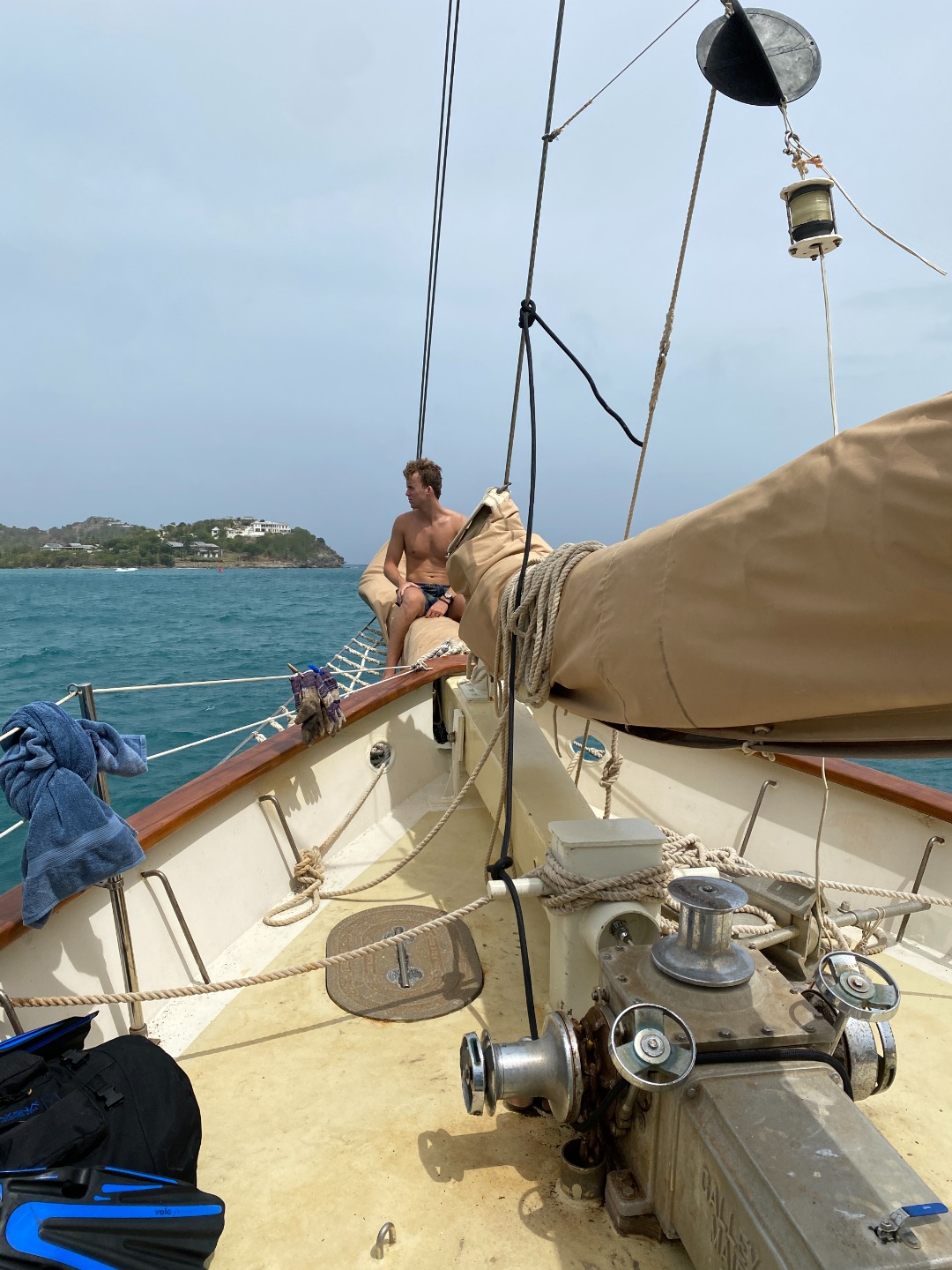 Today was all about scuba. The more experienced divers among us took to the fresh blue waters of Falmouth Harbour for a refresher. Up on deck, we newbies began to learn about the technical setup of our scuba gear. Before long, we were called up on deck for lunchtime to the smell of fresh bread. Ash was at it again. We’ve only been here since Tuesday, but it already feels like we’ve known each other for weeks; playful banter and (maybe a bit too) high-pitched laughter is everywhere.