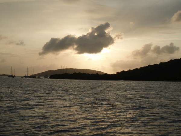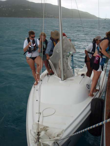 Today, we got up out of our bunks at our usual 7 am wake-up call to a beautiful sunny morning in Vixen Point. With a full day scheduled of scuba diving and sailing, we hurried (but still thoroughly) cleaned up after a breakfast of banana bread baked fresh by our shipmate Matt. The open water diving group went off to do their third open water dive, while the already certified group went and sailed with Kevin on smaller boats to really get a feel for how to work the wind and tack and jibe efficiently. I myself was in the open water diving group. We saw some new marine life we had not had the chance to see before, like skate and some decent-sized barracuda. After our dive, we returned to Ocean Star and packed away our diving equipment just in time to prepare the ship for a squall that was coming our way. While we were hustling around, closing all the hatches and rolling up the tarp, the other group that had been off sailing was battling the increasing winds brought in by the coming squall that was getting ever closer. But our trusted and ever so brave captain, Kevin, maneuvered the small boat safely to Ocean Star just in time to get everyone in the galley just before the buckets of rain poured down on everyone. The squall only lasted about twenty minutes, as usual, then the sun was out and shining once again; oh, how we love the Caribbean weather. After a delicious lunch of chicken salad and fruit, the open water group went sailing with Kevin while the other group went to shore. While we sailed with Kevin, the group on shore enjoyed sailing Hobie Cats and relaxing on the beach. Around 5 o’clock, we all returned to Ocean Star to have “shower time,” which, of course, consisted of jumping overboard, soaping up, jumping overboard again, and then rinsing off with the freshwater hose, possibly the best way to bath ever.