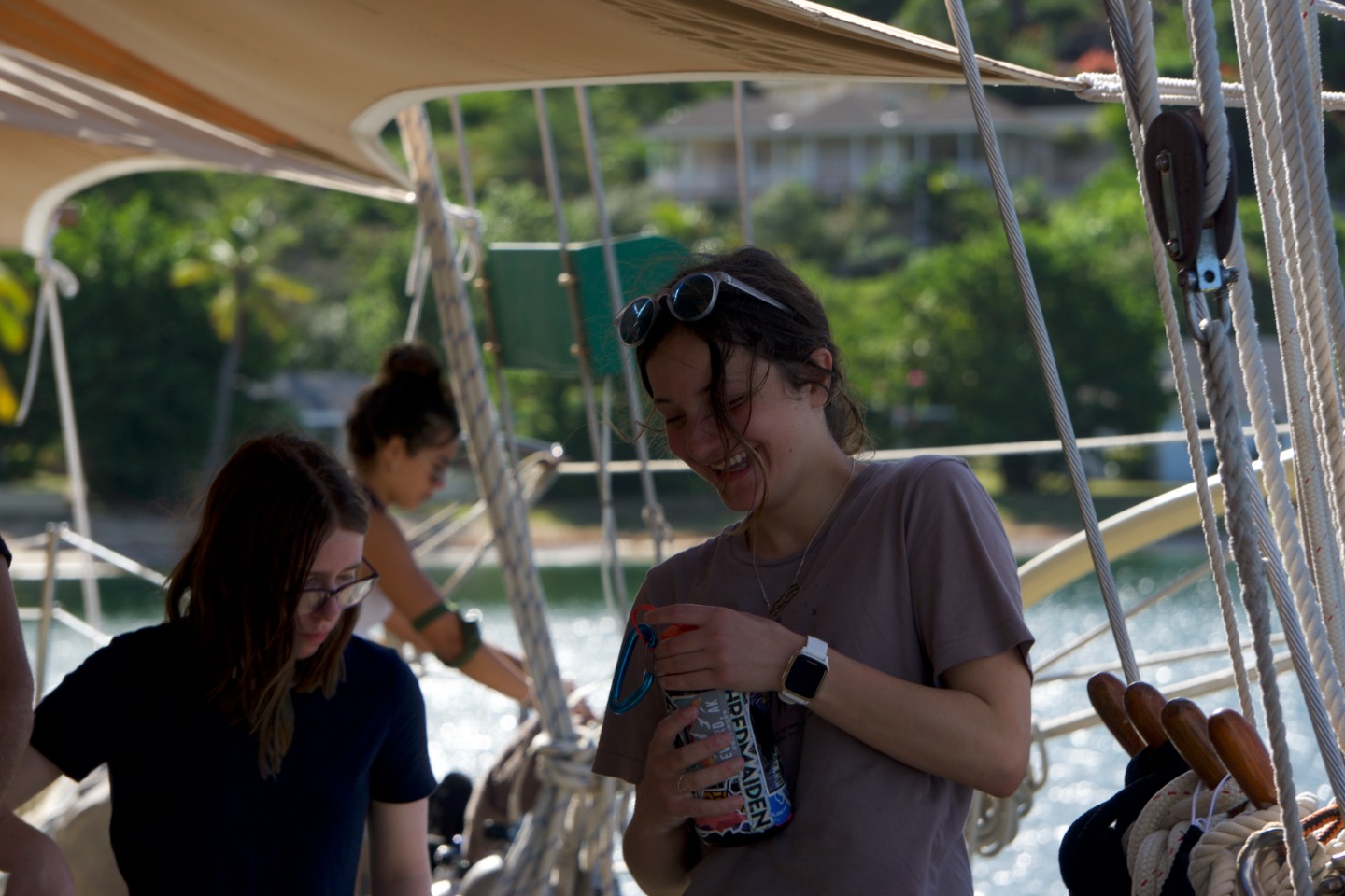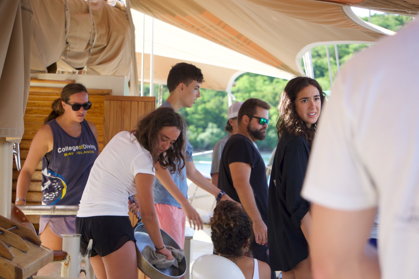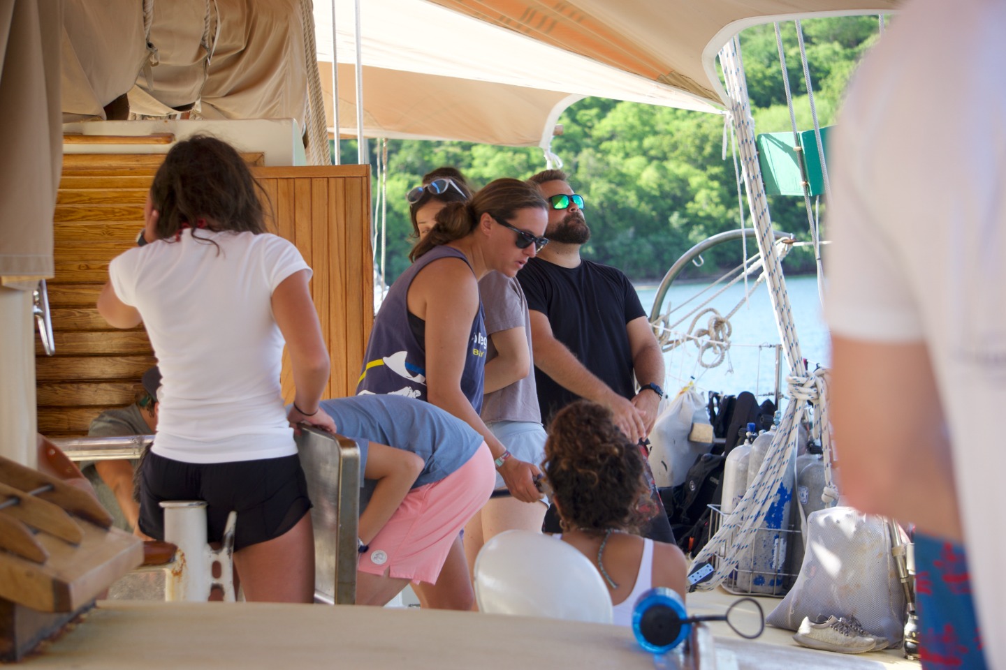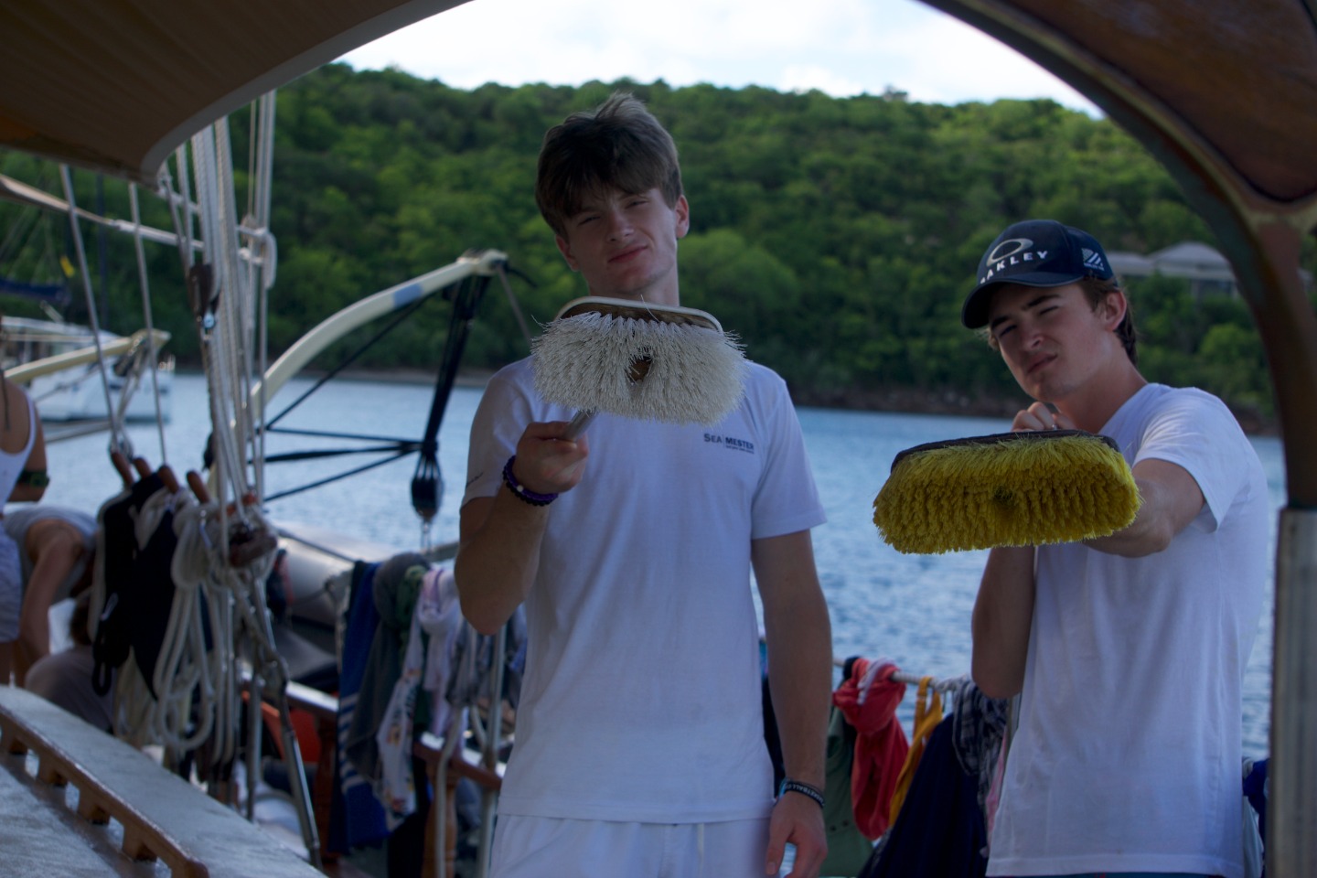 Let’s see here. Today started with an amazing view of the sunrise around 5 am when I was awoken for an anchor watch. I checked wind speed, our depth and made sure one last time for the night that the anchor was safe and sound. Being skipper today, I woke everyone up, even though I was not the first up, as I had planned. Mornings start with a nice rinse in the ocean and a shower to get the day off right. We continued our diving certifications and dove deeper into the science behind our body’s limits underwater. Next came a jump off the port beam for a swim to the beach and a scout for any sea turtles on the way in. Some of us had a fresh coconut, which took some force to break into. A lot of force. After lunch, we had our intro to seamanship and had the opportunity to go to the grocery store to get preferred drinks and snacks for our upcoming voyage. I picked up some tasty San Pelligrino’s for the ride. To my family, I am loving this trip. I have not laughed this much in a long time. I told everyone how my 6, soon 7-year-old little brother can scuba dive. The reactions from the dive professionals varied, to say the least. Off to the deck now for cleanup, after we will stargaze while talking about life with our feet hanging above the Caribbean sea. – Also listening to our captain’s “Caps” sweet playlist.