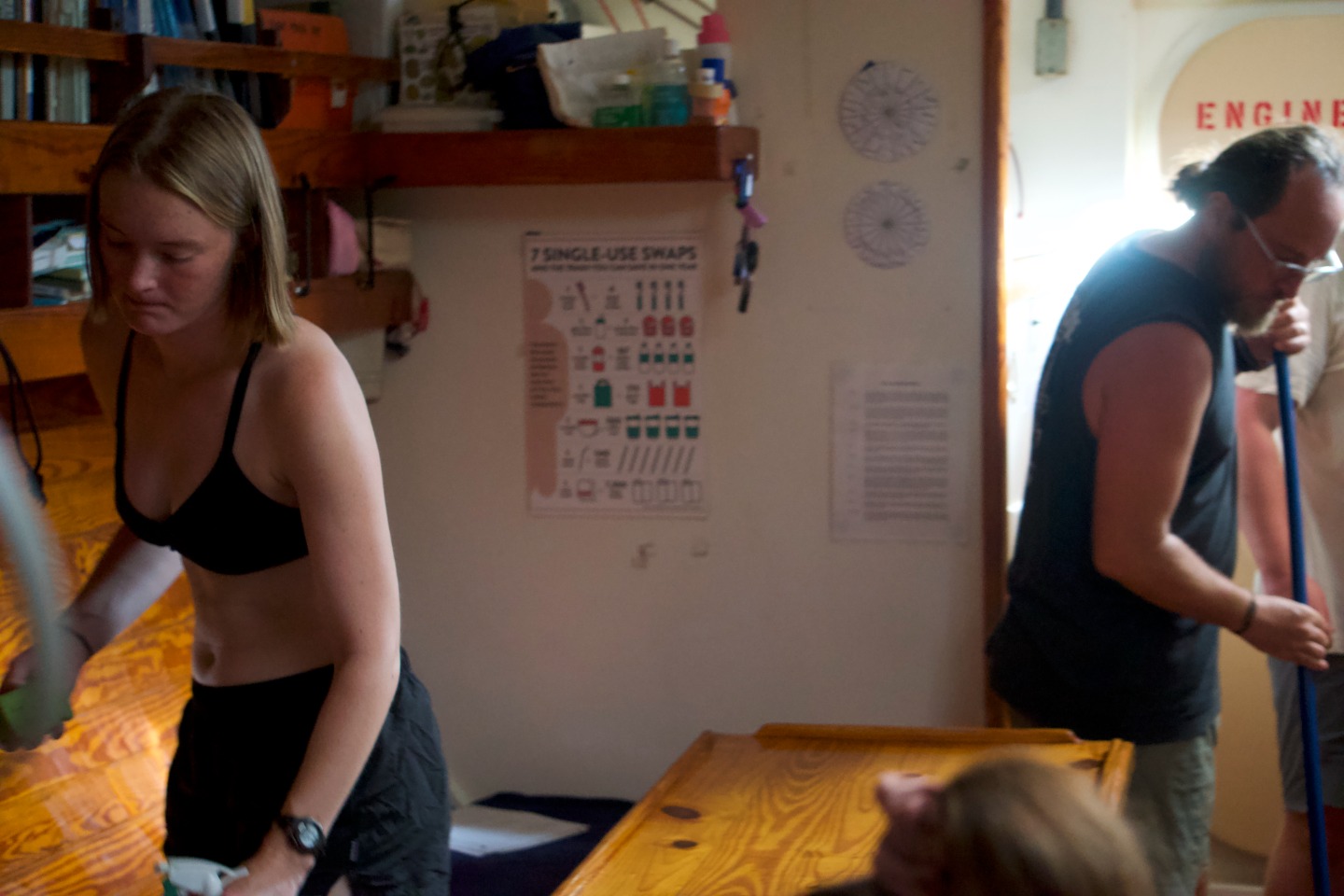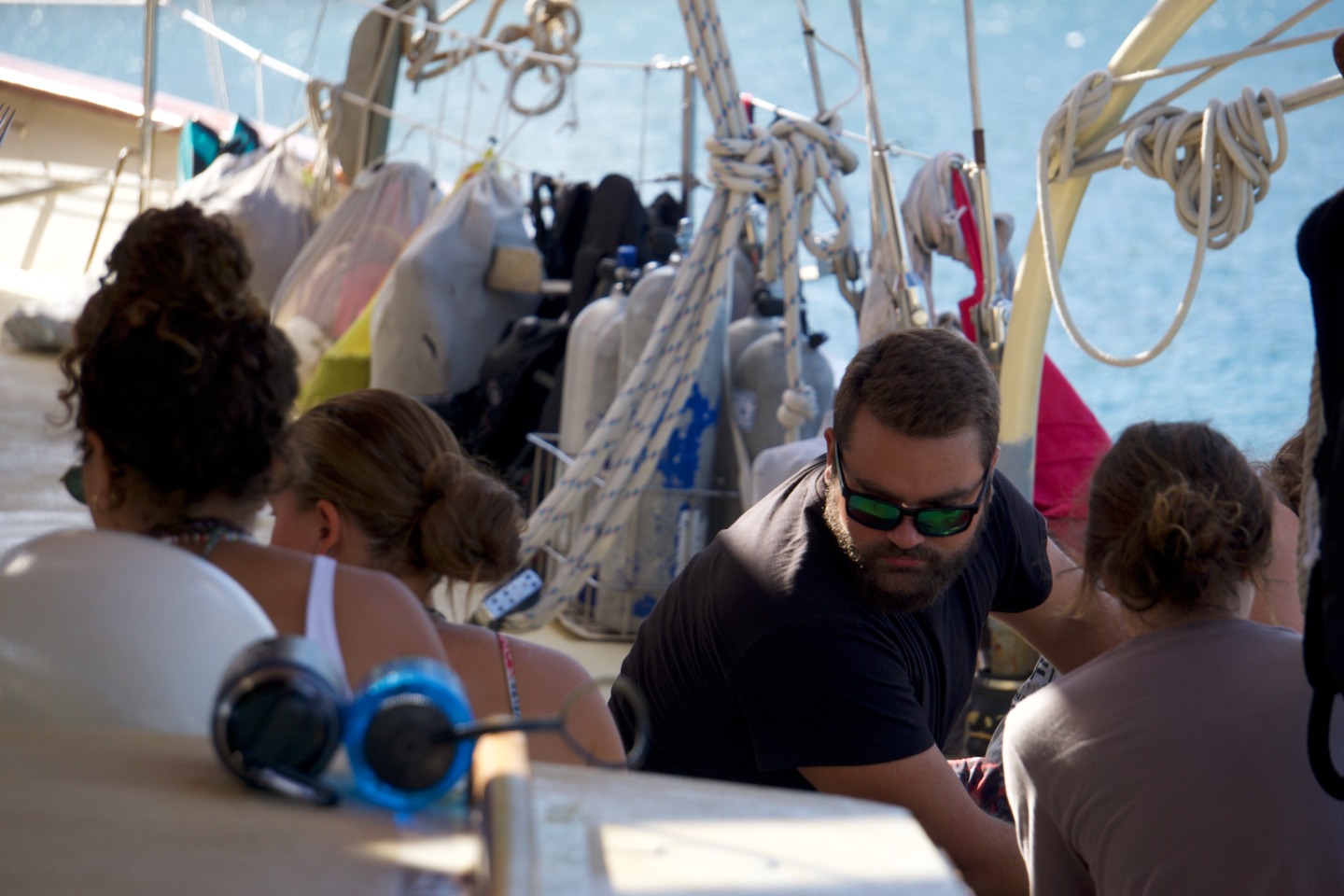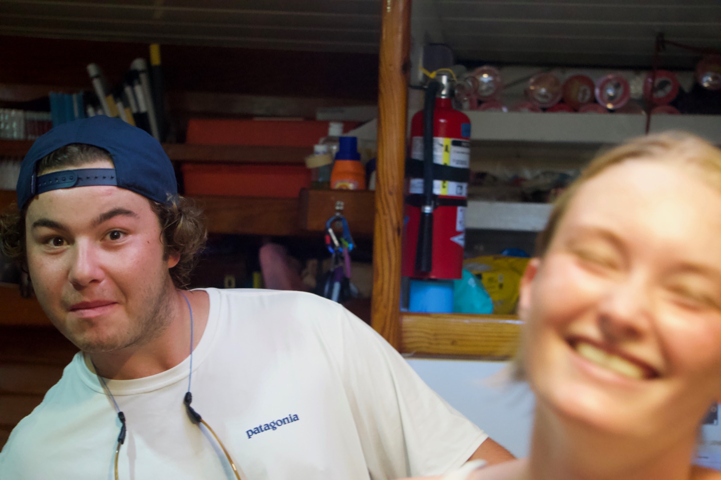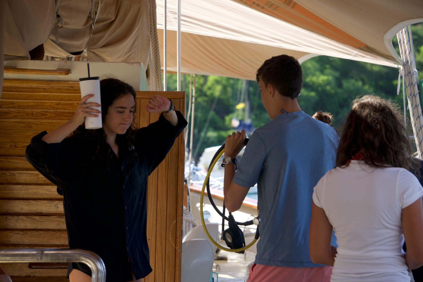 Let’s see here. Today started with an amazing view of the sunrise around 5 am when I was awoken for an anchor watch. I checked wind speed, our depth and made sure one last time for the night that the anchor was safe and sound. Being skipper today, I woke everyone up, even though I was not the first up, as I had planned. Mornings start with a nice rinse in the ocean and a shower to get the day off right. We continued our diving certifications and dove deeper into the science behind our body’s limits underwater. Next came a jump off the port beam for a swim to the beach and a scout for any sea turtles on the way in. Some of us had a fresh coconut, which took some force to break into. A lot of force. After lunch, we had our intro to seamanship and had the opportunity to go to the grocery store to get preferred drinks and snacks for our upcoming voyage. I picked up some tasty San Pelligrino’s for the ride. To my family, I am loving this trip. I have not laughed this much in a long time. I told everyone how my 6, soon 7-year-old little brother can scuba dive. The reactions from the dive professionals varied, to say the least. Off to the deck now for cleanup, after we will stargaze while talking about life with our feet hanging above the Caribbean sea. – Also listening to our captain’s “Caps” sweet playlist.
