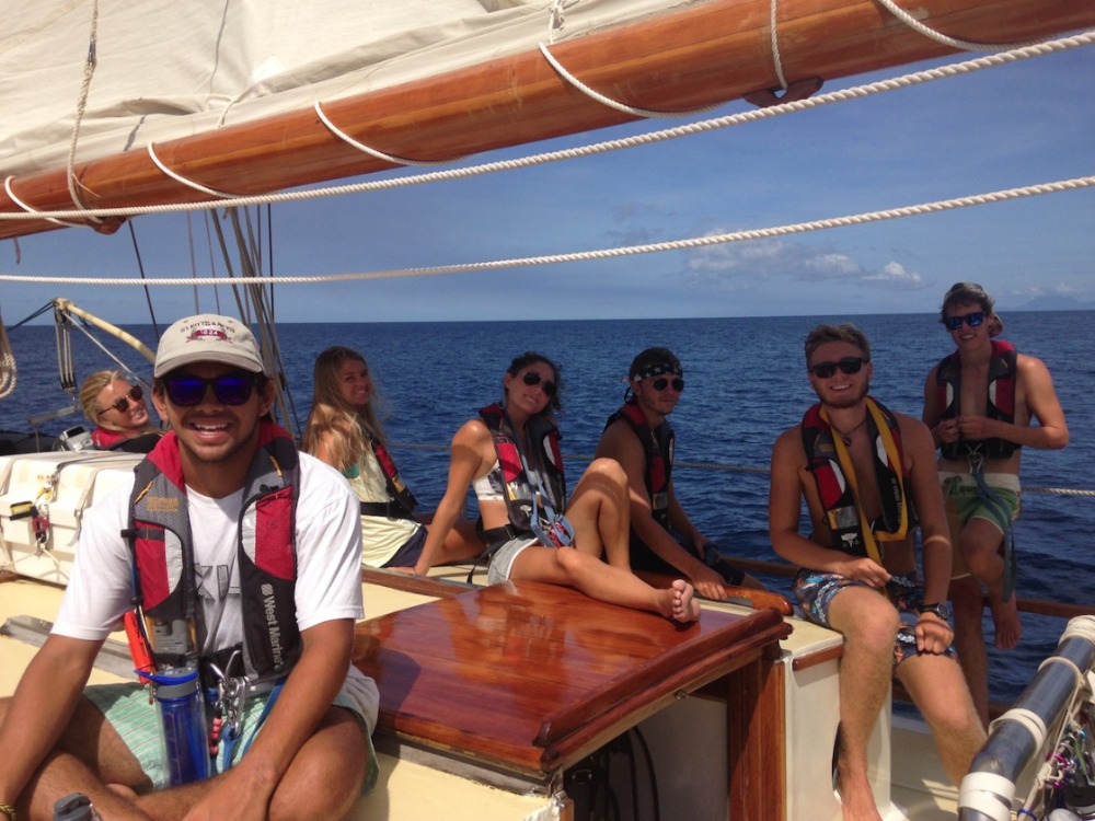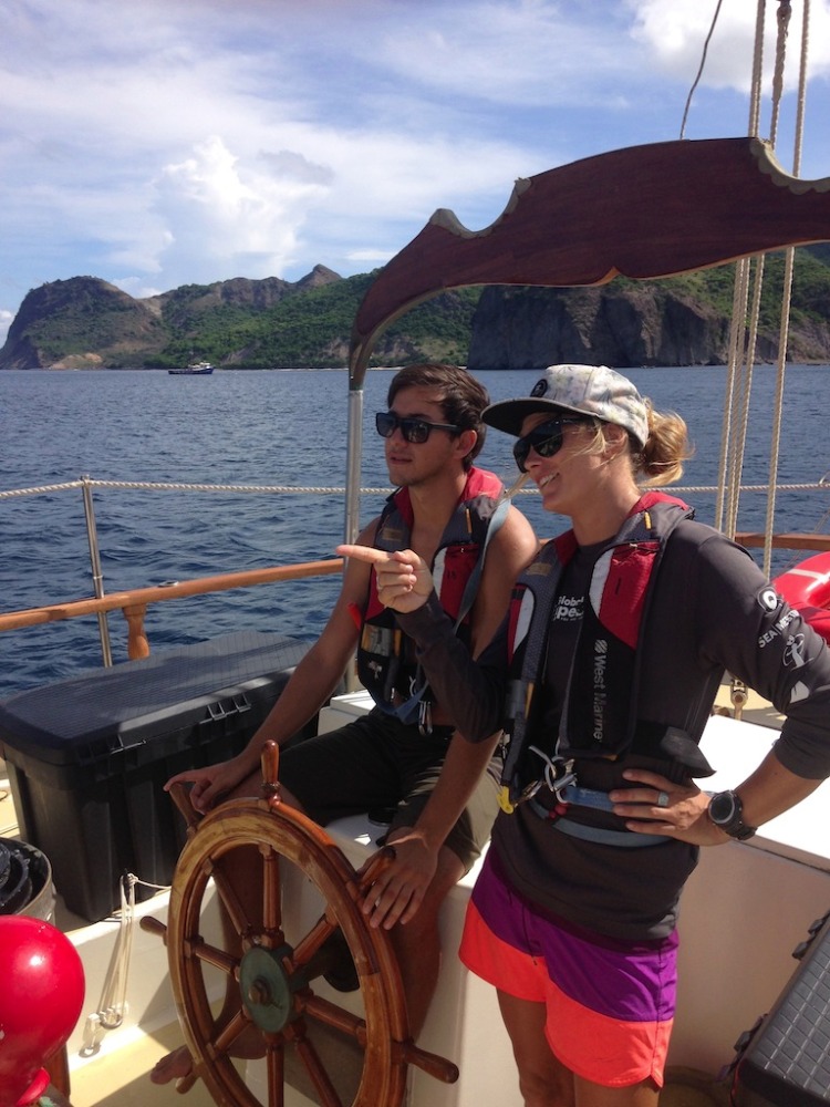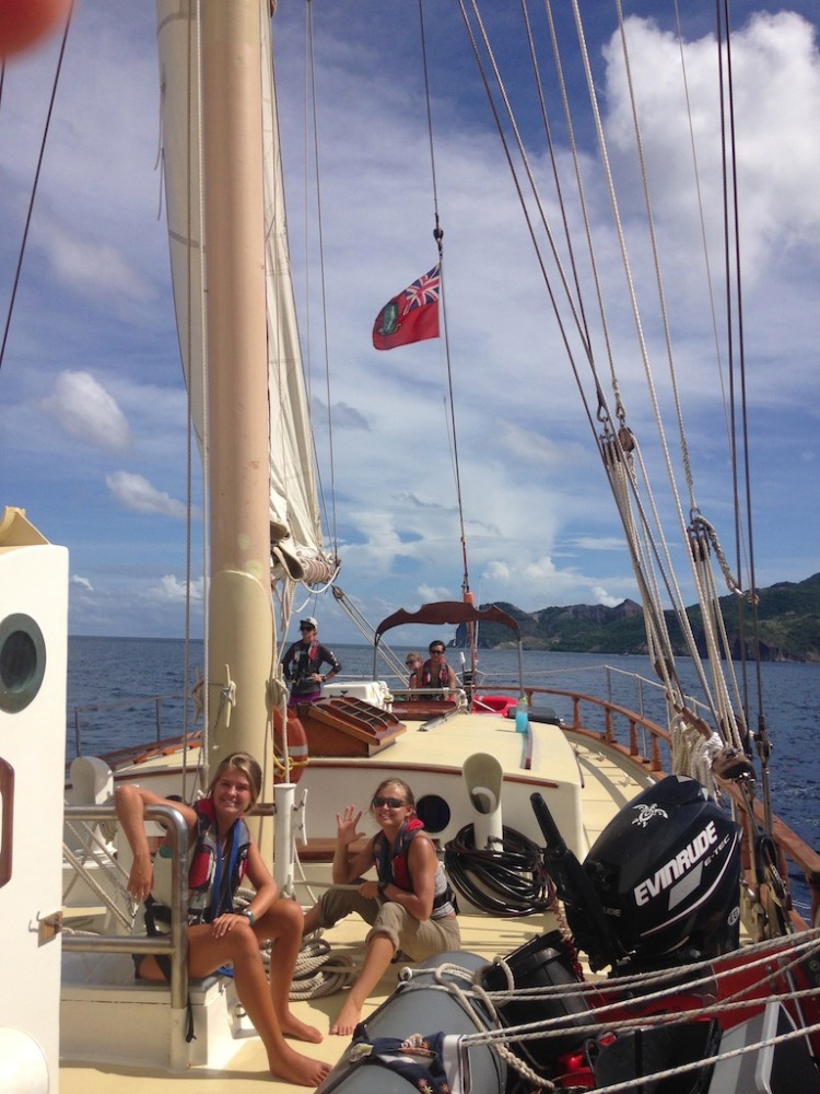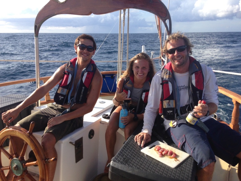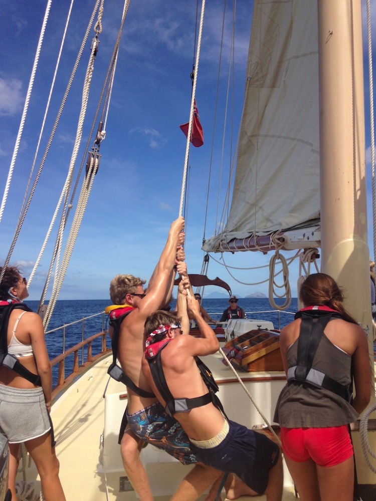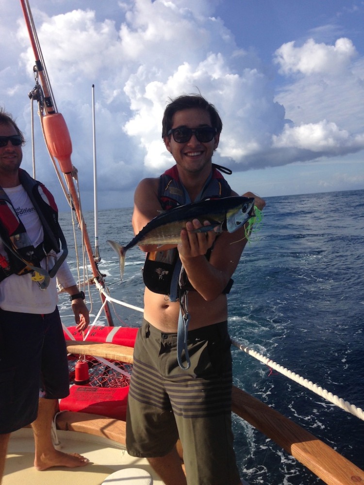 Today, we lifted anchor and began our two-day passage to the island country of Grenada, raising four sails in only fourteen minutes! I manned the helm and drove us out of the harbor; steering this vessel can be tricky, but It was an honor and a thrill to drive such a beautiful ship. We are now functioning as a true crew of sailors, relying less on our staff members and more on each other to get things done. During my watch shift, one of our hand lines hooked a small tuna; I pulled it out, and we shared a seafood snack as fresh as it gets! Our snack couldn’t have been better timed because soon after, the once calm waters became turbid, and we were in for a bumpy but exhilarating ride where doing the simplest chores could become a very interesting endeavor! With our ship at a 15-degree tilt, we had to improvise while serving ourselves dinner; using the cap rails for support, Duncan and I broke into laughter, realizing how ridiculous we actually looked. We are now watching the starlit sky, cracking jokes, and enjoying every moment like one big family.