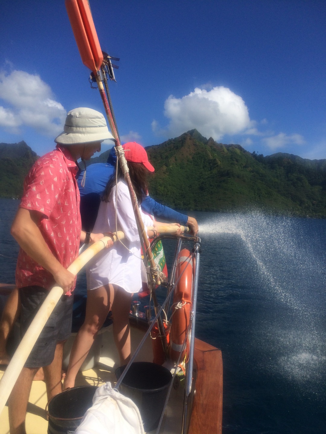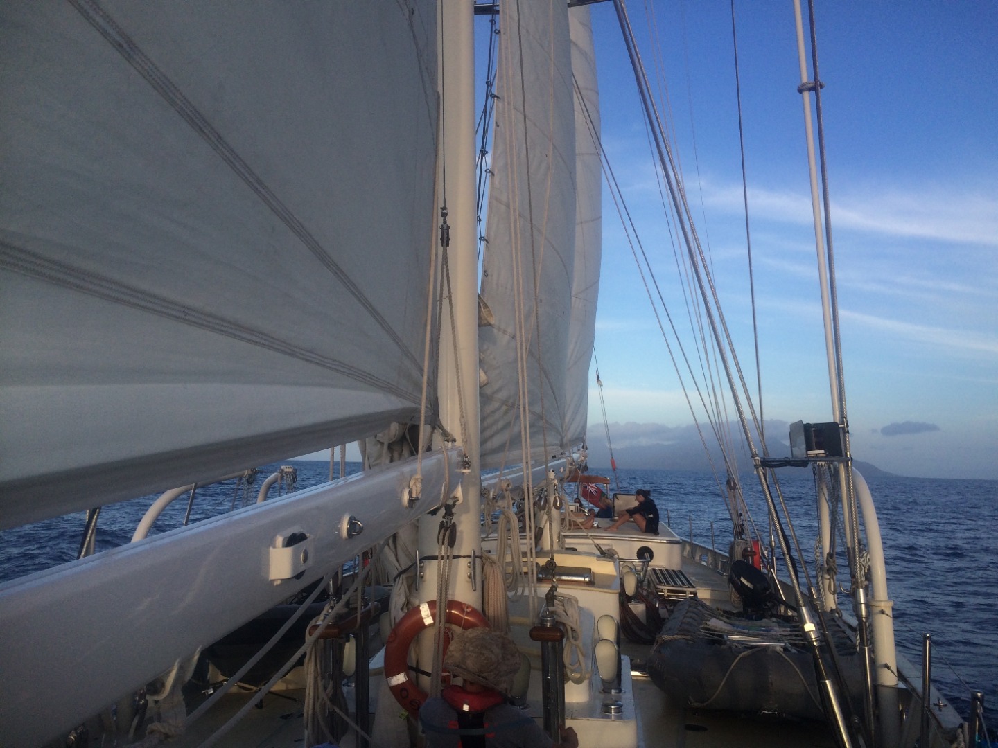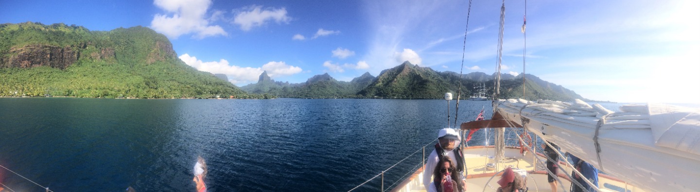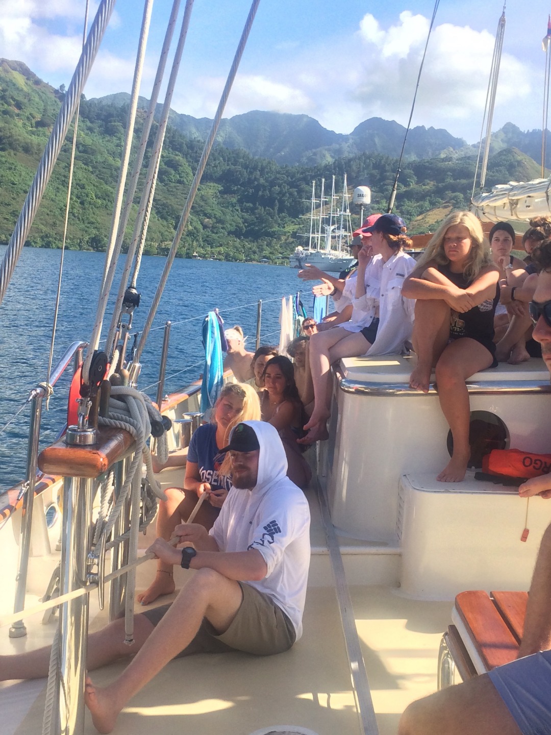 Closing up on the first week aboard Argo, I think most of us have adjusted to waking up at 7 am and sitting anchor watch for an hour in the middle of the night. I really enjoy anchor watch because even though the almost full moon blocks most of the stars now, it is quiet and peaceful at sea. Today was our last morning in Moorea before we began our first passage to Tahaa. Our Open Water divers headed out to complete their confined water divers, accompanied by Charlotte and Katie, who are aiming to get their Divemaster certification. The rest of us stayed aboard Argo and learned about some of the necessary steps of passage prep, such as preparing the sails, tying down the dinghies, and preparing our rooms and the rest of the ship for 40/40 (so that nothing will fall at 40 40-degree tilt or with 40 knots of wind). After lunch, we talked about all of the safety features and what to do in an emergency situation (don’t worry, parents, in the highly unlikely case something happens, we’re prepared!). We also set our watch teams for our 4-hour passage shifts tonight and were briefed on what we do on watch. Our teams of seven are responsible for boat checks (making sure everything is working as it should), working the helm (steering), and bow watch (to make sure we don’t hit anything). Around 2-2:30, we set off for our 19-hour passage. We should reach Tahaa sometime around 11 am, if not before. It was cool to watch Moorea fade away in the distance and watch the sunset on the open ocean. This was the first time I’ve been on the water and looked around to see nothing but darkness and the open ocean, a surreal experience. Shortly after leaving, some of us began to feel the effects of the rolling ocean, made even more dramatic when down below. I can’t say I was a fan of the sensation, and I’m sure some others would agree with me there. However, I’m confident we will all earn our sea legs soon and am excited to see what the next few months have in store for us as we become closer, take on more passengers next week, and learn more about how to sail. Bye for now!