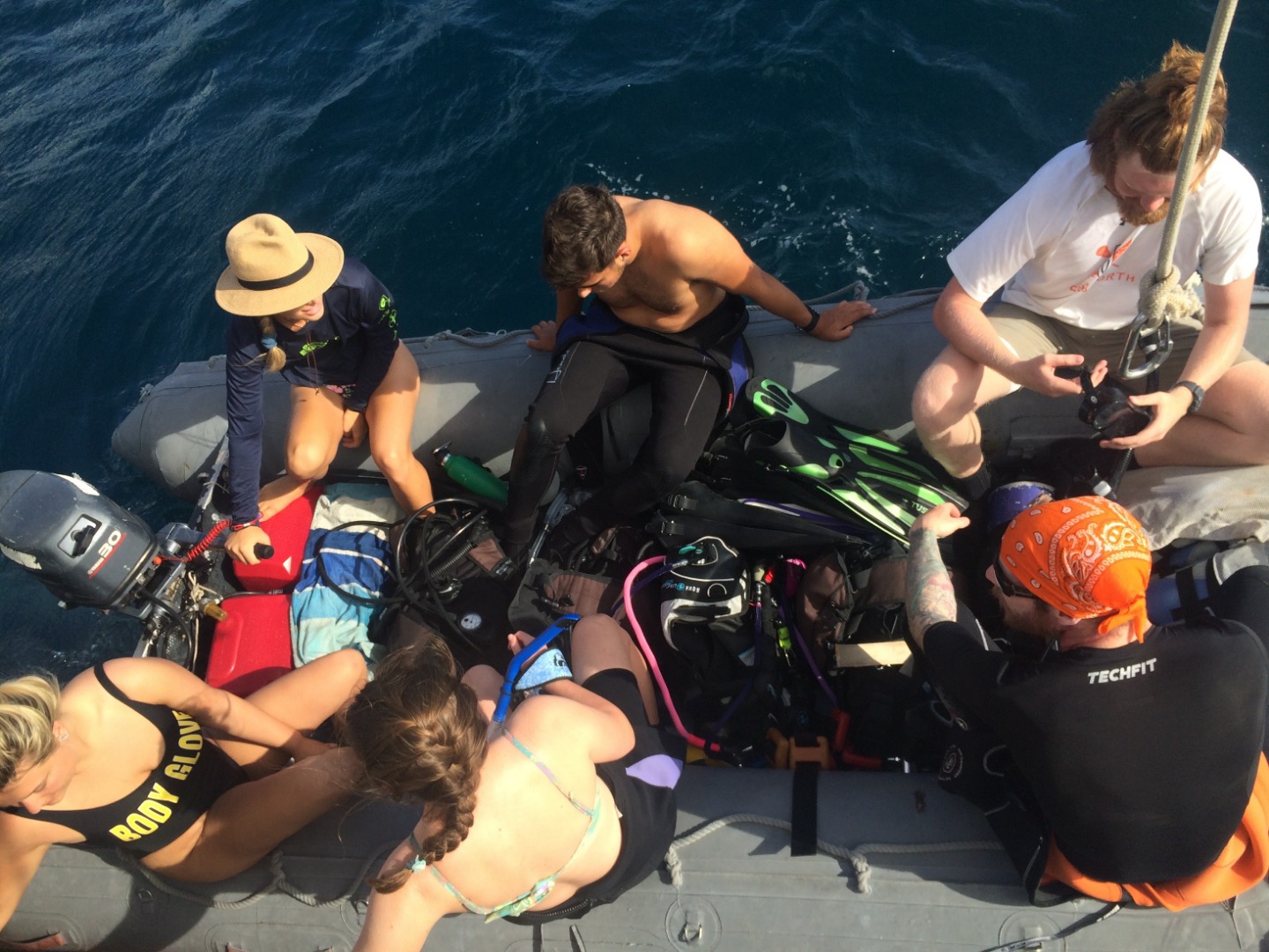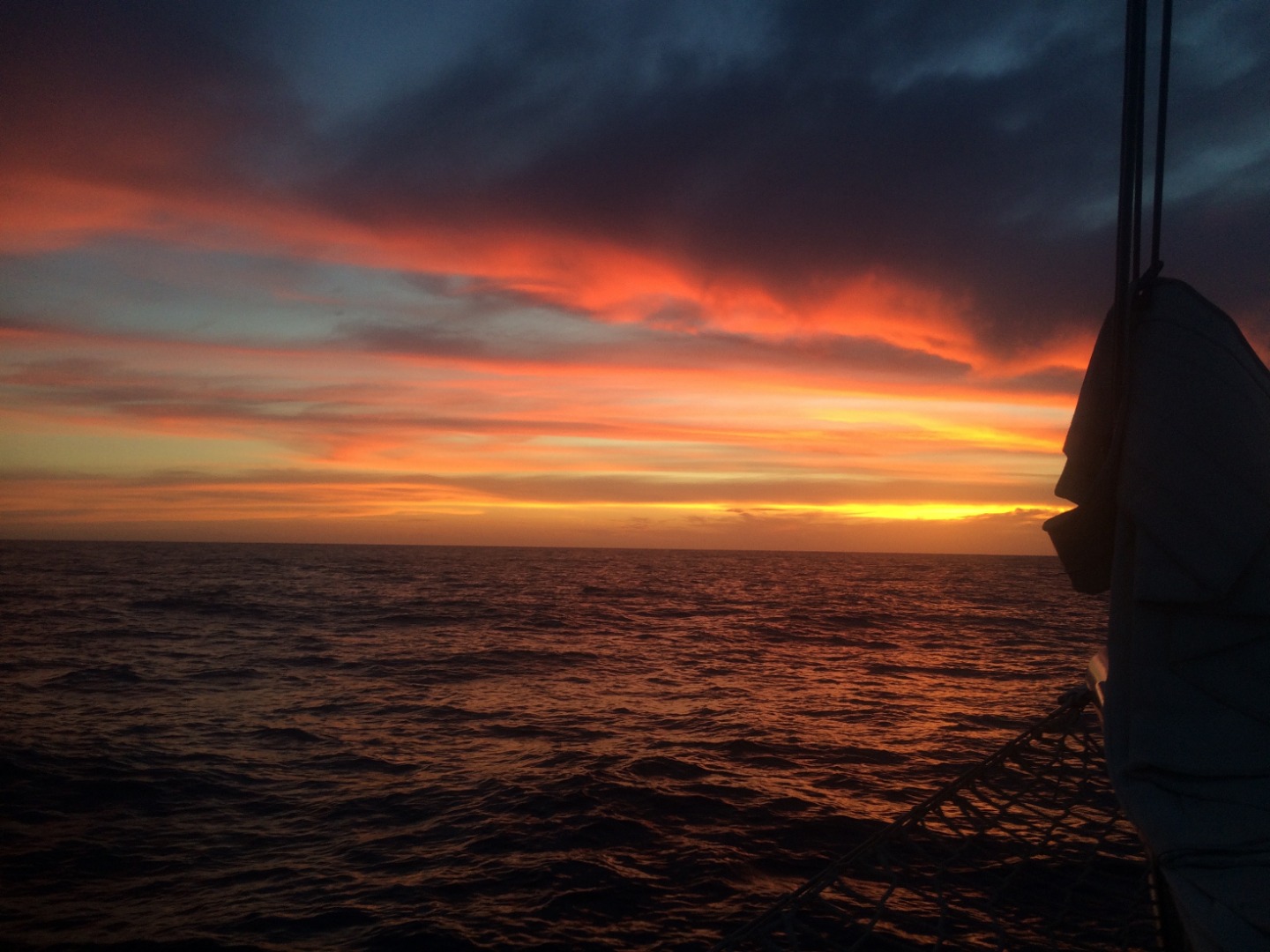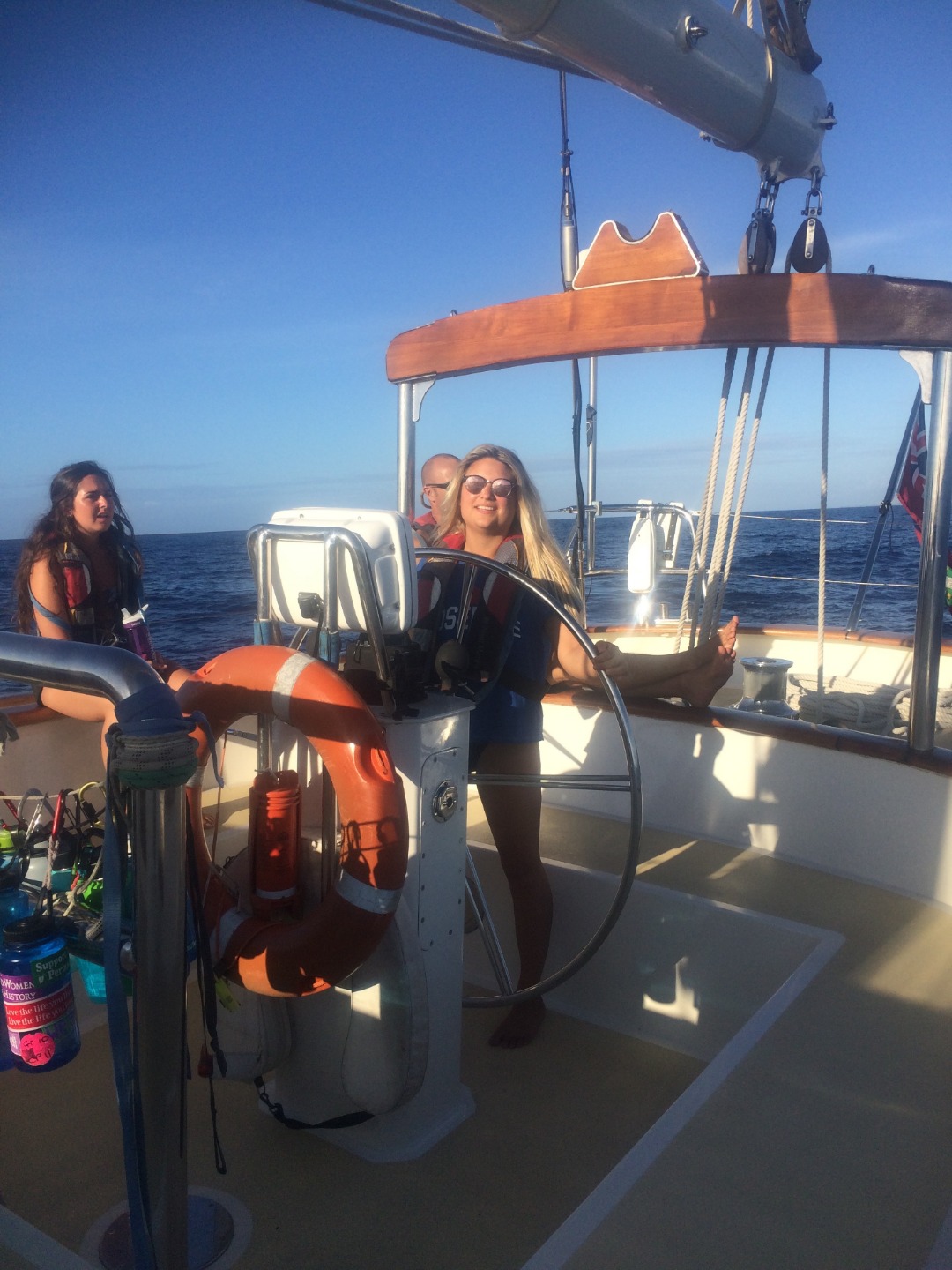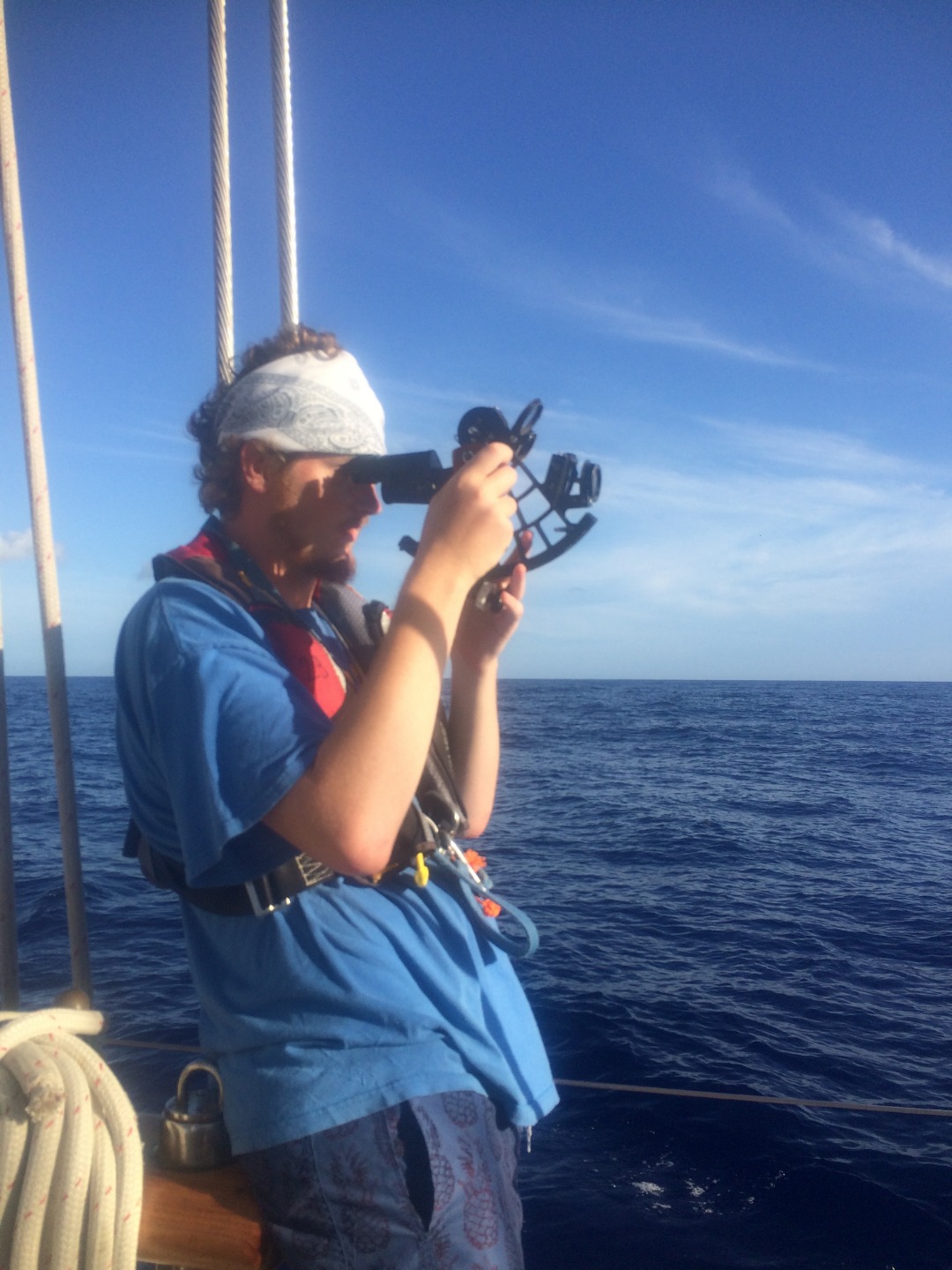 Closing up on the first week aboard Argo, I think most of us have adjusted to waking up at 7 am and sitting anchor watch for an hour in the middle of the night. I really enjoy anchor watch because even though the almost full moon blocks most of the stars now, it is quiet and peaceful at sea. Today was our last morning in Moorea before we began our first passage to Tahaa. Our Open Water divers headed out to complete their confined water divers, accompanied by Charlotte and Katie, who are aiming to get their Divemaster certification. The rest of us stayed aboard Argo and learned about some of the necessary steps of passage prep, such as preparing the sails, tying down the dinghies, and preparing our rooms and the rest of the ship for 40/40 (so that nothing will fall at 40 40-degree tilt or with 40 knots of wind). After lunch, we talked about all of the safety features and what to do in an emergency situation (don’t worry, parents, in the highly unlikely case something happens, we’re prepared!). We also set our watch teams for our 4-hour passage shifts tonight and were briefed on what we do on watch. Our teams of seven are responsible for boat checks (making sure everything is working as it should), working the helm (steering), and bow watch (to make sure we don’t hit anything). Around 2-2:30, we set off for our 19-hour passage. We should reach Tahaa sometime around 11 am, if not before. It was cool to watch Moorea fade away in the distance and watch the sunset on the open ocean. This was the first time I’ve been on the water and looked around to see nothing but darkness and the open ocean, a surreal experience. Shortly after leaving, some of us began to feel the effects of the rolling ocean, made even more dramatic when down below. I can’t say I was a fan of the sensation, and I’m sure some others would agree with me there. However, I’m confident we will all earn our sea legs soon and am excited to see what the next few months have in store for us as we become closer, take on more passengers next week, and learn more about how to sail. Bye for now!