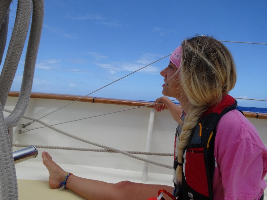 The rising sun brought with it a surge of rain and wind, yet luckily, watch team two was on deck and brought us safely through the weather. Watch team three took over at 0800 and only experienced a slight drizzle, though the spray put forth by the bow as we lurched down one wave and up the next was enough to douse those on bow-watch. By 0900, the sky reflected a cheery blue with intermittent, puffy, state-fair-cotton-candy clouds that seemed to cross over us as if on a leisurely summer stroll. The shipmates have all greatly improved their sea legs over the past 24 hours, and this growing confidence in maneuverability has brought with it an increasingly elated mood. The wind held strong throughout the morning, and as shipmates cycled through the helm, we were able to stay impressively on course. As the shipmates started class this afternoon, the wind began to die down a bit, so we trimmed in our sails and turned on the main engine to give us a little boost in speed. All are hopeful that tonight will afford us more wind and the chance to once again harness the clean power from the skies. As we finished a delicious dinner of pork and vegetable kabobs with pasta salad and pumpkin sauce, we all, one by one, cast our gaze off the port side and marveled at the setting sun. The sky was cloudy, but no one seemed to mind the rich purple hues that so eloquently framed the pink, fuzzy-bordered sun as it made its final departure, bidding us a temporary farewell, calm seas, easy sailing, and good wind.