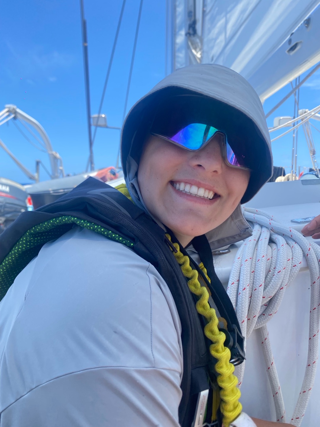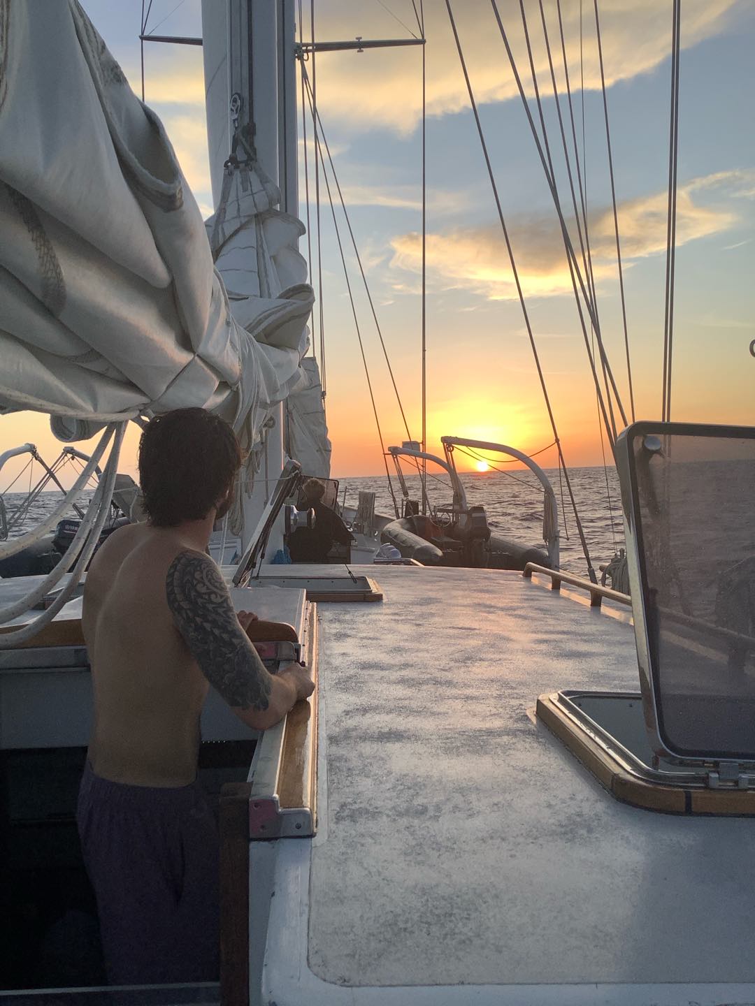 The day started as the clock struck midnight. My watch has begun. Watch team 1 is in shambles. The stern party is active tonight. Or maybe I should say very, very inactive. We release them from their long, grueling watch. Scarlette stayed sprawled out on the stern simply because she loves it there. As soon as wait team 1 is gone, Alice, Jewel, and I have replaced the stern party. It was my first time there, but luckily, I was there with some regulars to show me the ropes. As watch went on I was up and down all night long, thinking it had passed and it surly had not. I will say watch flew by for me. Probably didnt for Keith, Henry, Zoe, and Kyler, as they had to do every boat check and helm for the whole 4 hours. From what I heard, they did see some peculiar light off in the distance that we think could be military jets flying around in the distance with their afterburners going on and off. At least that is what we came up with. After that fever dream of a night, we return to bed and catch our much-needed 8 hours of sleep that bumps right up to lunch.