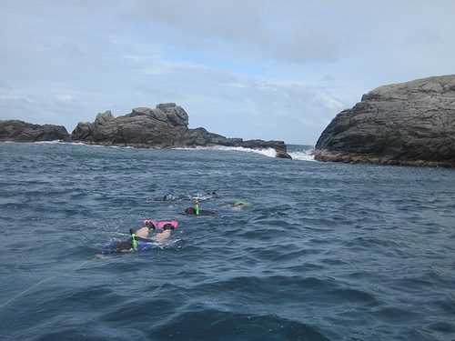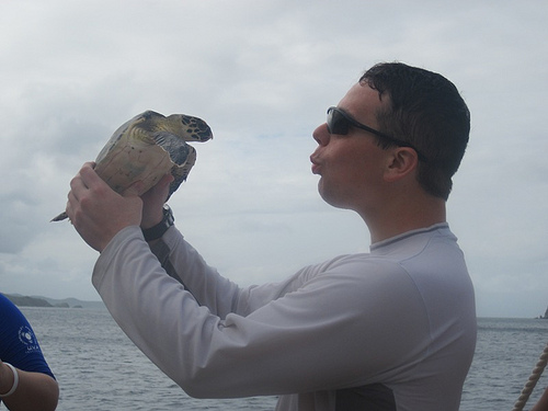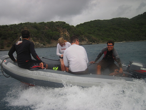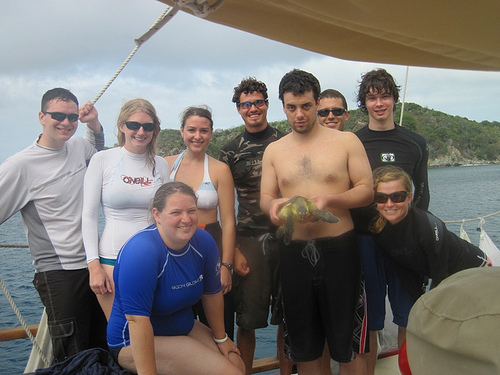 One week into the trip, and things are going well! The smuggling runs have been successful, and the slave labor isn’t so bad…Actually, today was fantastic! Despite what seemed to be record rain in the area, there was still plenty of time to take our very first marine bio class and set sail out to Mountain Point. Though the original plan of doing the second open water dive (for us beginners) and another dive for the certified people was postponed due to rain, we were able to get in the water and look for and tag sea turtles. This involved a unique experience of gearing up, grabbing a line, and being towed by a dinghy while searching for a green or a hawksbill sea turtle. Our two-plus-hour tug boating experience was only interrupted three times. Fortunately, each was because there was a turtle spotted. The first time, John eyed the little guy, and it was quickly pounced upon by six eager shipmates and one staff. Though many near catches were made, success was due to Lady Alyson, who surfaced with the hawksbill in triumph. We quickly (and gently) took the little guy (he was no more than two years old) aboard Ocean Star to take measurements, tag him (or her), and then pose for pictures. Once done and after we let Jaba (the name given to the turtle) back into the water, we went back out in search of more. We did end up catching another turtle eventually…however, it was Jaba, yet again, not the brightest fellow in the world. From there, we went to check out a little tunnel by the rocks of Mountain Point that required a little free dive to get into! Hours later, with showers done and delicious food in our stomachs, we sat down for a rousing class of CPR and first aid. That was the just of day seven of this trip; it’s crazy to think that it’s already been a week. I have the feeling that the rest will fly by in a similar way!