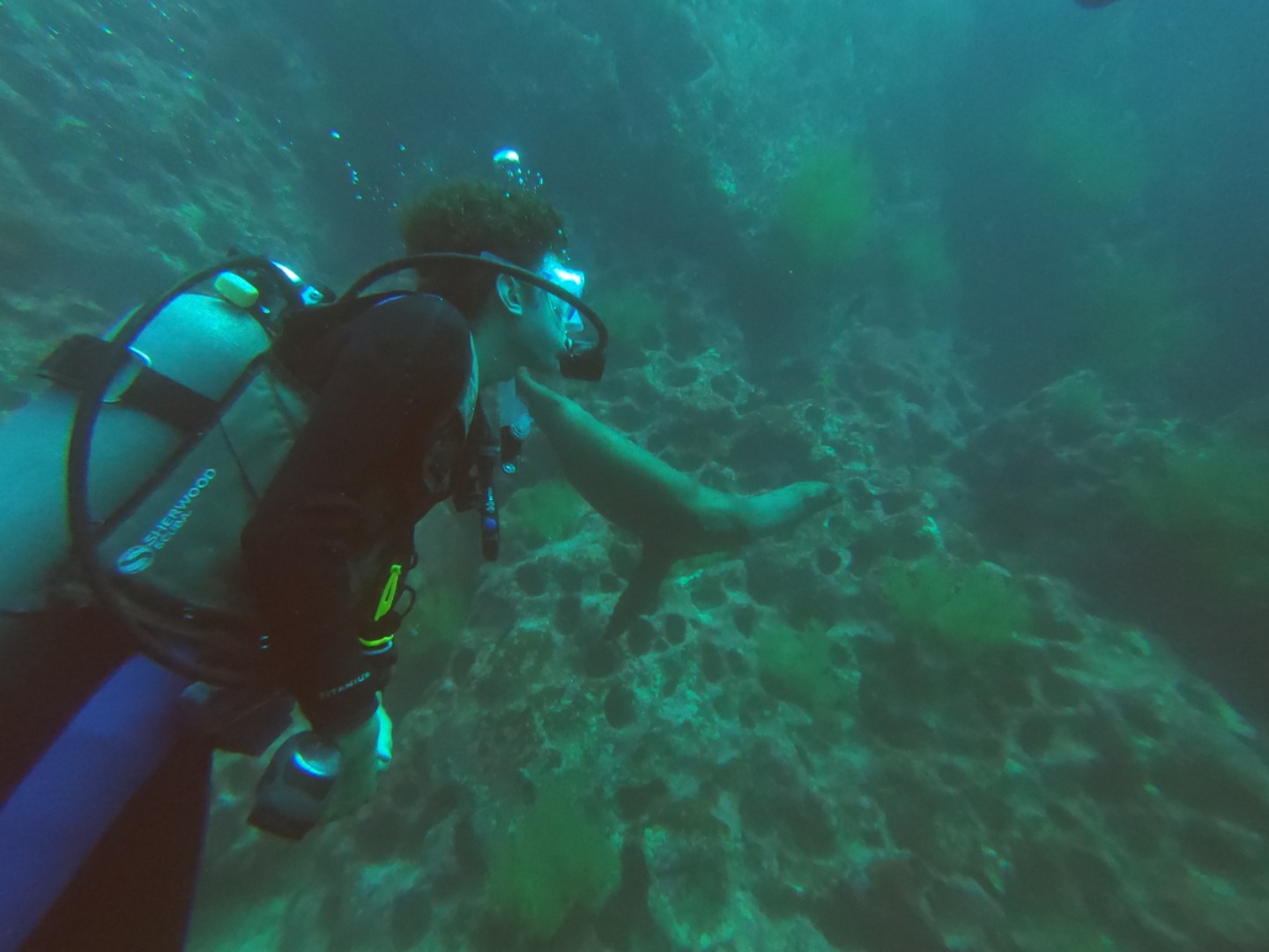 Pictured: Bianca, Sophie, Amy, and Tim being silly on the dive boat; me and a sea lion underwater; Seby and Sam making faces; Alexa and a sea lion; schools of fish during the dives; before and after of Sophie, Alexa, and Amanda with their new haircuts; sign for the island of Santa Cruz in town.