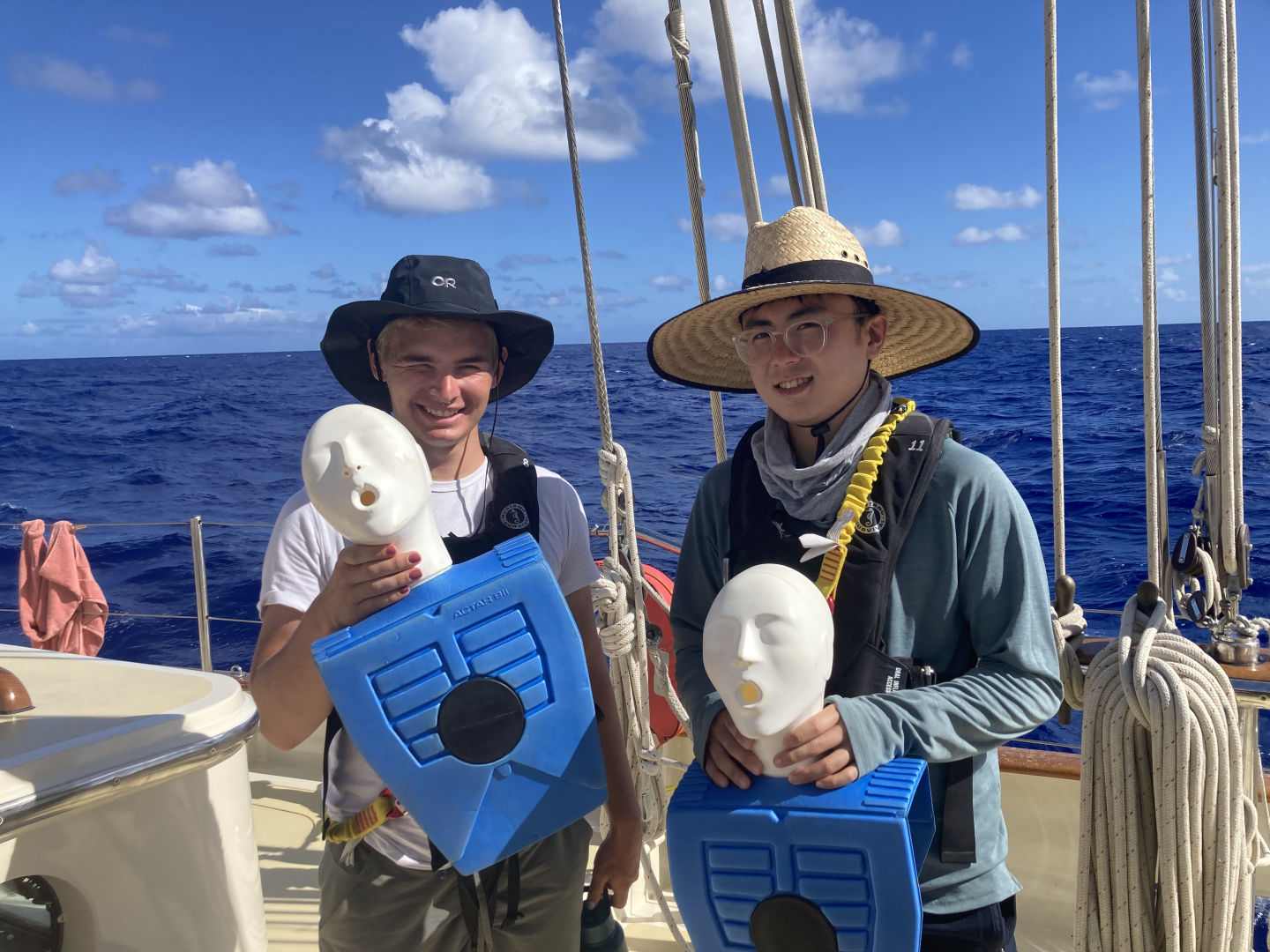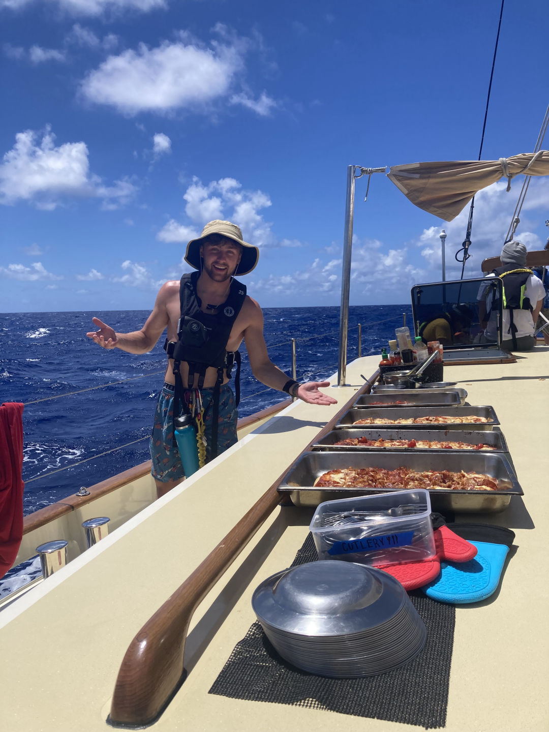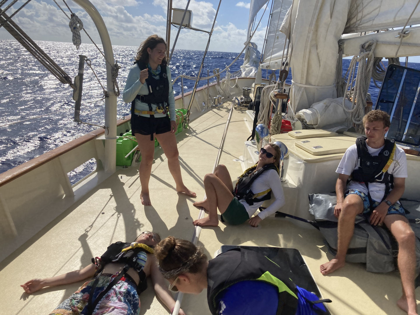 The day began at midnight for watch team 1 and me, with a beautiful starry sky. The moon decided to show itself a little later today, which meant that we were able to take “sparkle breaks” and watch the stars of the ocean trail behind the boat. It was another night filled with stories and music, courtesy of Emma, Gabe D, and myself since the speaker died. Elder Gabe conveniently decided to keep quiet about having a charged speaker, probably because he wanted to see if we could shipwreck some nearby sailors with our siren-like voices. Unfortunately, Beau (thank you for thinking of this blog’s title) was unable to take part in this revelry and was lying next to the cockpit like one of those shipwrecked sailors instead, but I think our songs healed them. At the same time, Max was making a lot of pizza dough and rice for today’s menu, with the help of Peter and Nat, surprising watch team 2, when they found them in the kitchen at 4 am. It was definitely worth it since there was nothing but happy smiles and greasy fingers all around at lunch, except for David, who confessed that he doesn’t like pizza just two days ago… After lunch, we had our first marine biology exam, which I think went very well for everyone, thanks to our wonderful teacher Ben and some watch team study sessions. Then we had emergency response training with Amanda C and Elder Gabe and rescued some dummies by performing CPR to the beat of “Call Me Maybe” (again, I really think that we should start a choir on board, led by Amanda C and Elder Gabe). Most people did some work or took a nap until it was time for dinner, which was another delicious meal (fried rice and chicken/tofu). We finished off the day sharing our happy places to the sound of the slight breeze in our sails (the motor turned off for some peace and quiet) and the sun slowly sinking into the calm sea.