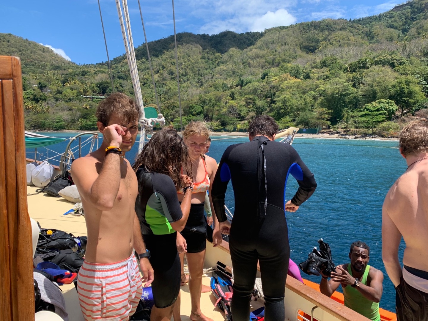 With a normal wake up of 7 am, we felt well-rested and prepared to take on the day. While scuba diving group one got their gear prepared for the morning, the rest of us spent the time studying and finishing up our leadership essays. Shortly after we finished up preparations for the dive, the SMMA (Soufriere Marine Management Association) group arrived to give a presentation on their organization’s mission and discuss what the morning dive would be like. We then headed out on their boats to our dive spot and finished our deep dive for our Advanced Open Water course while a member from their group watched over us and hunted lionfish. By the end of the dive, he had speared four lionfish in 20 minutes! Lolo then spent the rest of the morning after we got back, teaching us the anatomy of this invasive species as well as gutting and cleaning it for dinner later in the day. The second dive group dove a spot called Superman’s Flight due to the strong current they can get there. Both groups had a great time diving, and we are one step closer to our next dive certification!