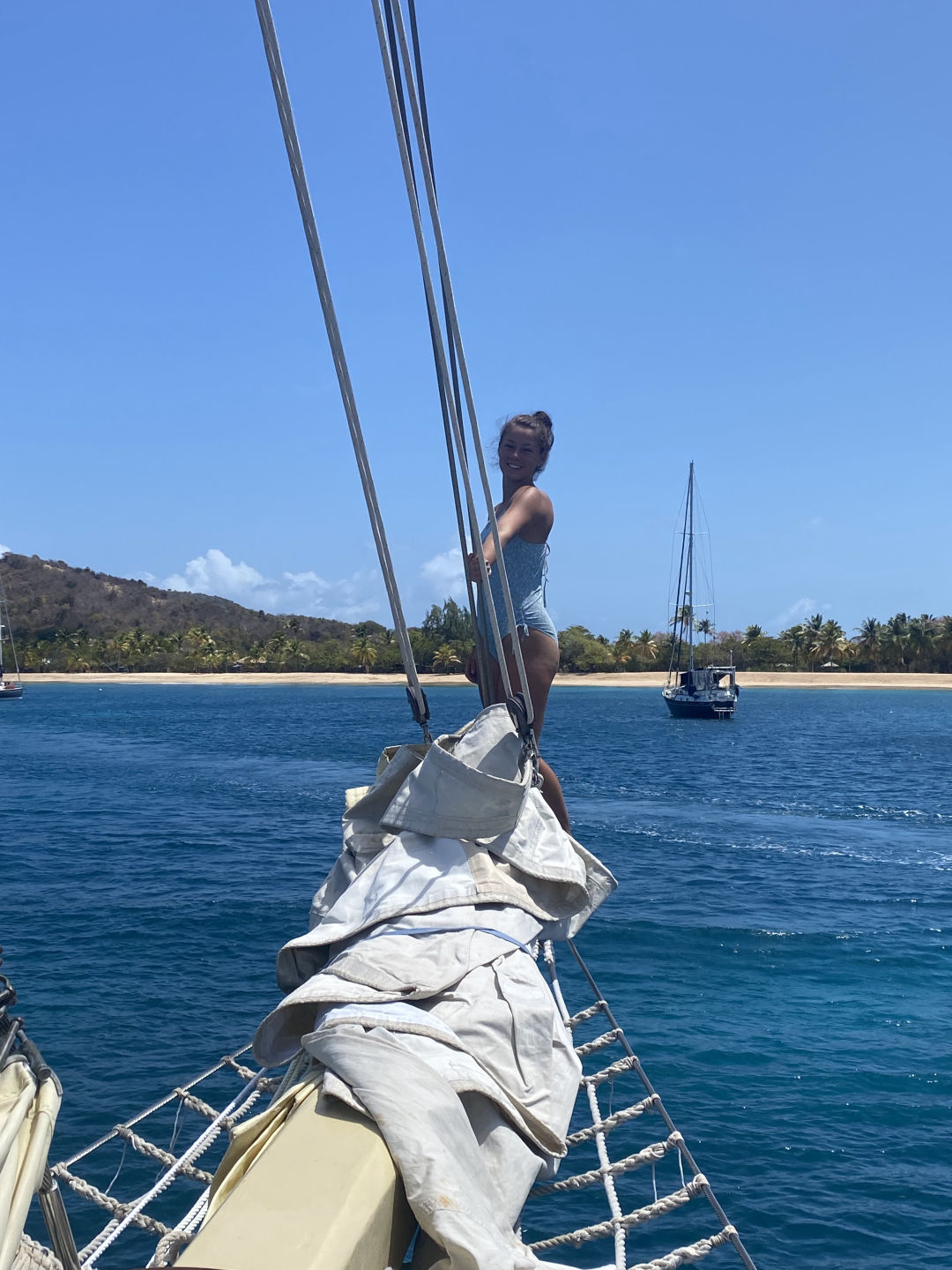 I read a couple of chapters in my book before thinking that I should reapply sunscreen. After a while, I decided to take a shower and finish the rest of the passage prep by hoisting the dinghy and making sure it was secure. Soon enough, it was my time to shine. I beat Doran in a rock-paper-scissors battle to see who got to go up the mast to fix the radar, and I won! I was hoisted all the way up to the second spreader. I’ve been in a bosun’s chair before, so I knew what to expect, but it was a serious challenge. Luckily I’m not afraid of heights, but wow, I was way up there. I could see the rest of the island to the water on the other side. Once I untangled the line, I had to do a Spiderman-type maneuver to get to the other side of the mast to avoid getting my secondary line caught on the spreaders. It was a serious leap of faith. After making it all the way back down, dinner was basically ready. We ate enchiladas and then got ready to watch our leadership movie, “Passengers.”