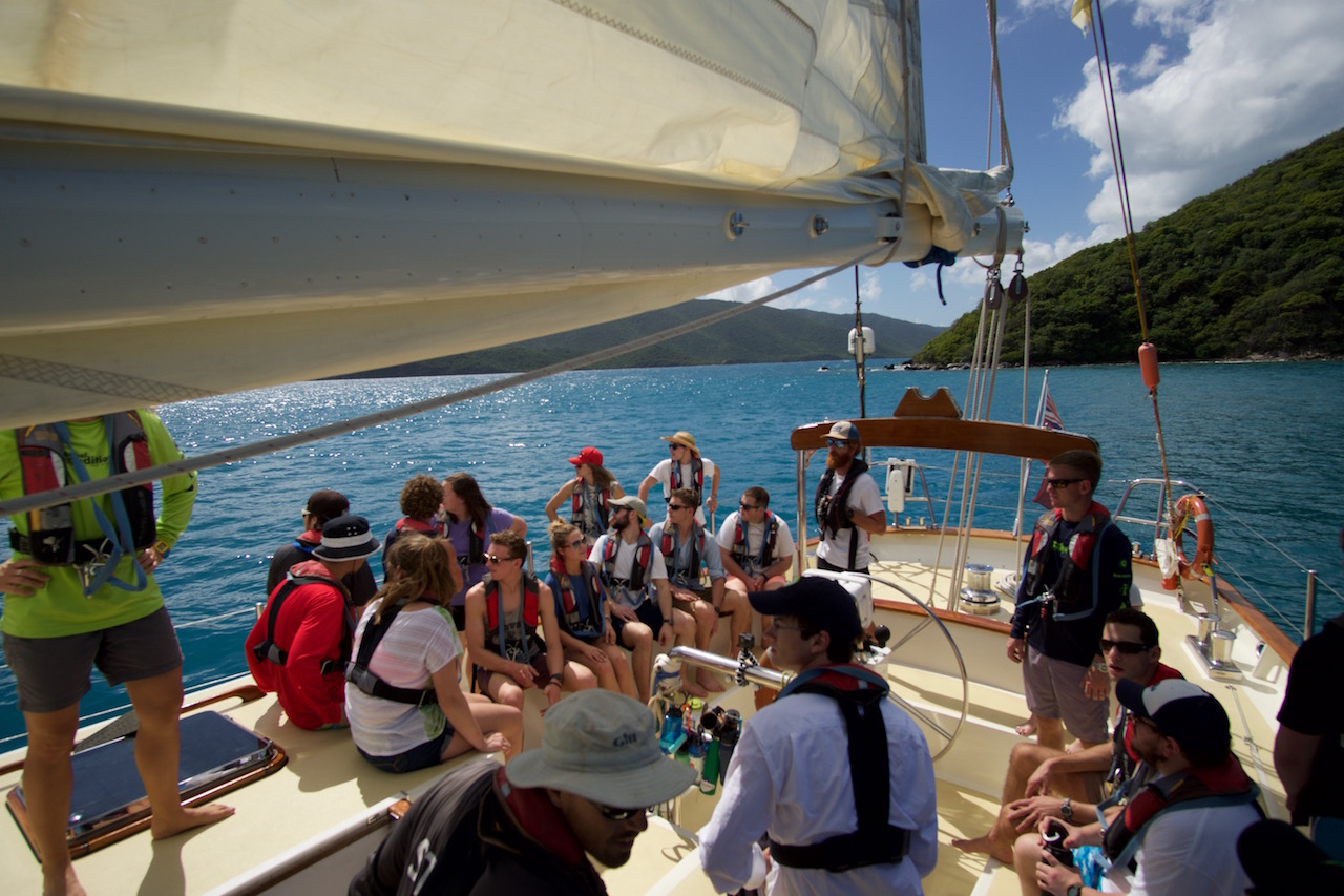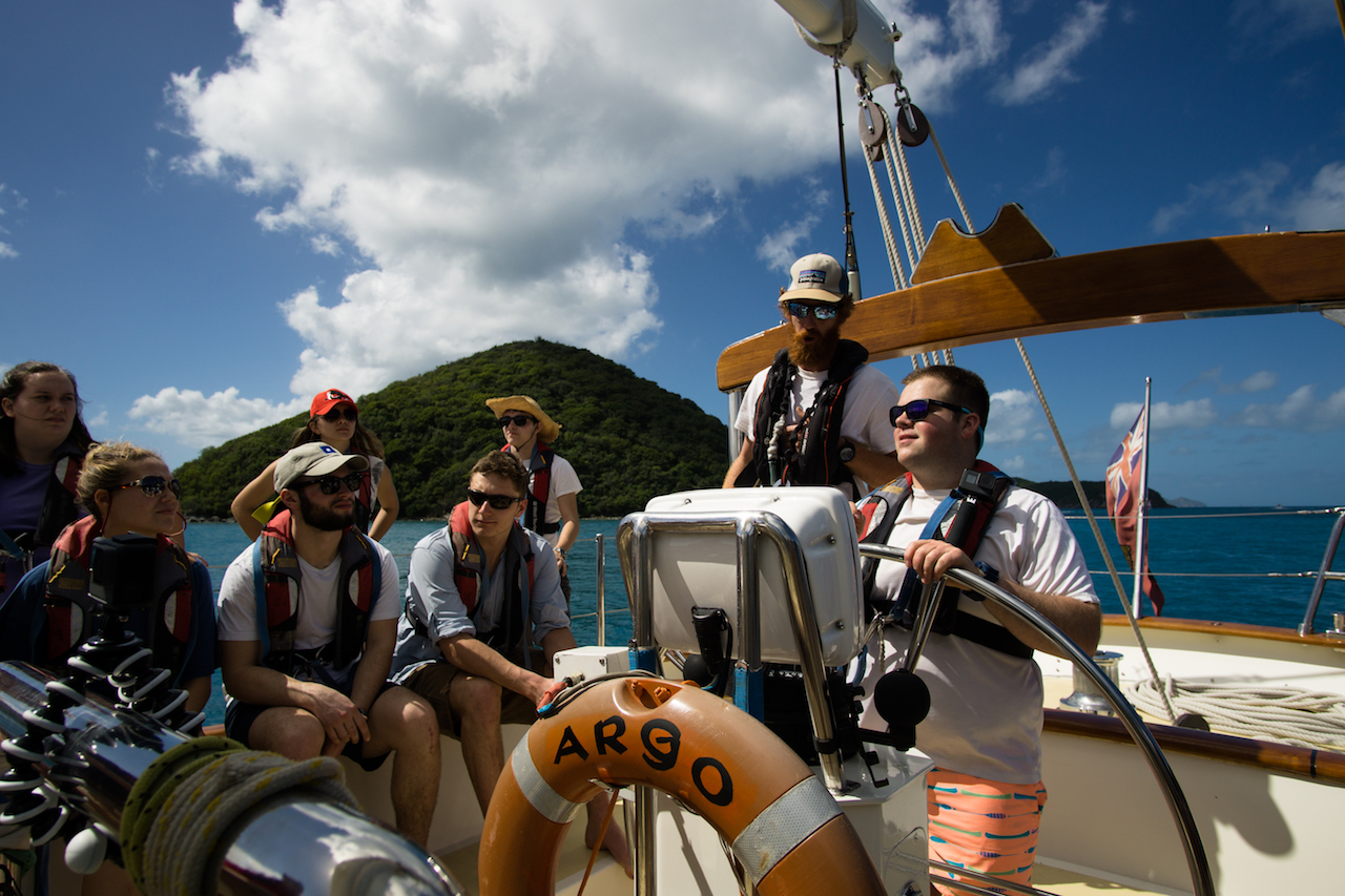 The students were spread along the dockside edge of Argo, holding ropes and bumpers (fenders, as the English Ben said [there was also talk of the letter ‘Zed’ from Ian]), preparing for our first nautical act: Then the ropes were hauled aboard, and the fenders were in and the ship was turning slowly in the turquoise water facing out between an insurmountable field of sailboats. Ben guided the ship precisely between the boats, and about 100 yards away from the tan cliffs of a nearby island, we came to a stop and hoisted the mainsail.