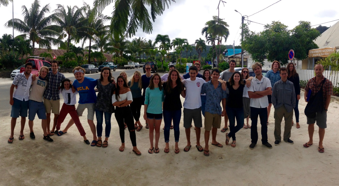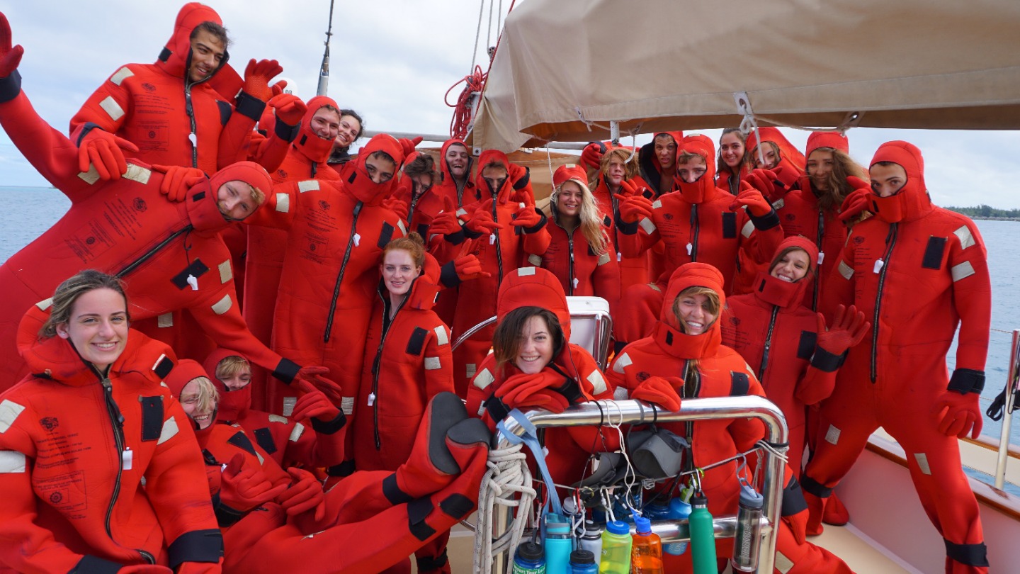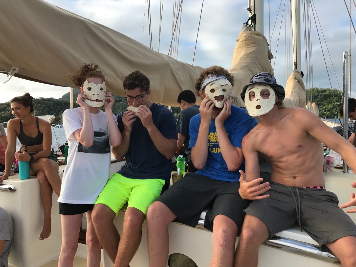 Today we woke up to a Bora Bora sunrise, complete with the sounds of the ever-crowing roosters floating on the breeze. After a breakfast of burritos, a few creepy tortilla masks, and our marine bio and seamanship classes, we began preparing the Argo for our next passage. To further our readiness, we all drilled suiting up in our survival suits, which were, for the most part, extremely sweaty, although looking like a crew of Gumbies was fairly amusing. This evening, around 16:00, we sailed out into the rain to begin our passage toward the Cook Islands. Eventually, the rain subsided, leaving us with a beautiful view of the thick blanket of stars. Keeping this update brief today due to the seasickness that a few of us are suffering from. Wish us luck with the next few days of our passage, and send your most stomach-calming thoughts our way!