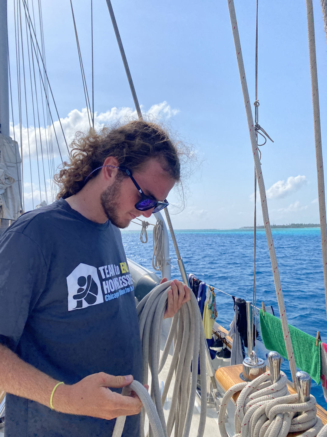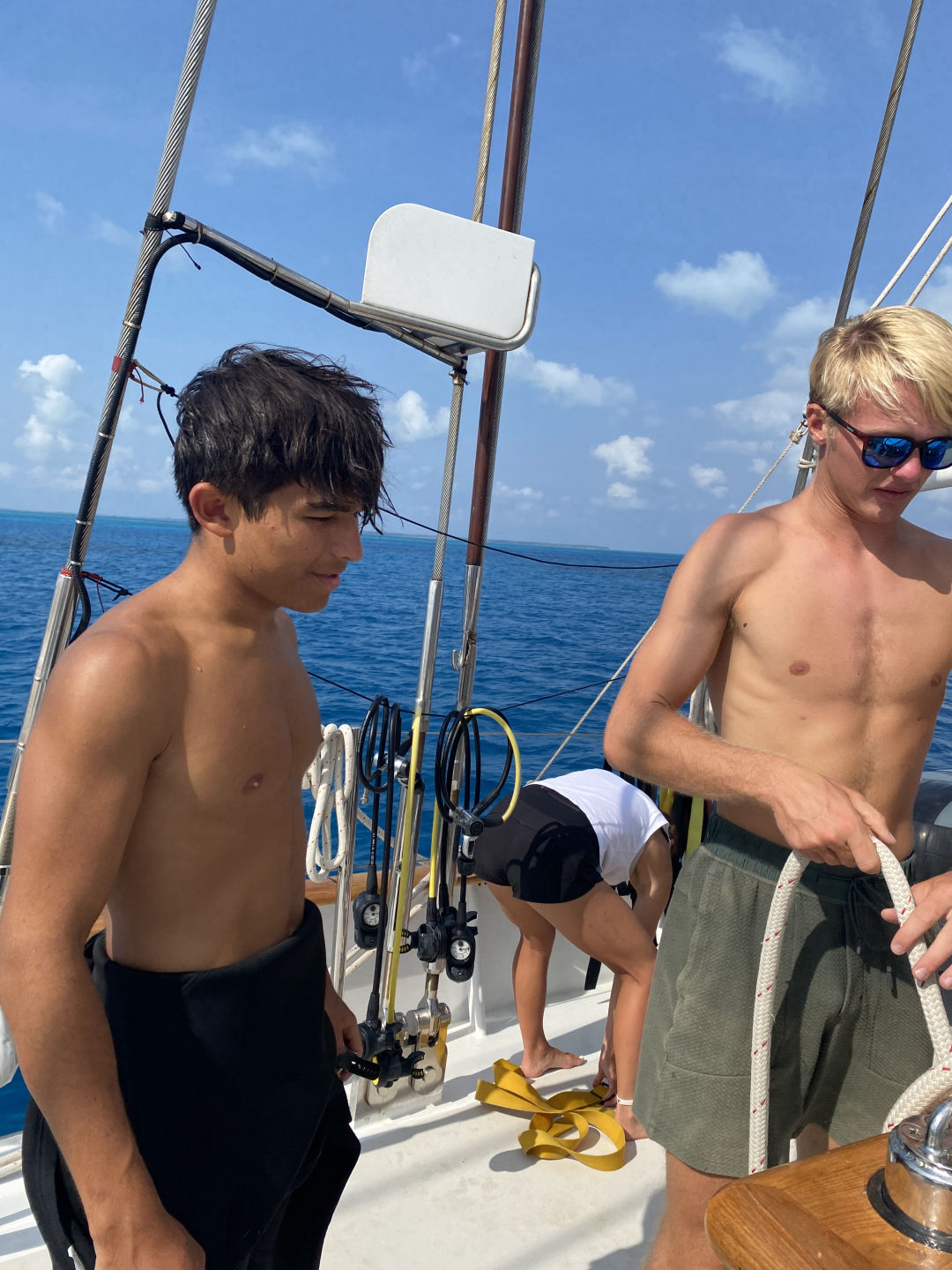 This morning, I hopped out of bed at 6:50 and went into the head to brush my teeth before I did wake-ups for everyone. I was still half asleep when I was plunged into darkness and heard a panicked whisper from Smash, who had turned the lights off and was saying she had been watching Steph and Wes dive but got distracted by dolphins and lost them, and I couldn’t find them. That was when I realized I was once again facing another simulated rescue diver scenario. I quickly ran out to put my bathing suit on and get upstairs to assess the situation. As soon as I was up the companionway, I was face to face with a dripping-wet Jackson who looked distressed. I put on my mask and looked for my fins and couldn’t find them, so I jumped in to help Steph(this was the exact opposite reaction I was supposed to have), who was a panicked diver screaming about sharks blinding her and how Wes was missing underwater. Eventually, Jackson and I completed the scenario and debriefed with our instructors, Steph, Jake, and the divemasters in training, Wes and Allie. Jackson and I received the feedback that they were impressed with how much worse our skills had gotten from last time and that we scored a 2/10 on our test — oops. After that ordeal, we all had breakfast that Audrey, our head chef for the day, made for us. Then, we began passage prep to get underway to Mauritius. Lucia took over my skipper duties of looking important and holding the clipboard to make sure we completed everything on our list before we left. While Lucia and everyone else prepared for passage, Jackson and I were pacing around the boat, anxiously awaiting our next scenario to strike. Eventually, Wes came up panicked, saying Steph was dead, and Jackson and I snapped into action to redeem ourselves. This time, we delegated jobs to bystanders, threw life rings, set our tanks up, and eventually brought Steph up and gave her CPR once we pulled her onto the dinghy. Our score? 7.5/10, much better than our previous debrief. After that, everyone had lunch, and we pulled up our anchor and “set sail” with very, very little wind. We all said goodbye to Cocos Keeling and watched as the last piece of land we would see for the next two weeks disappeared. The coolest part of saying goodbye to Cocos Keeling was the blue clouds above it. Since the island is an atoll, which we learned about in marine bio, the sand is so white that it reflects off the blue watercolor into the clouds. After a little while of being underway, Tom and Smash saw a whale breech which we were all a little suspicious of because no one else saw it. We had an Oceanography class where we took a quiz, which everyone was very nervous about. We later found out that the class average on the quiz was 105%. Then, we had leadership class where Ayden and Allie did their presentation and made us do a group activity that involved one person blindfolded, one with noise-canceling headphones, and the other who lost the ability to speak. Watch Team 1 kicked off watch after class, and then we had Audrey’s dinner of grilled cheese and tomato soup. We finished the day off with my squeeze question, which was, who are the persons to you rights celebrity look alike? Kasey got Randall from Monsters Inc. because she’s so scary to wake up for watch, Griffin got Big Bird due to his height and the stunning yellow foulie he wears on a crisp 75-degree night, I got Peppa Pig for an unknown reason, and everyone else got Shakira. We are all very excited to be underway to Mauritius and undertake our longest passage of the trip. Miss you, Mom, Dad, and Skye!!!!