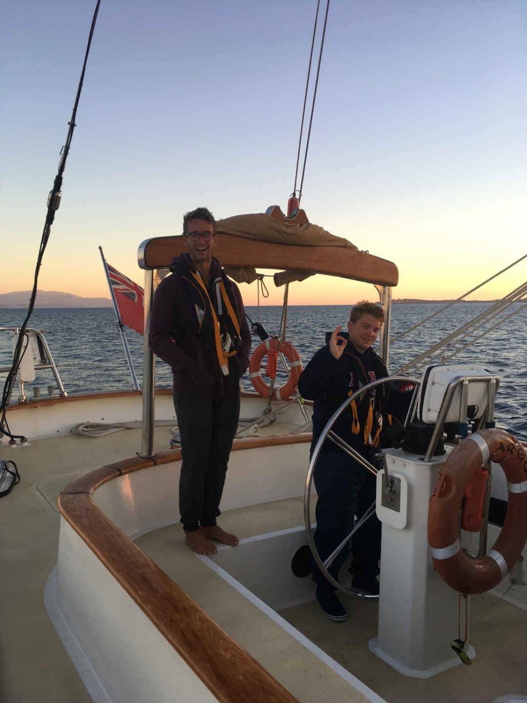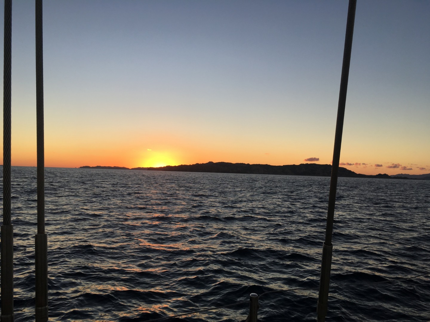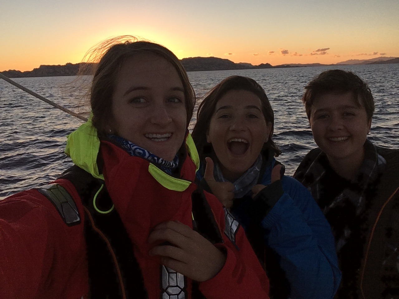 Pictured: Lex, Tait, and Ev at sunrise; Tim and CJ guiding us into the harbor in Sardegna; Cole helping get dive gear out of the laz; sunrise as we approached our anchorage in Sardegna.