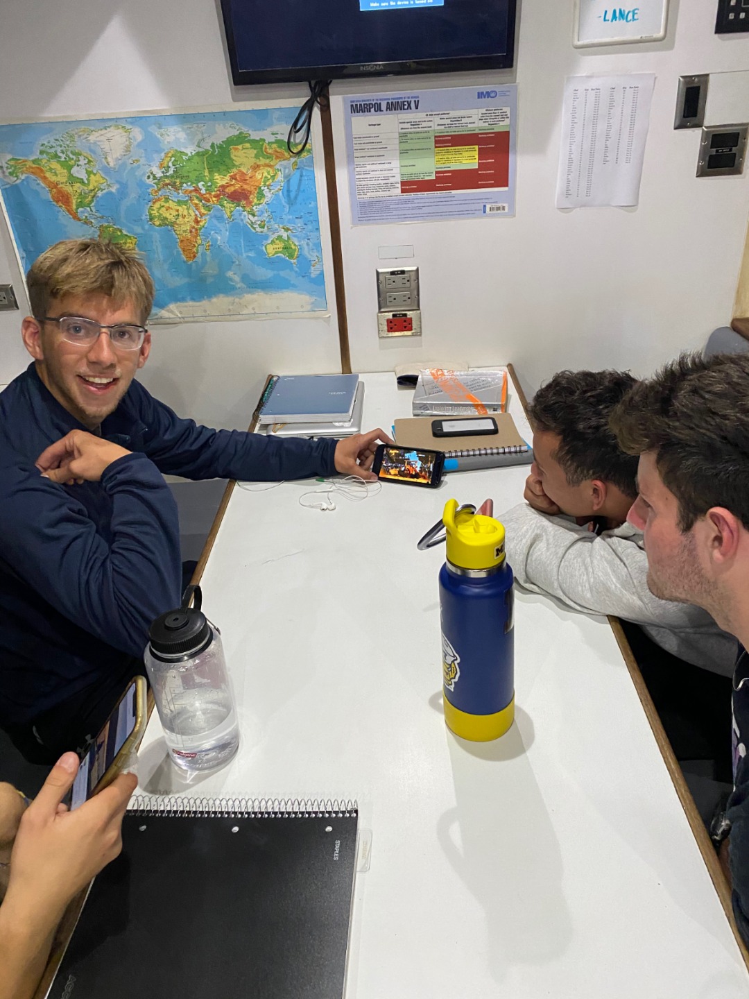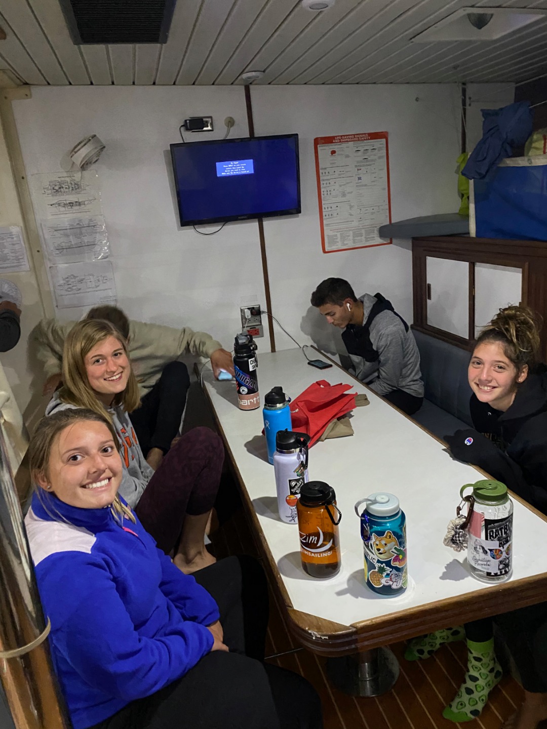 After a cold night of anchor watch, we woke up at 7:00 am for some granola and yogurt. After breakfast, we had a great time with leadership class and oceanography. Thinking about what the qualities of a leader are, and then taking in a ton of information about giant squids and how a group of scientists got footage of them even in the very darkest parts of the ocean. After class, we relaxed for a bit while the chefs slaved away, making some of the best quesadillas you will eat. After everyone had eaten, it was time to learn about the boat. Since we are putting our sails up for the first time tomorrow, we had to make sure everything was in order, and everyone knew what certain lines (lines are ropes but for sailors) did. After a lot of tying and untying of knots and tying and untying of knots again, we were set into groups that we’re each responsible for certain lines or sail covers. We learned about pin rails and the ways to secure knots on them. We saw the blocks in action, and we moved the running backstays from near the cockpit to the pin rails. One group even flaked the fisherman’s sail to stow below deck since Argo has 6 sails, and not all are needed at all times. Argo was almost ready to sail, so we headed down below to get a start on the many papers that we need to write. The main culprit was the leadership autobiography paper that needed to be done in 9ish days, so everyone got their laptops out and started writing away. Time was flying, and soon it was dinner. Those chefs I mentioned earlier hit gold again with their delicious rendition of paella. After we cleaned up from dinner, we had a short scientific reading and writing tutorial and then hung out until it was time to go to bed and then wake up in the morning for anchor watch. Then we can get ready to finally sail tomorrow.