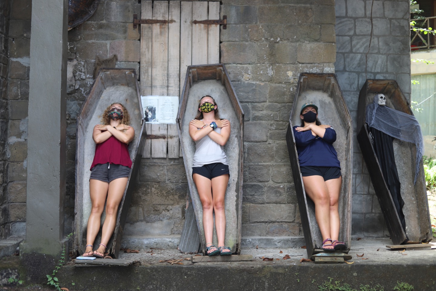 Photo 3: Sonnet, Maddie, and Mack in the coffins at the Pirates of the Caribbean beach
