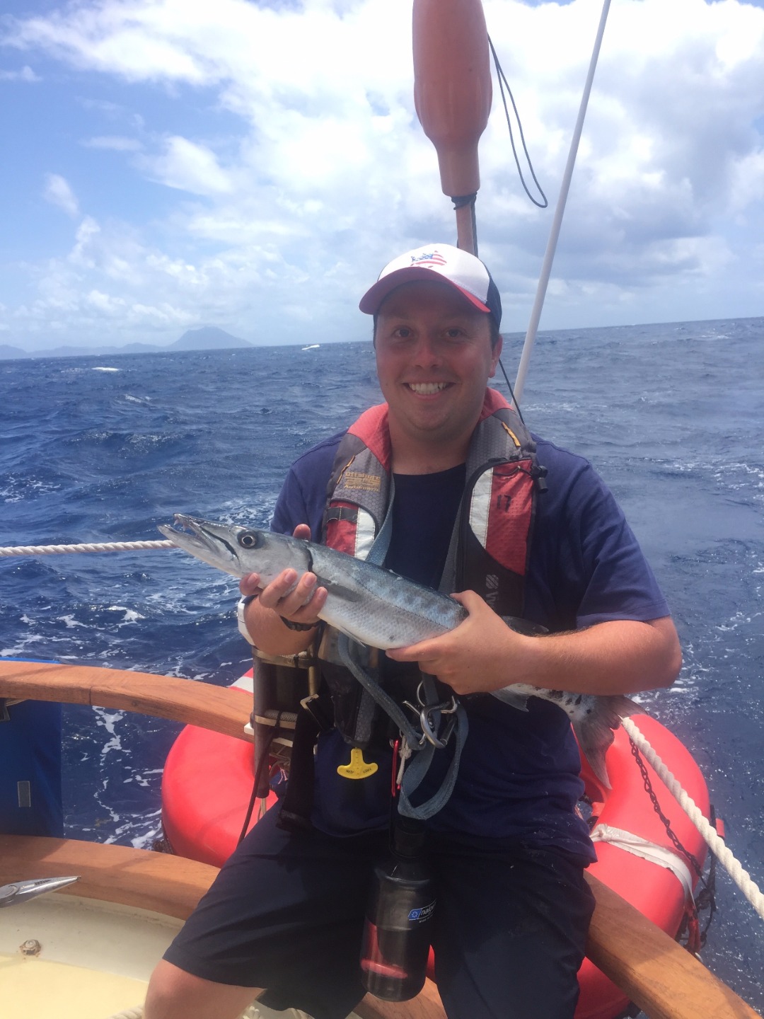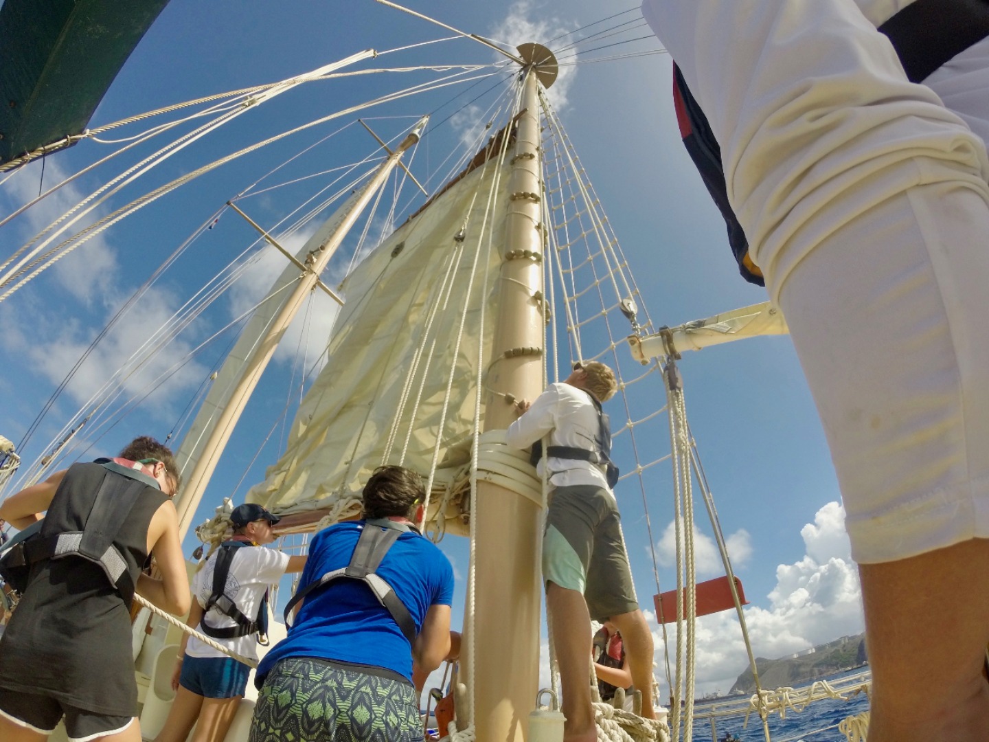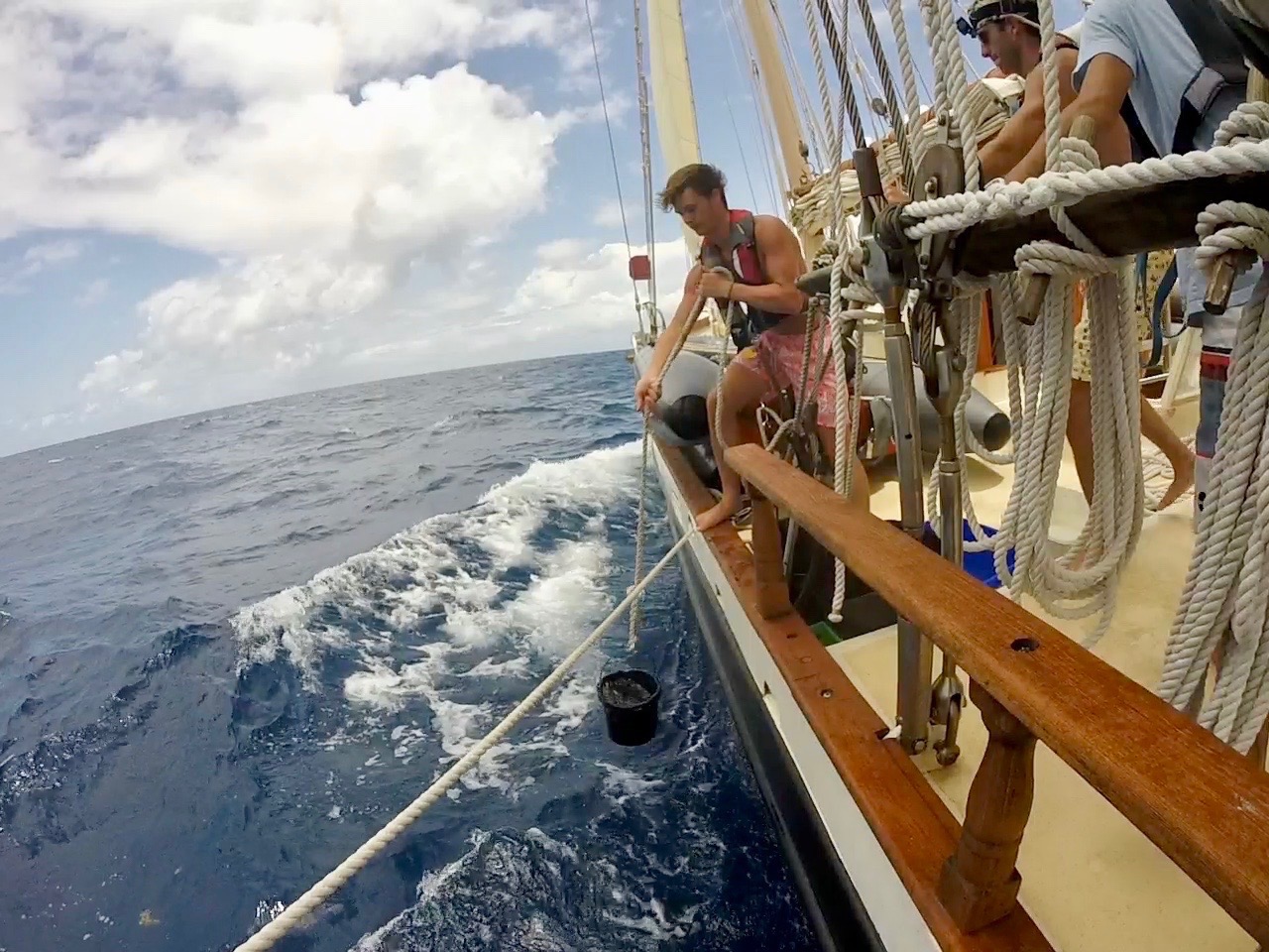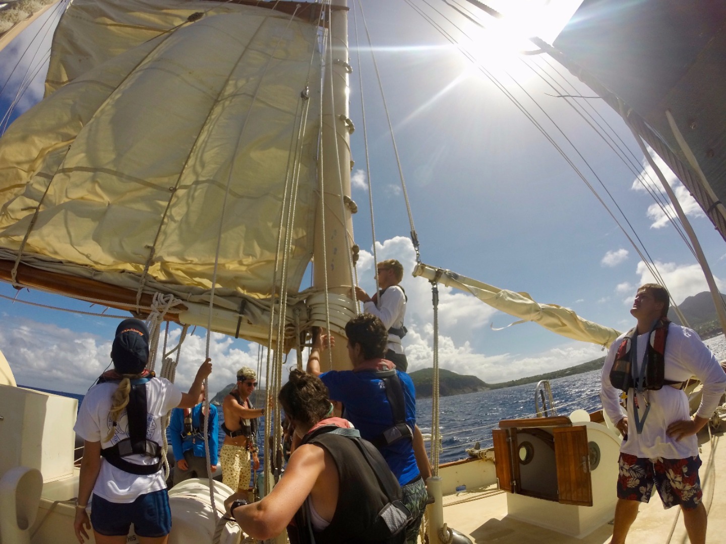 Waking up at seven, we brushed our teeth before heading up on deck for breakfast, where the lovely Emily had prepared a splendid breakfast quiche for us. We then began to sail. The sail from Statia to Saba was long and arduous, but alas, we made it out alive (just kidding, it was actually a lovely, smooth sail for the most part). We got hit by a small squall on the way out of Statia, but after the rain had passed, the sailing was calm. We arrived a quarter of an hour after lunch had already taken place underway. The heat was particularly potent, and we were all tired after putting the boat away. So when the call for shower time came, it was like Heaven’s bells were ringing in the air. “Cleanliness has never been so well received by adolescents,” I thought to myself. We all jumped off the boat happily, another end to a great day. Later, we will have some class and a quiz, but right now, I am just happy to hop in the ocean again!