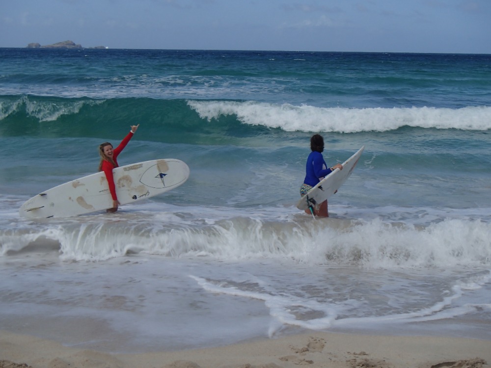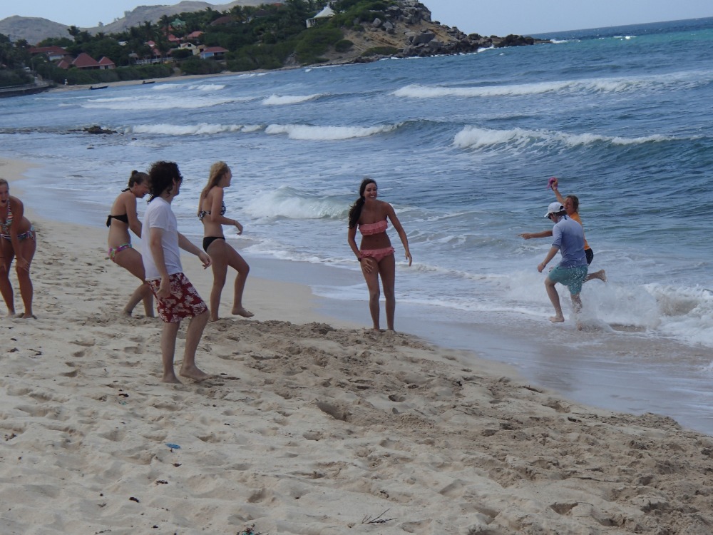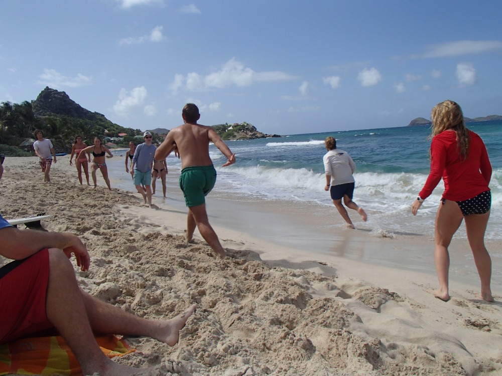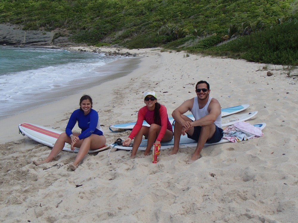 It was yet another beautiful morning waking up onboard Ocean Star. Some of the surrounding boats had begun to make way by 5 am, but we still had one more day to play in Saint Barths. After breakfast, we loaded up the dinghy, and within a few trips, we made our way to town. Today was a beach and surfing day, so crew member Emma rented a minivan to transport us all around town. We first went to the surf shop to rent our surfboards, and then we made the trek across the island to the beach! Once everyone arrived at the beach, we waxed the boards up, leashed up, and began to paddle out! The waves were decent, and we all got a few good rides in. Most of all, we had fun! When taking breaks from surfing, we ate some lunch, lazed around in the shade, and played some awesome games in the sand. It was a great day by the water, and the sights at the beach were gorgeous. Whenever we were ready to leave, we loaded up the boards to take back to the shop and made a few trips back to Ocean Star in the dinghies. Dinner was being prepped, and it smelled delicious! It was Mexican night onboard, so we had chicken, beans, and rice. YUM! Tomorrow we are sailing to Nevis, so passage prep is being done tonight. We will leave early to arrive there at a decent hour!