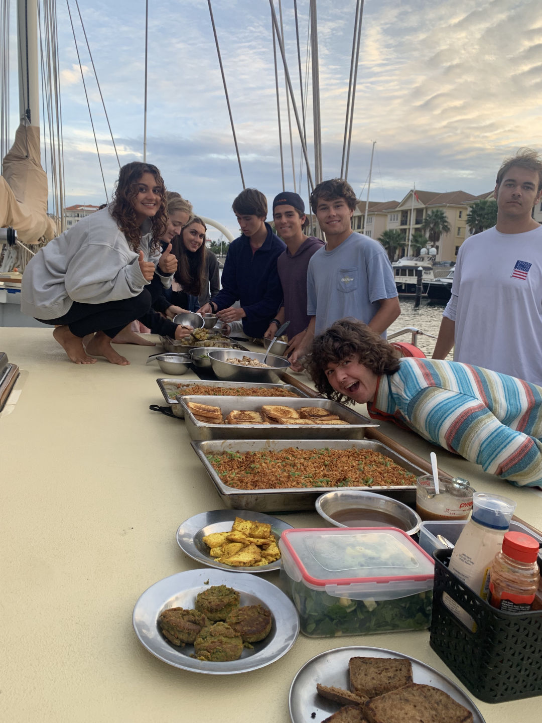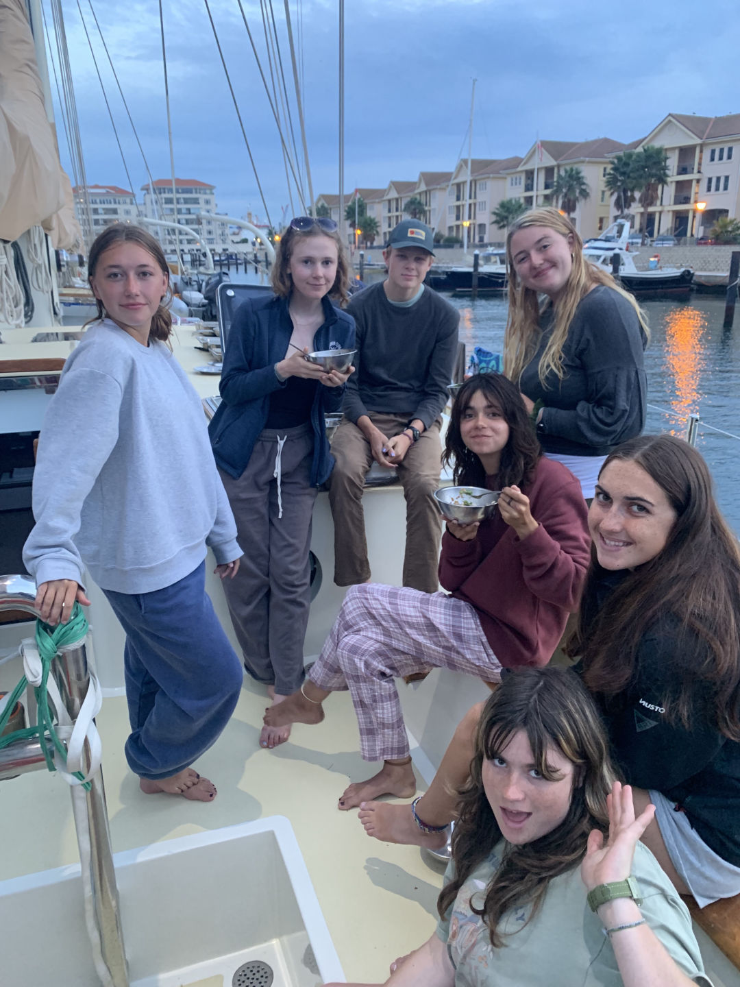 Before I went to sleep last night, my watch team (Watch Team 2) finished our watch listening to Percy Jackson on audible. At midnight, FiFi and I woke everyone from Watch Team 3 up and then danced to Rihanna in the salon with Daisy before going back on deck. I love my watch team! Joe bought us all chocolate, and Del made us cookie dough to share. At 8 a.m., we were welcomed back on watch by a pod of dolphins riding the wake of the bow. It was so exciting and one of the coolest things weve ever seen. Caroline was psyched! We were able to see the pillars of Hercules at the edge of the Strait of Gibraltar, which was amazing because it was a panoramic view of both Morocco and Spain. After lunch, we put the boat to bed by taking down the sails and putting on sail covers. Youll always find me on the Main Staysail. Its my favorite. Before pulling into the Marina in Gibraltar, we had Marine Bio with Anna, then had a little time on shore. I enjoyed being on shore in Gibraltar and am excited to explore more of the city!