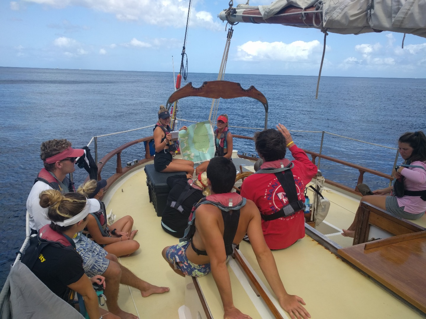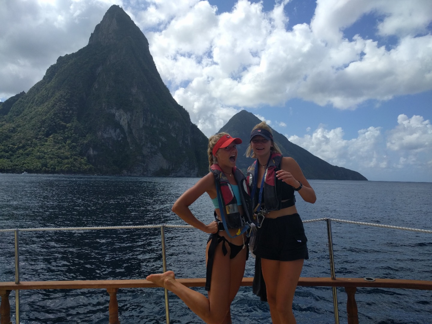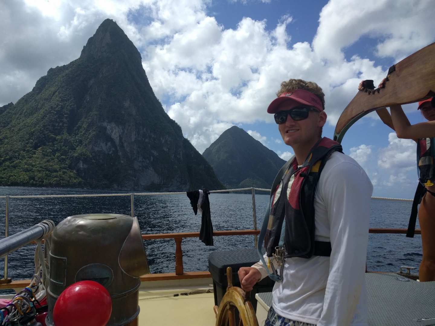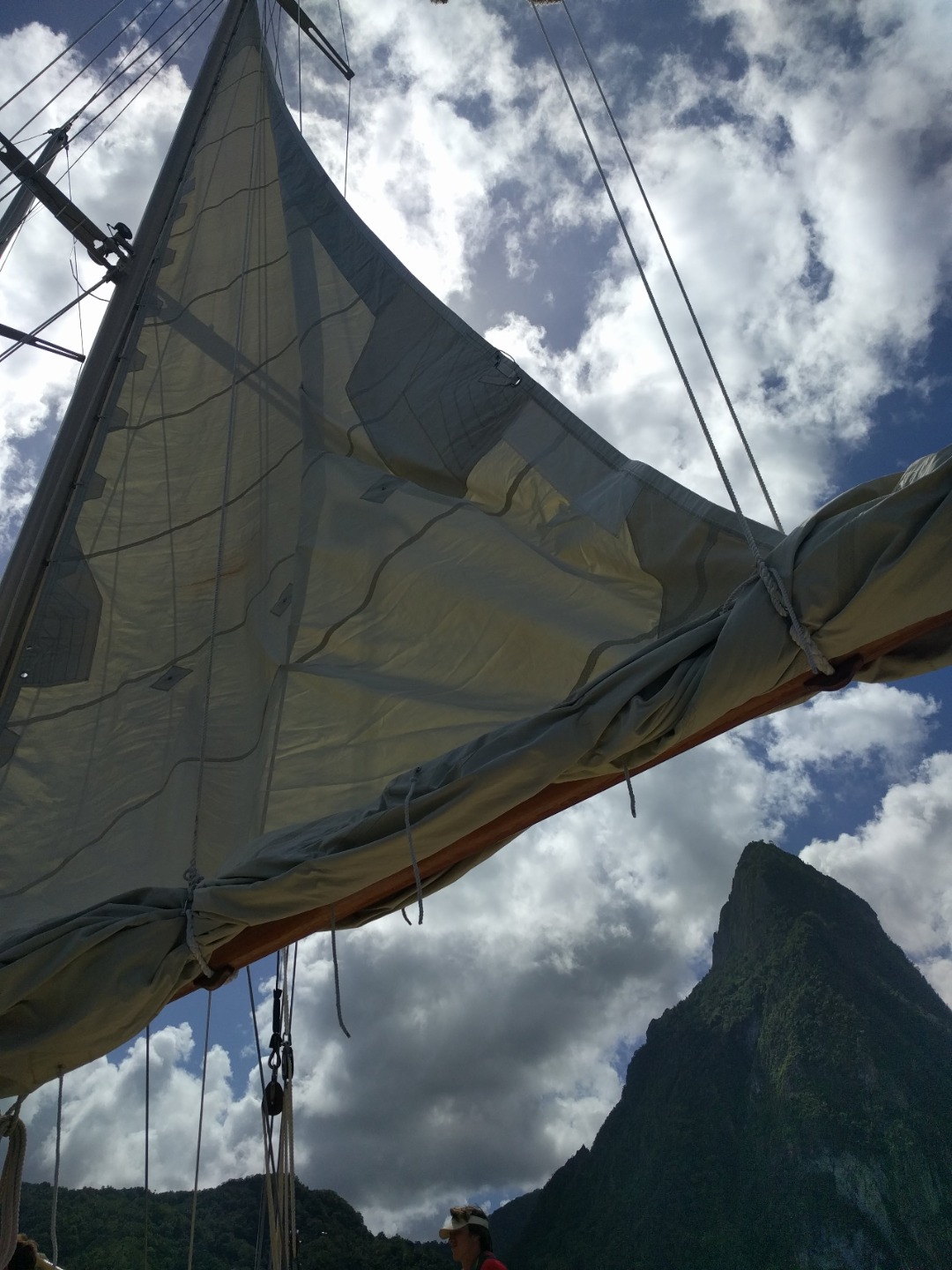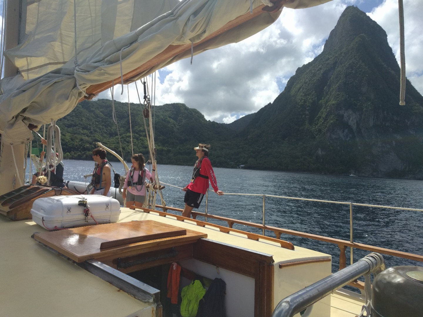 Wake up was a little bit late today, 7:10: sweet potato hash and sauted veg and eggs with hollandaise sauce for brekky. Swiftly moved onto sail training with Ian M, and today, we, the students, ran sail training ourselves. Staff was in the chart house for this one, meaning I had the job of delegating the work to others and rallying the crew to sail for ourselves. All of this was done under the watchful eyes of Ian M, but he tried to step back and let the students become masters today. We had to form our first passage plan on our own, and we planned to leave at 9:30, but left at 9:30…. ish, meaning 10:30. This was tough on me because there was little guidance on how long it would take to get rolling, so the ball was in my court per se. The wind was very unpredictable today, forecast told us one thing, it did just about the exact opposite, so the sail trim was constantly being adjusted, thus preparing us for a Classics week dub (a dub is a win or a W in the win/loss column for all those needing translation back home). We pulled up to this beautiful place known as Marigot bay to call home for a couple of days, and it is amazing here. Mom, Dad, if you don’t hear from me for a while, I’ll be here. I’ll take this time to shout out my grandma, love you, Lorelei. When we got here, we were unsure of our final destination, mooring, anchor, or docking, which threw us for a little loop. We ended up docking because our usual mooring was occupied. The bay is very narrow, so it was tough navigating in here with all the other big ships around here, all doing their own things as well. We finally made it to the promise-land.